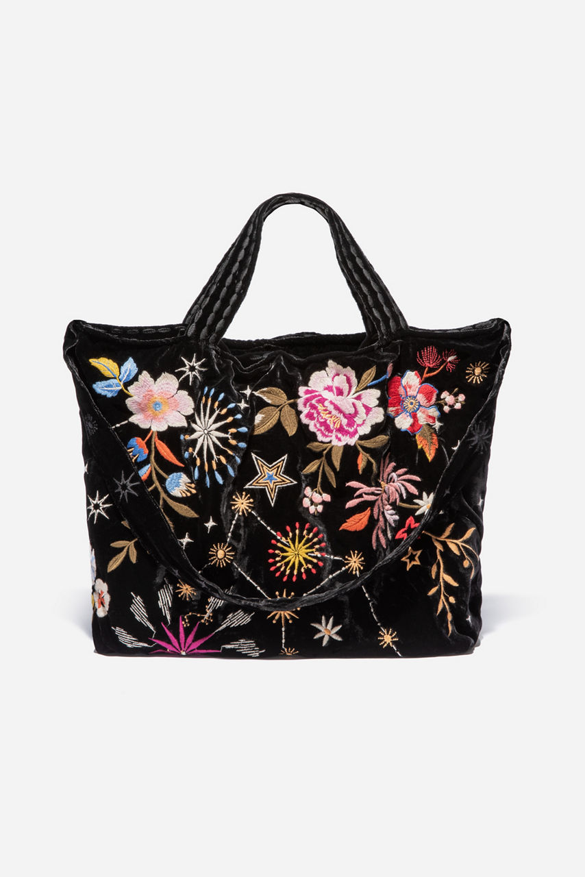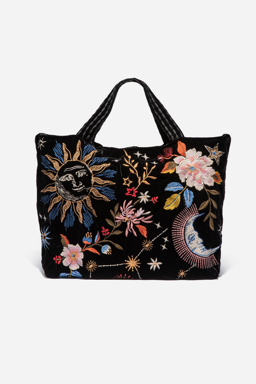 Our Celestin Velvet Tote Bag is the perfect accessory for our Bianca Velvet Maxi Dress or our Campana Cropped Straight Jean. This colorful tote bag can pair just as beautifully for an evening get-together as it can for a day spent shopping with friends. The beautiful floral and celestial embroidery add interest to any outfit. Roomy, practical and dressy all describe this lovely tote perfectly.