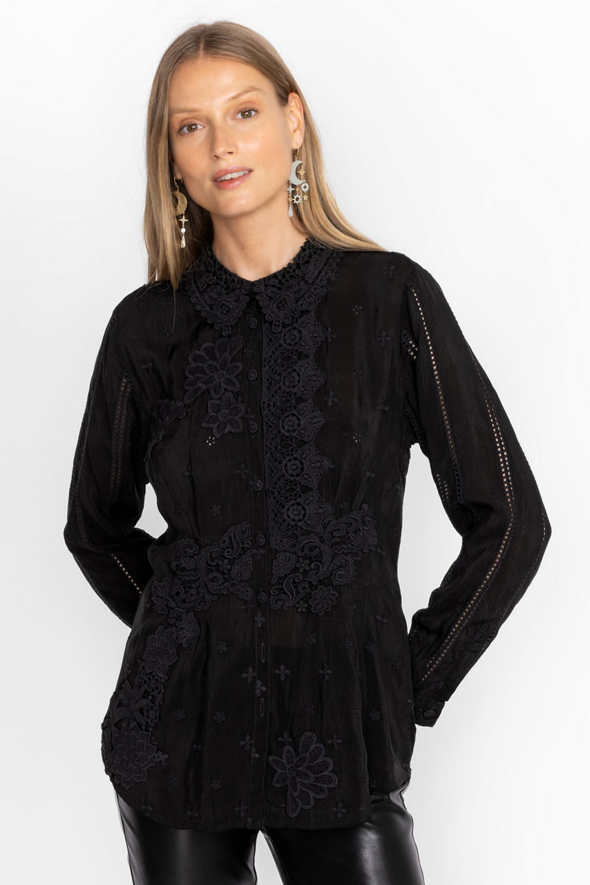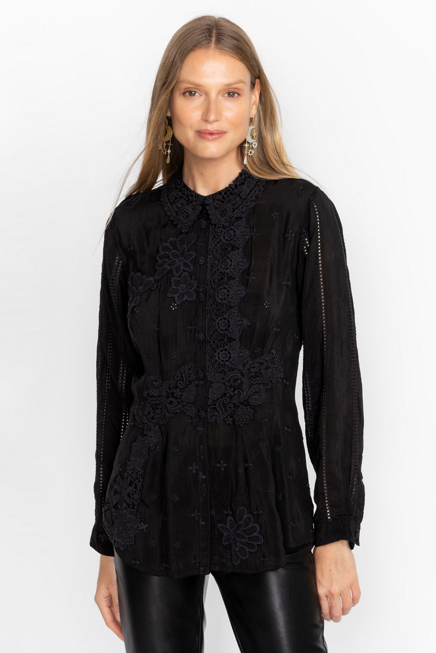 Offering a luxurious upgrade to a traditional button-down blouse, the Celia Applique Shirt adds delightful crochet applique for a beautiful result. Meticulously detailed with thread-covered buttons and attention to every detail, this blouse is the answer to modern workwear. Pair with slacks and an open blazer for a polished work ensemble.