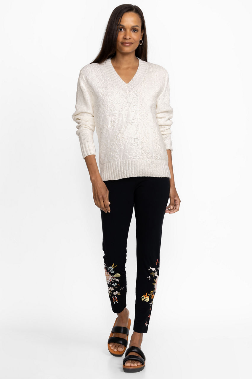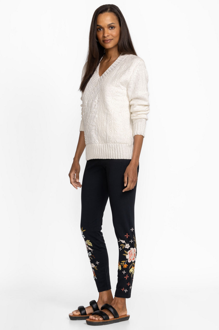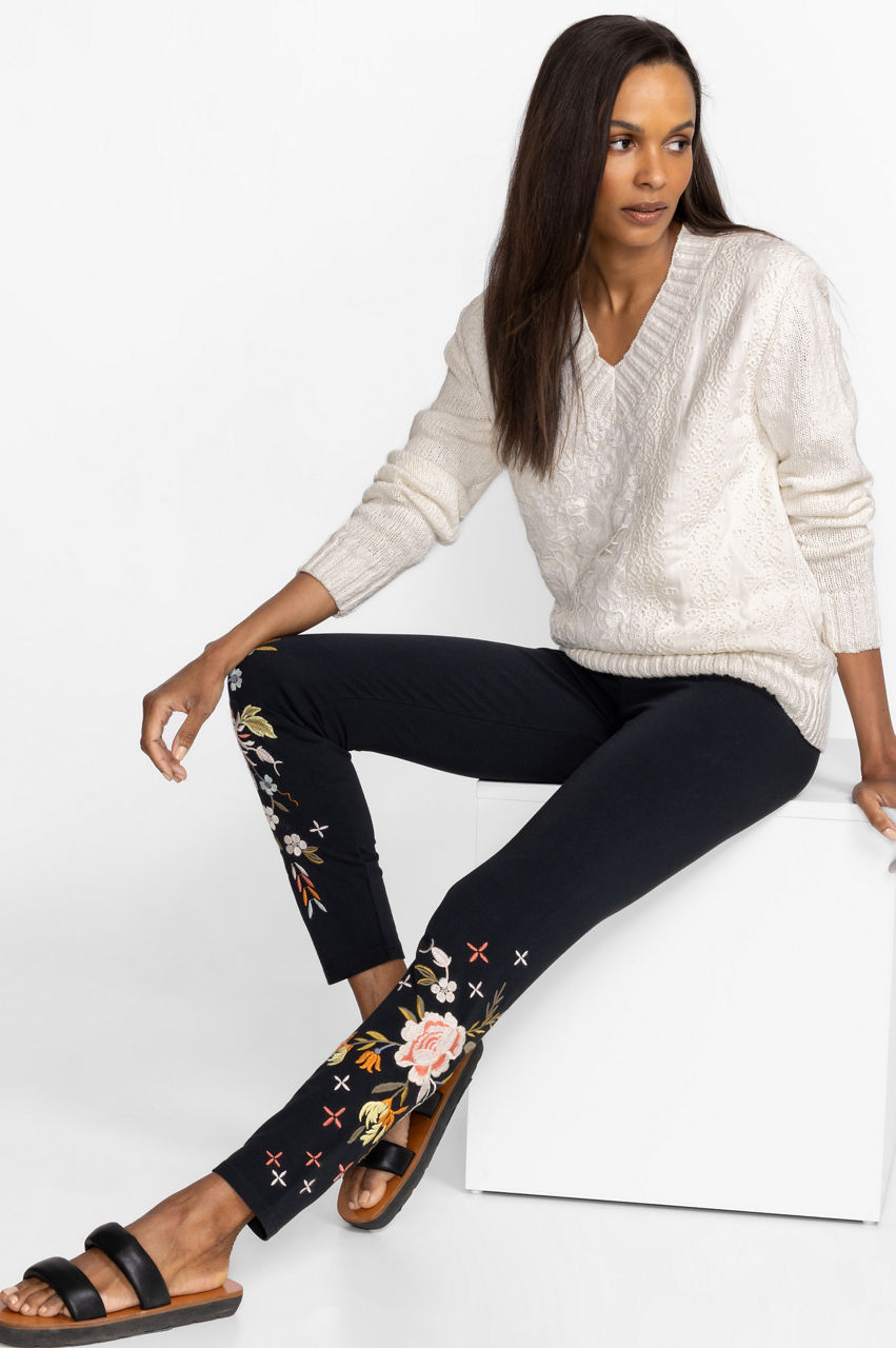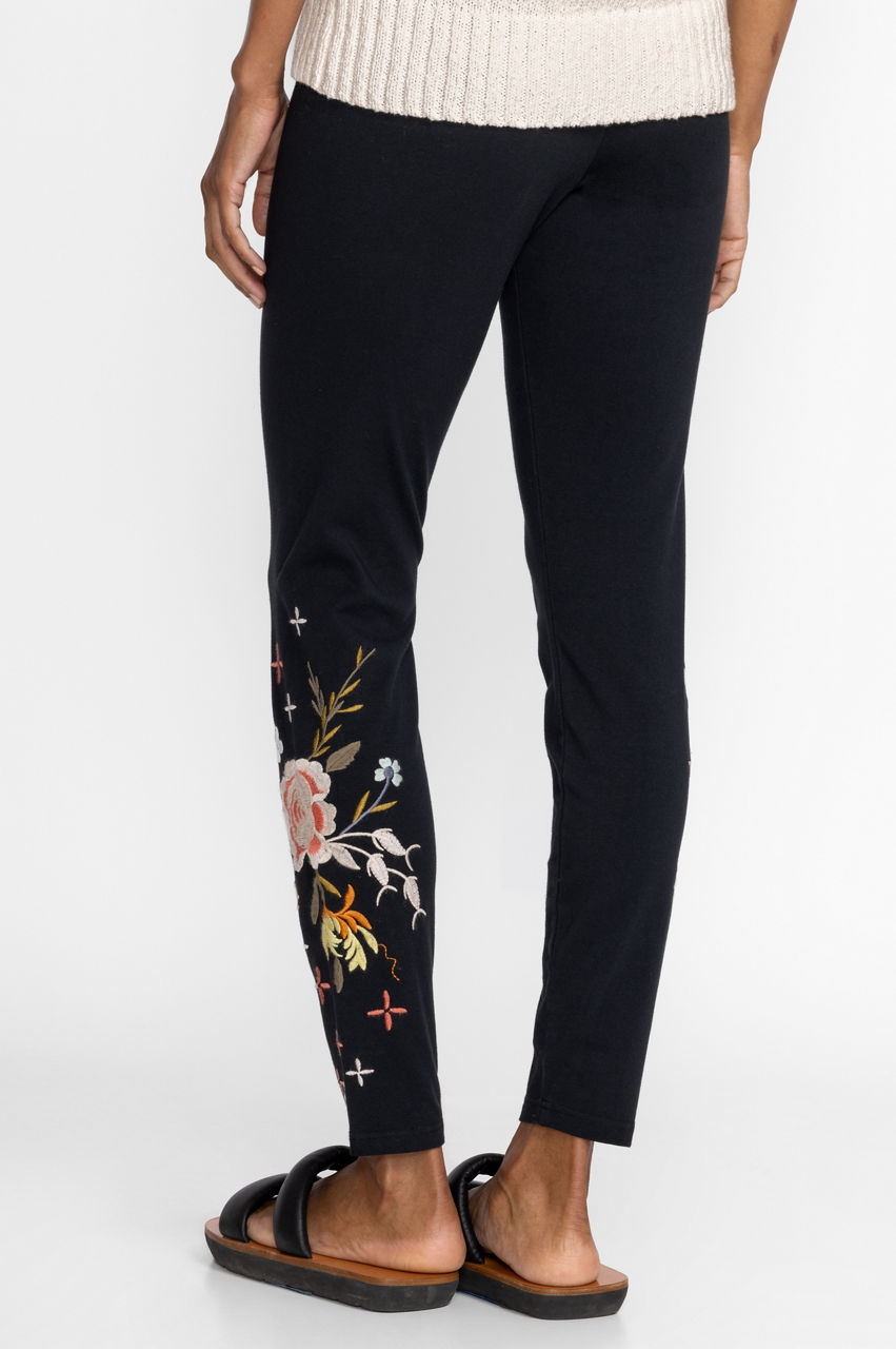 Classic black leggings with a unique twist, the Ceretti Leggings offer a wardrobe staple that is a step above the rest. Providing breathable cotton-based material combined with a touch of stretch, these leggings feature delicate placement embroidery in a stunning floral pattern. Pair with a white oversized button-down and classic sneakers for an updated casual grouping.