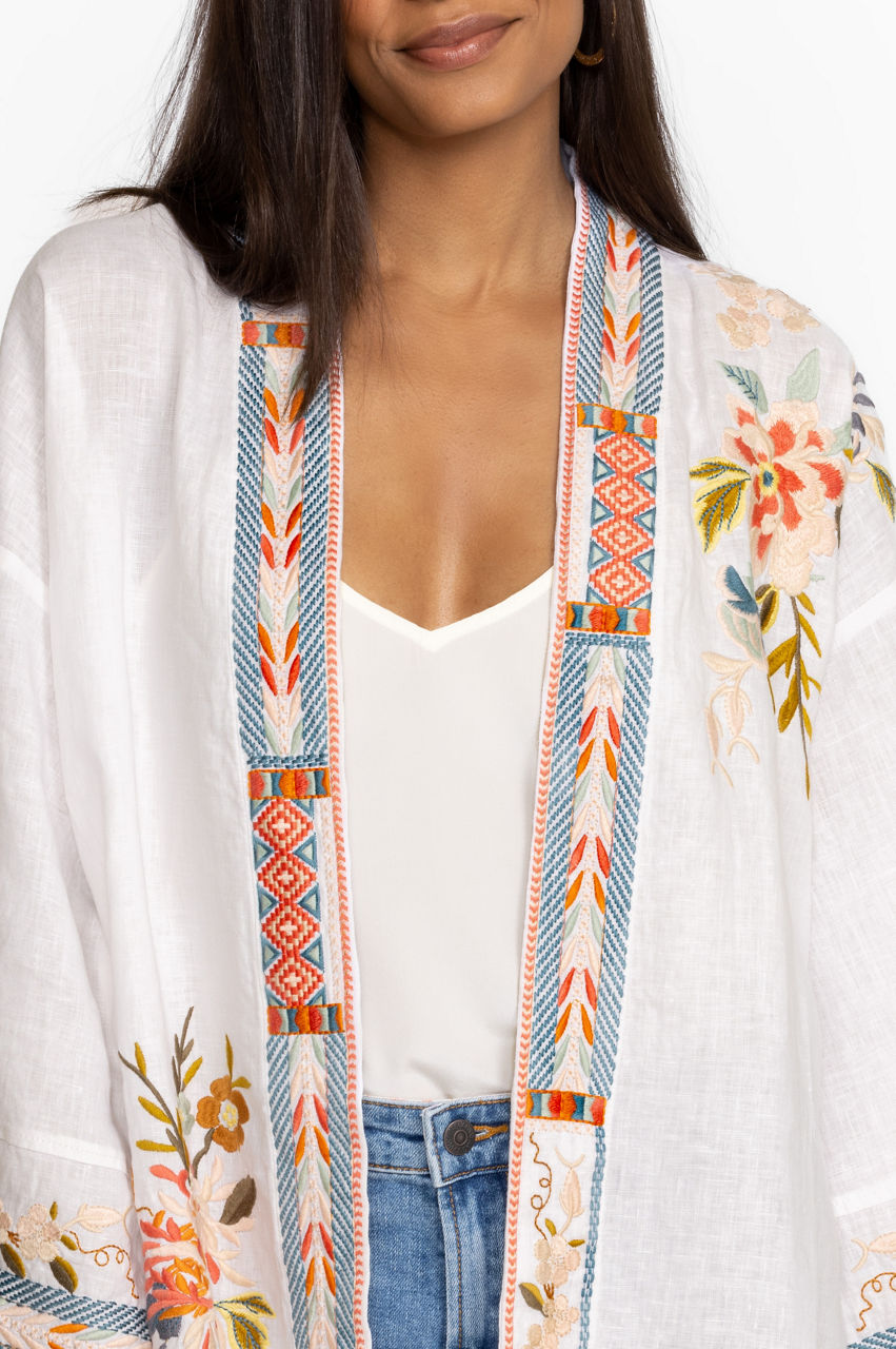 Refined and classic, the Ceretti Linen Cropped Kimono is an easy silhouette with instant appeal. The image of timeless sophistication, this kimono is crafted from durable linen and adopts a blue color scheme complete with a floral placement embroidery in contrasting colors. Finished with an open front and long sleeves, this kimono can be worn with a silk dress or styled with denim for a pared-back ensemble.
