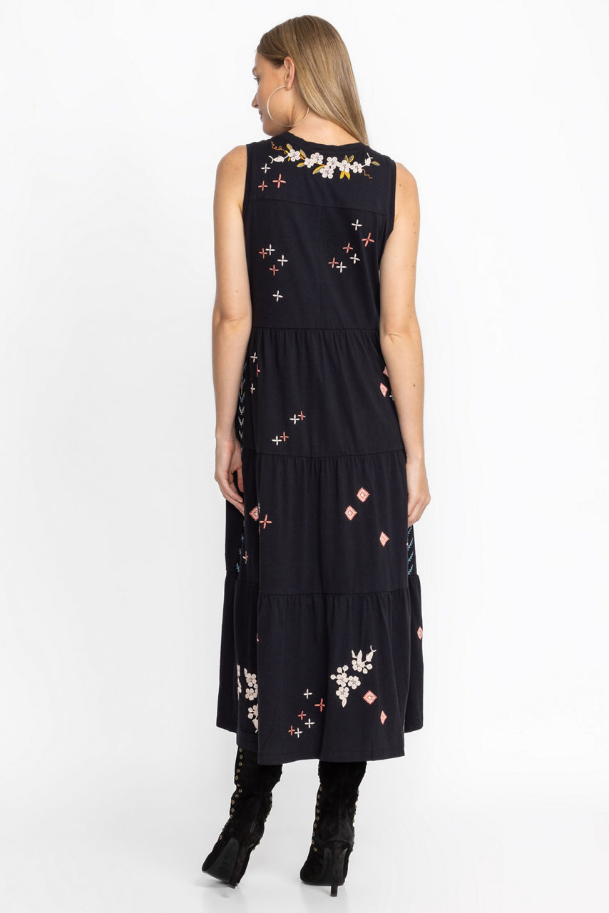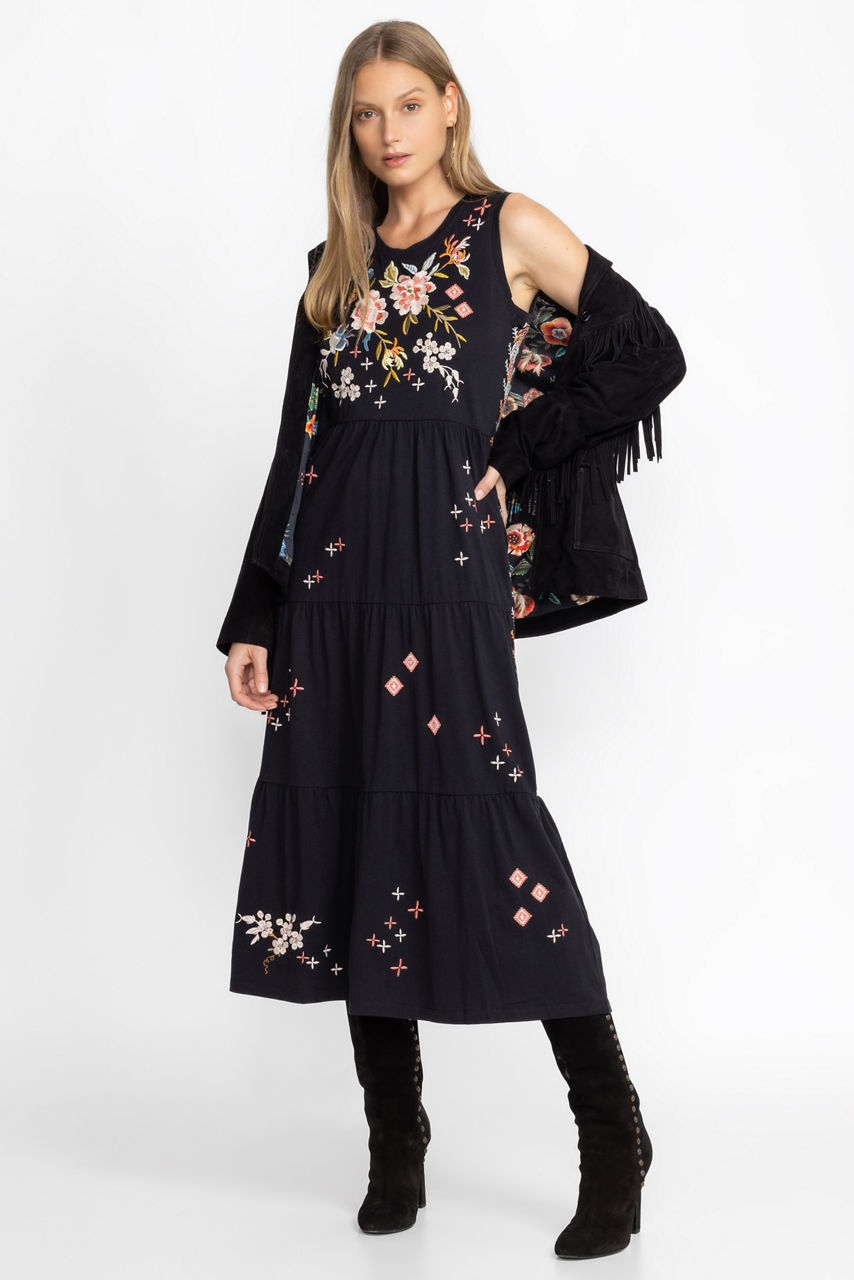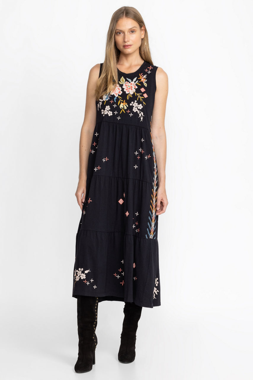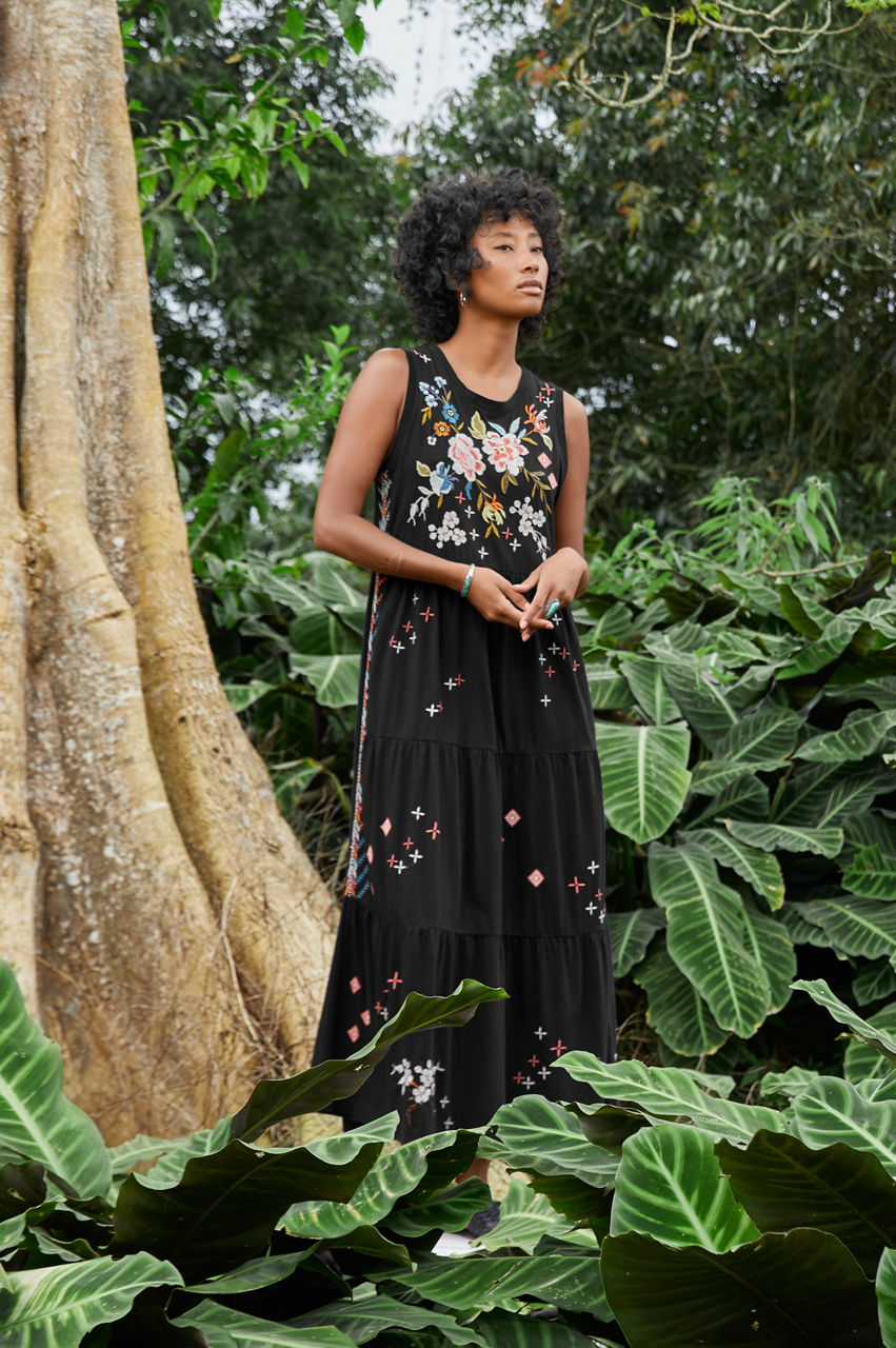 Framed with a round neck, the Ceretti Tiered Maxi Tank Dress encapsulates a sense of nonchalance thanks to its easy tiered shape and freshly-cut flowers. Falling to a maxi length, this tank dress is made from breathable cotton with practical pockets, and a vintage floral placement embroidery. Pair this maxi dress with neutral accessories for a lively yet versatile warm-weather look.
