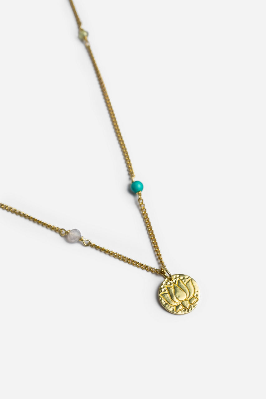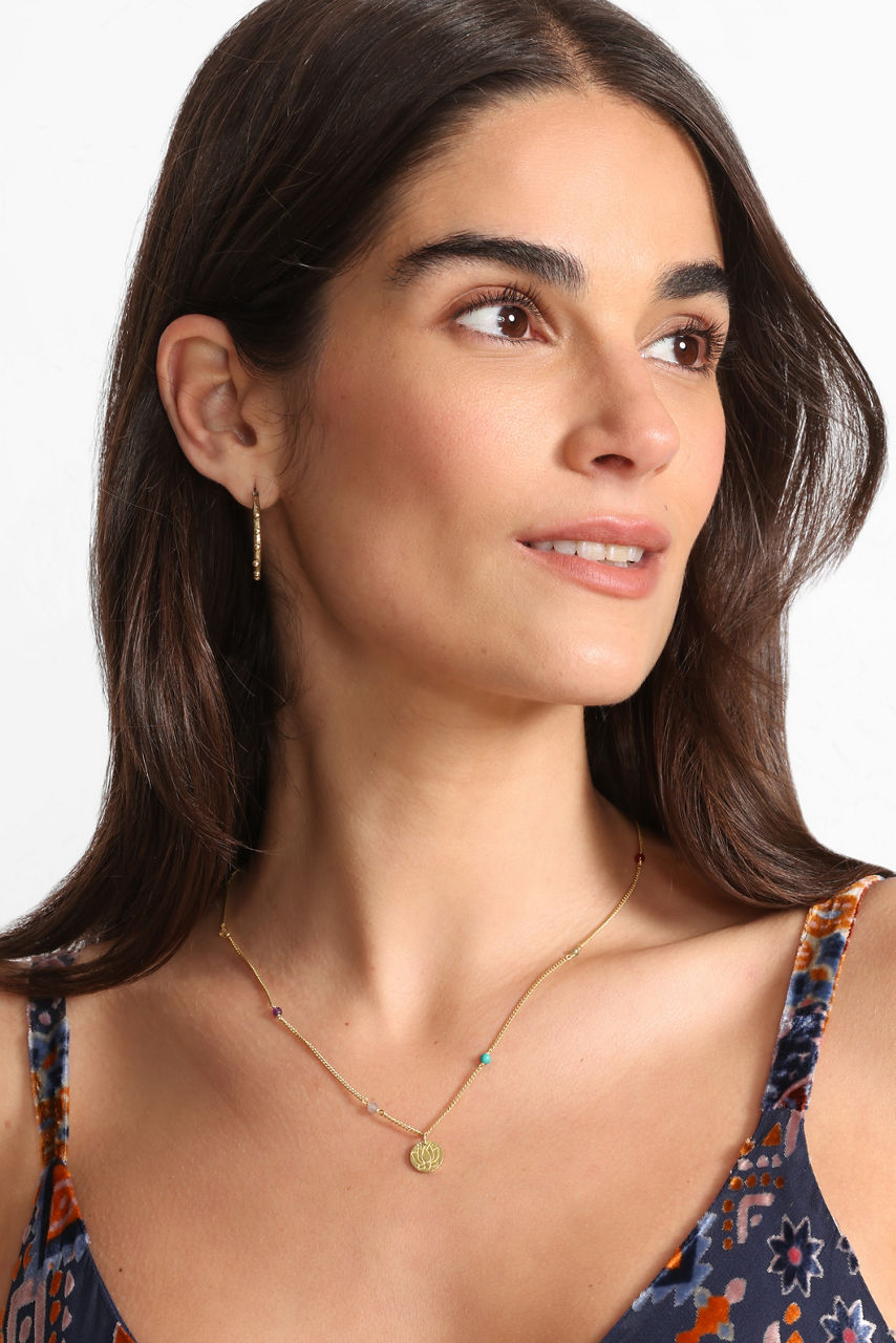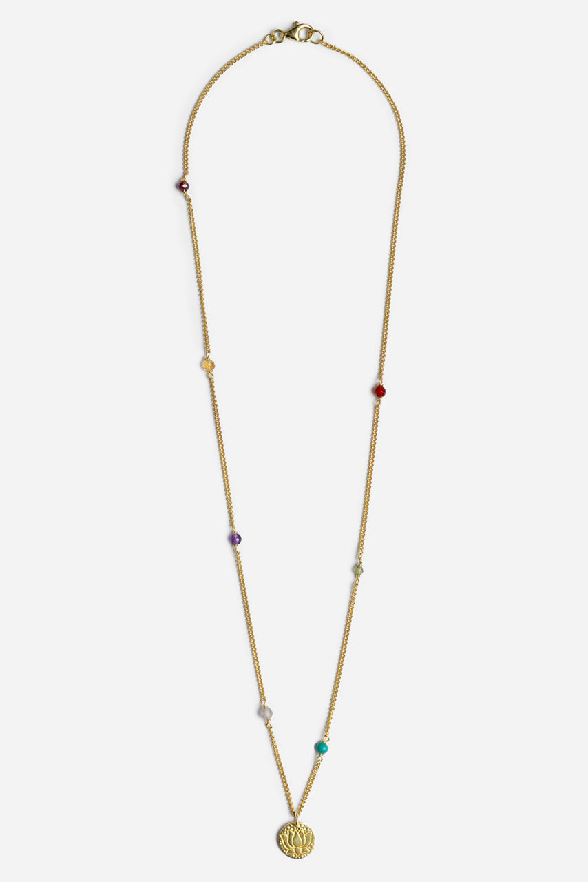 Find your center with the Chakra of Paradise Necklace, a delicate strand adorned with radiant, multicolored stones and a symbolic medallion pendant. Crafted in gold-plated sterling silver, this piece is designed to inspire balance, harmony, and self-expression. A meaningful everyday accessory that pairs beauty with intention.