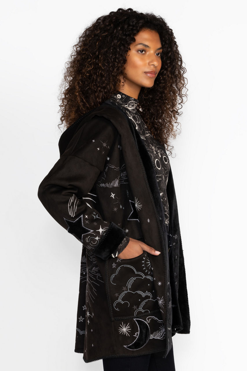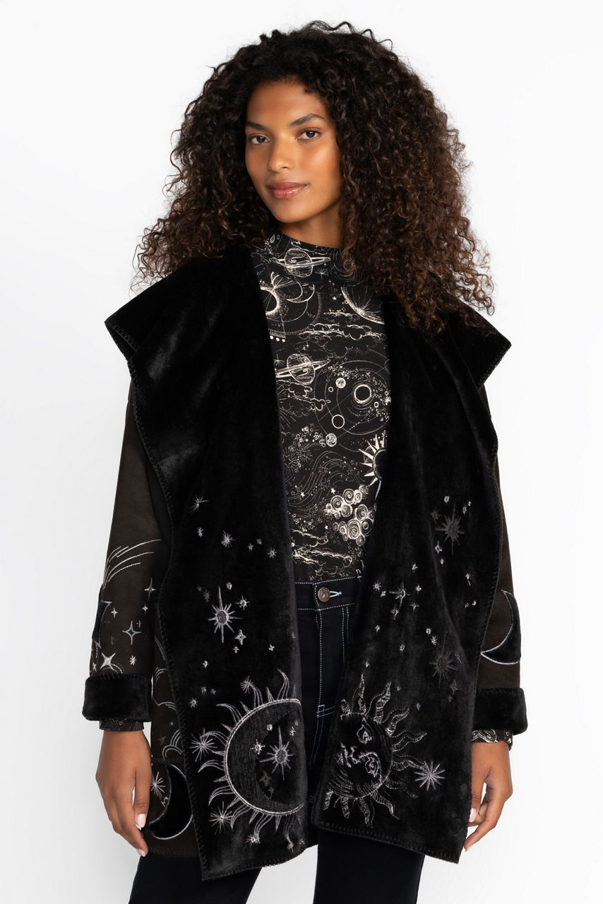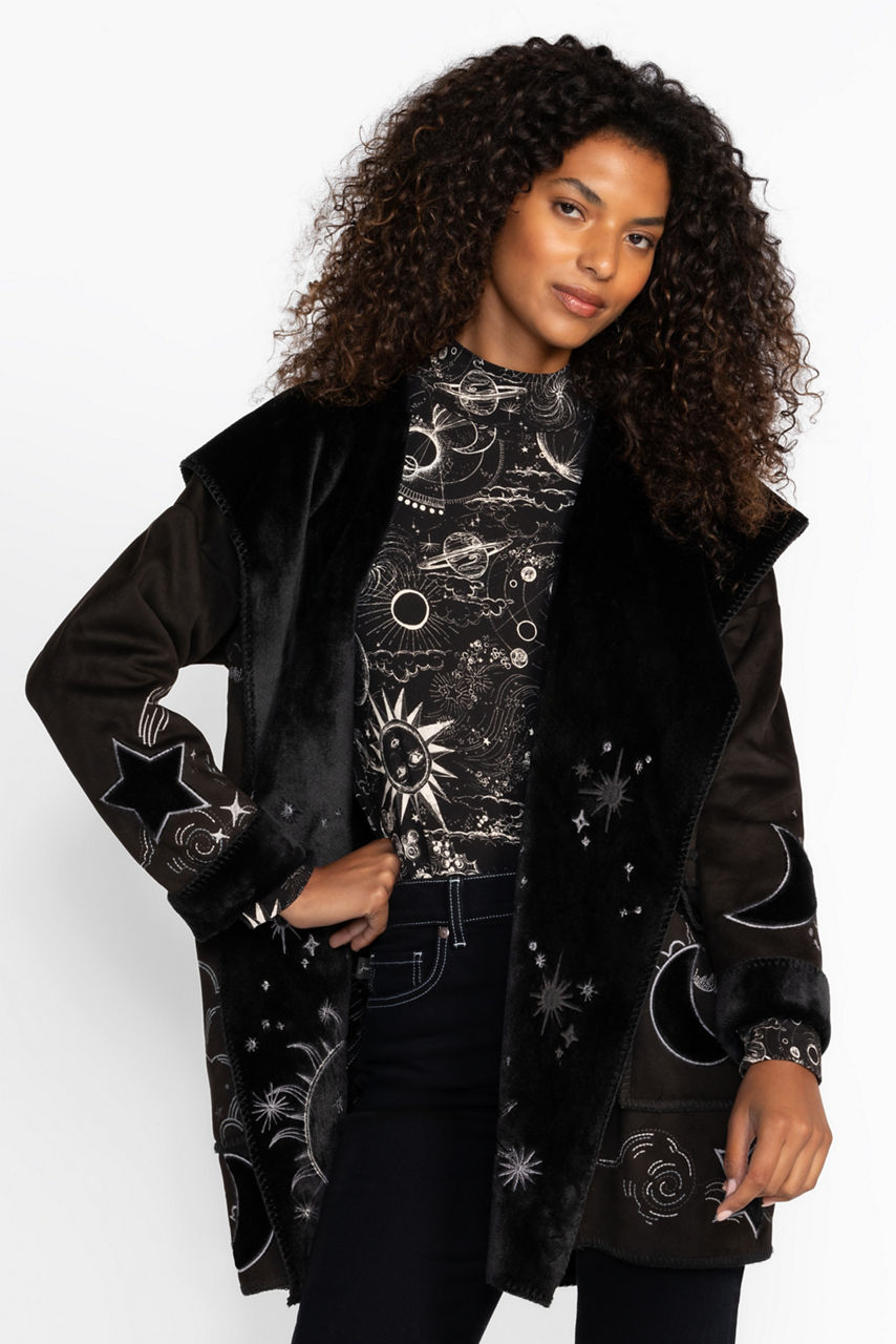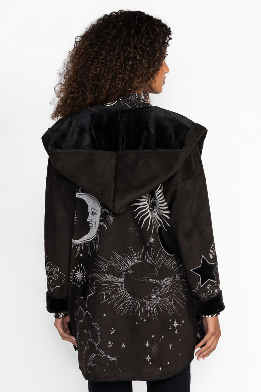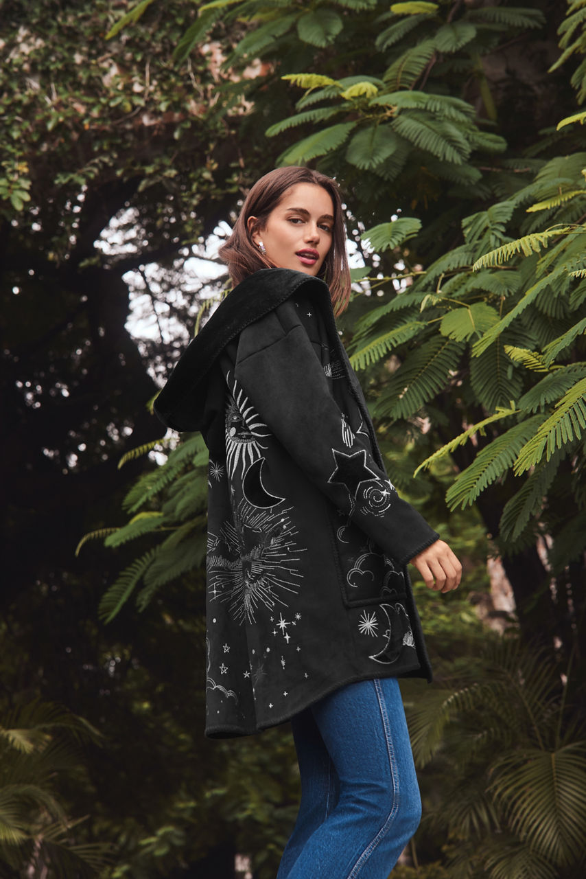 Celebrate the mystical night sky with the Chani Suede Back Fur Coat. Crafted from shearling fur backed with suede, this cozy coat features an attached hood and pockets and is embellished with intricate embroidered celestial images. Layer over a classic button-down and pair with skinny jeans for an elevated casual look.