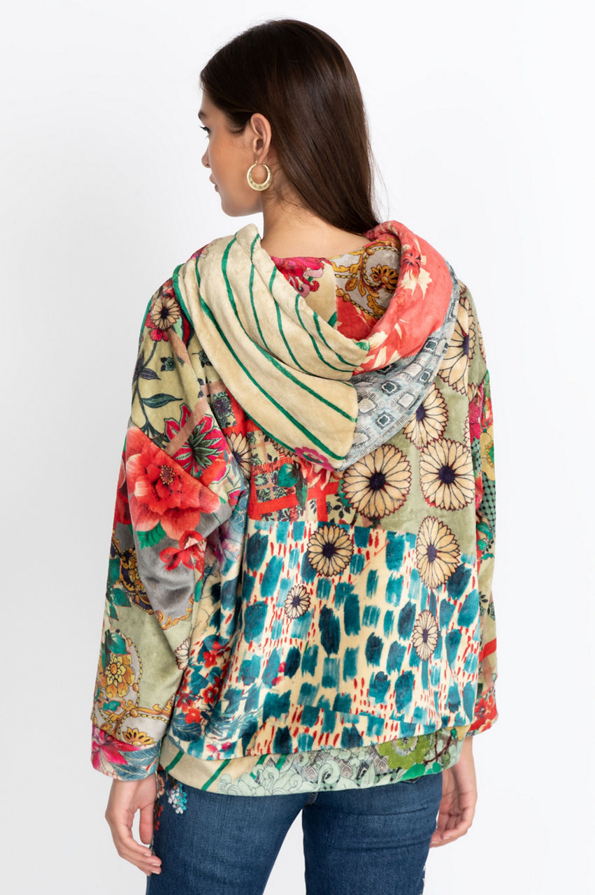 The Chantel Sherpa Pullover Hoodie is a modern piece that combines colorful floral motifs with geometrical shapes to create structure. This warm and comfortable hoodie is the perfect layer for rainy days, but it s also a garment you ll enjoy wearing when lounging around the house. The color scheme will create a stylish contrast with neutral leggings or white sneakers.