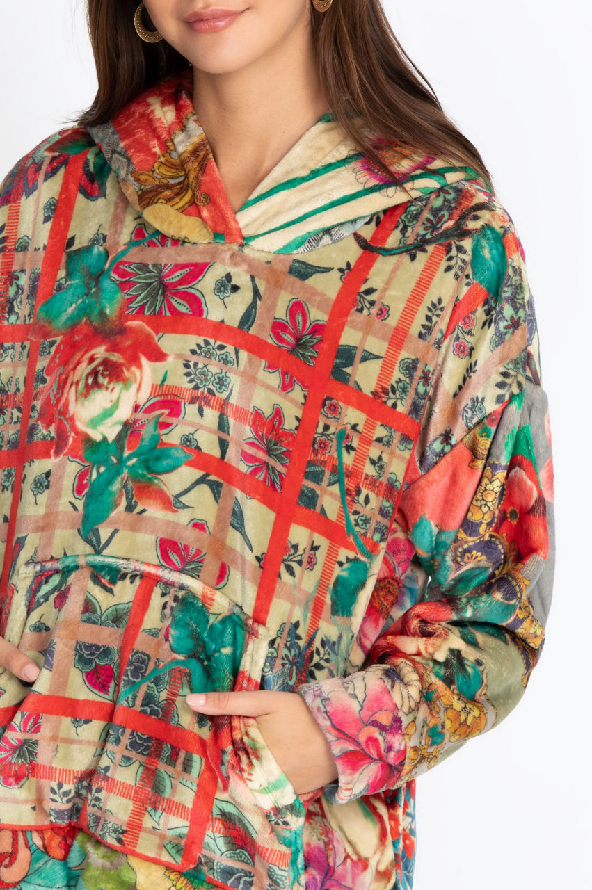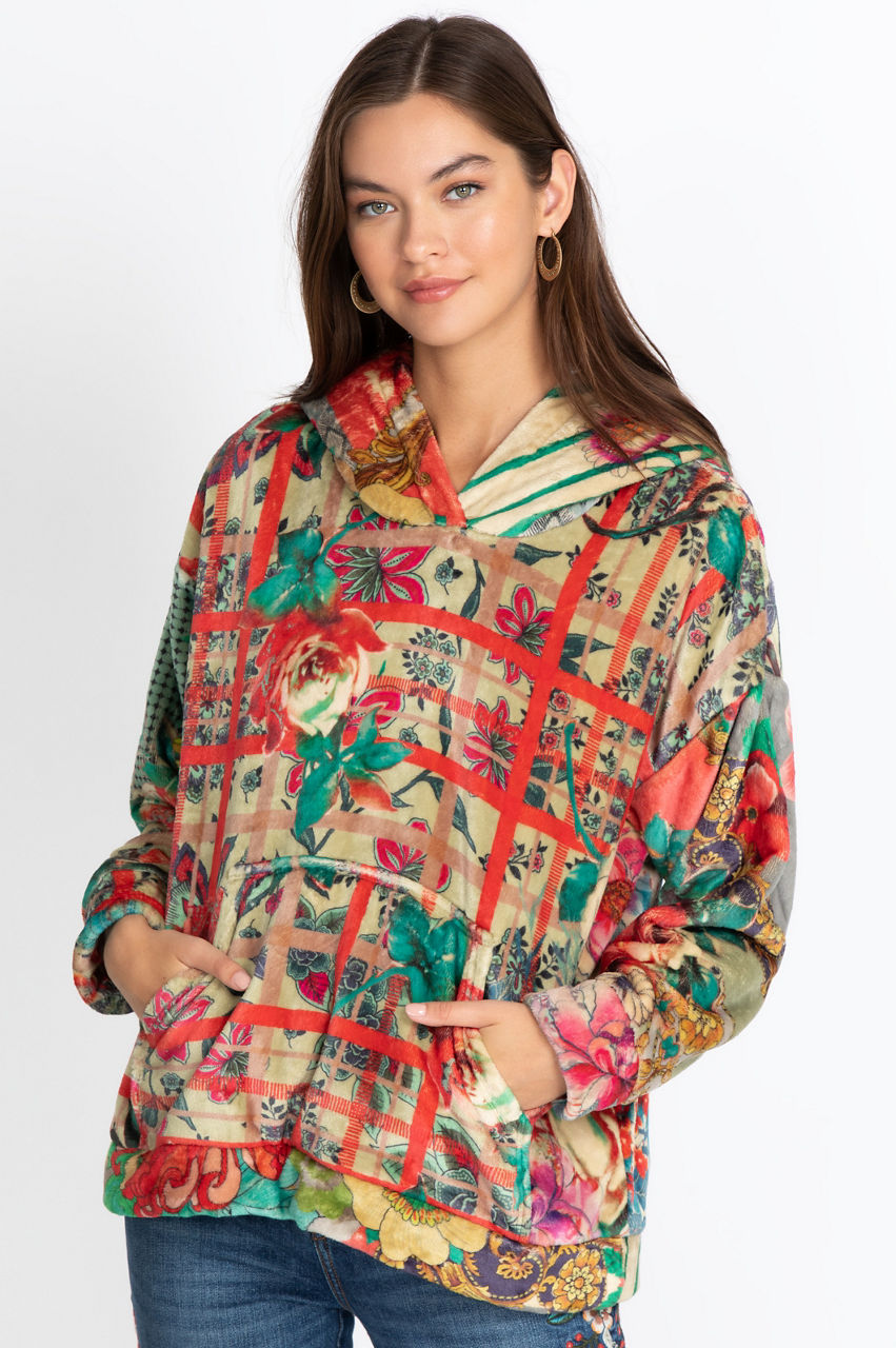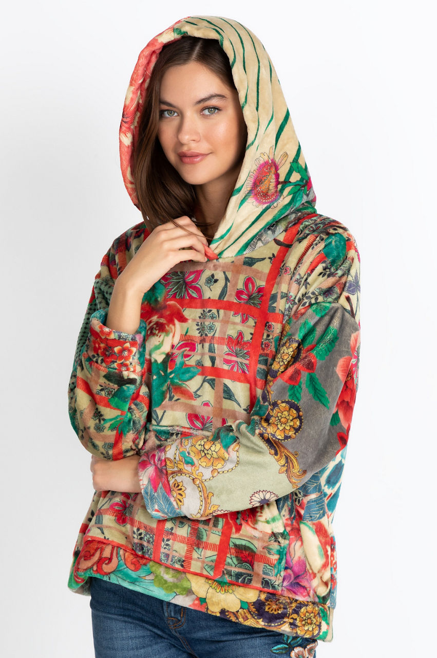 The Chantel Sherpa Pullover Hoodie is a modern piece that combines colorful floral motifs with geometrical shapes to create structure. This warm and comfortable hoodie is the perfect layer for rainy days, but it s also a garment you ll enjoy wearing when lounging around the house. The color scheme will create a stylish contrast with neutral leggings or white sneakers.