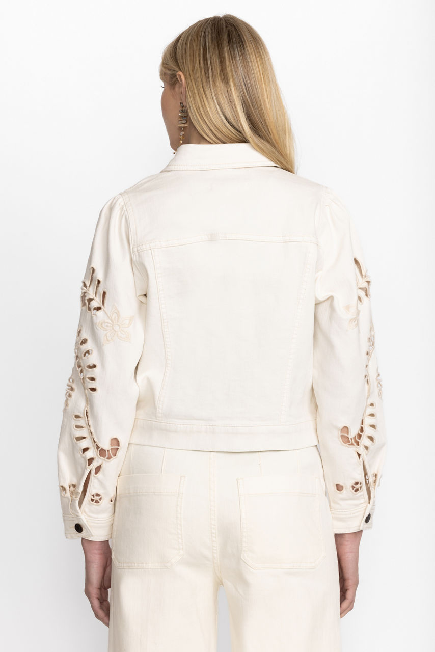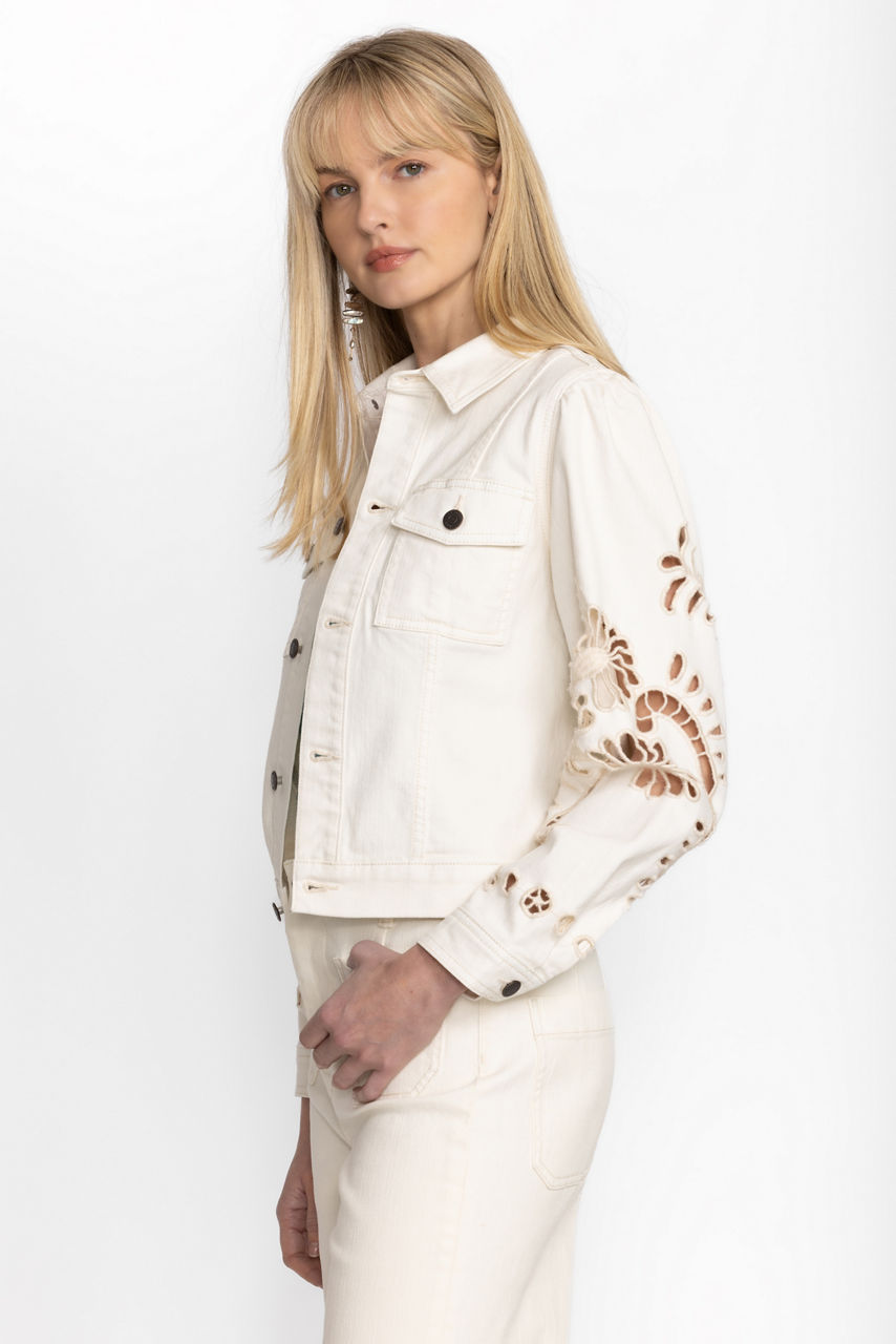 Crafted from a breathable cotton blend, the Charlotta Cropped Denim Jacket offers an outer layer rich in style. Featuring a cropped silhouette and intricate laser cut-outs embellished with intricate tonal embroidery, this jacket offers front flap pockets and a button front. Layer over a colorful long sleeve tee to highlight the detailed cut-outs.