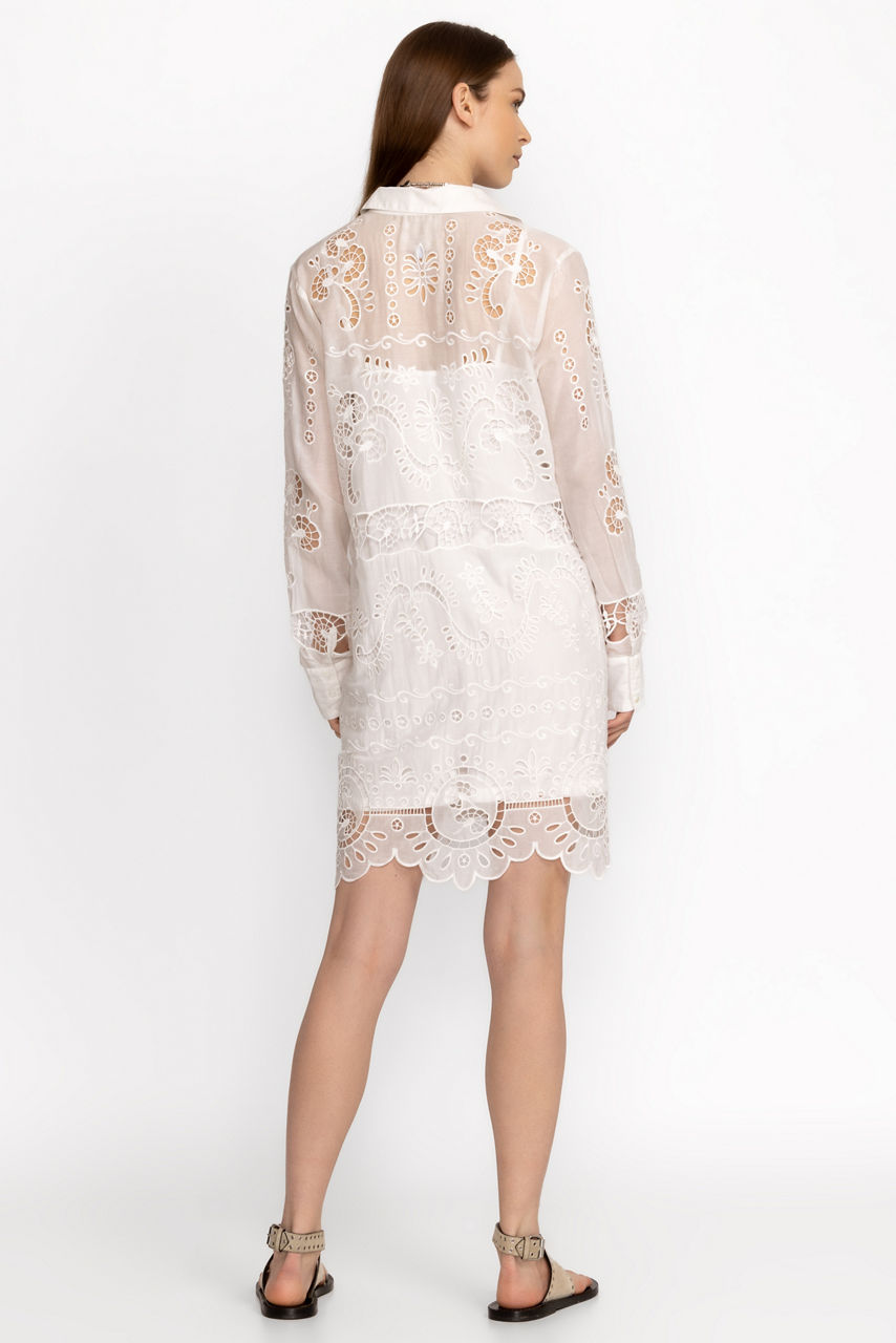 Crafted from a sumptuous blend of silk and cotton, the Charlotta Eyelet Silk Mini Dress perfectly combines exquisite detail and style. Designed with a traditional collared button-front, this unique mini dress features intricate eyelet detailing and a beautiful, scalloped hemline. Pair with neutral pumps and a classic bag for an upscale lunch date.