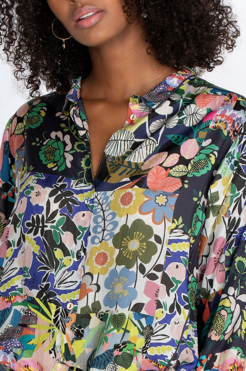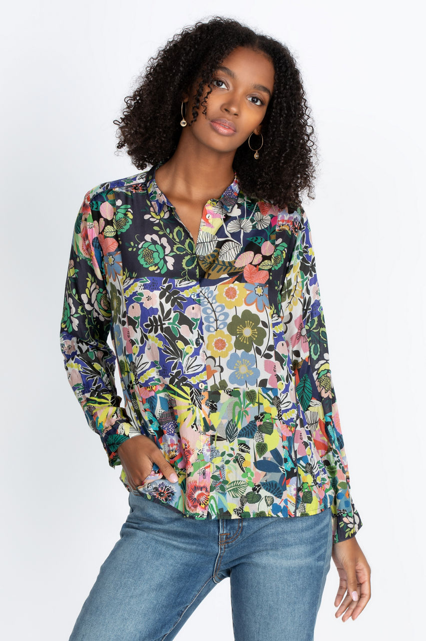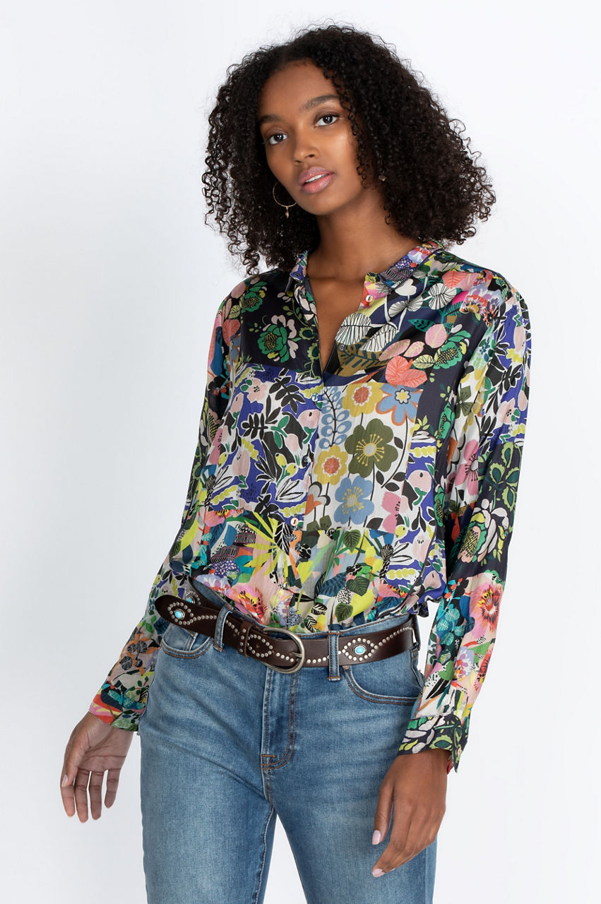 Brighten your gloomy days with our Chelsea Astra Button Down. This gorgeous top features a vibrant color story, ultra-luxe fabrics, and a feminine design to give you everything you want and more. Pair this piece with some floral jeans and your favorite boho ankle boots to pull together a perfectly chic look.