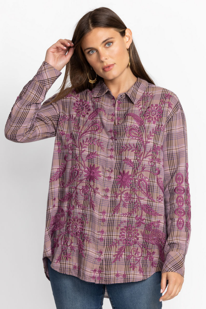 Crafted from a comfortable cotton blend, the Chloe Oversized Shirt Tunic revamps a perennial wardrobe essential with a classic plaid pattern. Cut to an oversized fit, this shirt tunic features a collar, long sleeves, fabric covered buttons at the front and on the cuffs, and a detailed floral placement embroidery. Pair with a skirt or opt for jeans for a casual approach to daytime dressing.