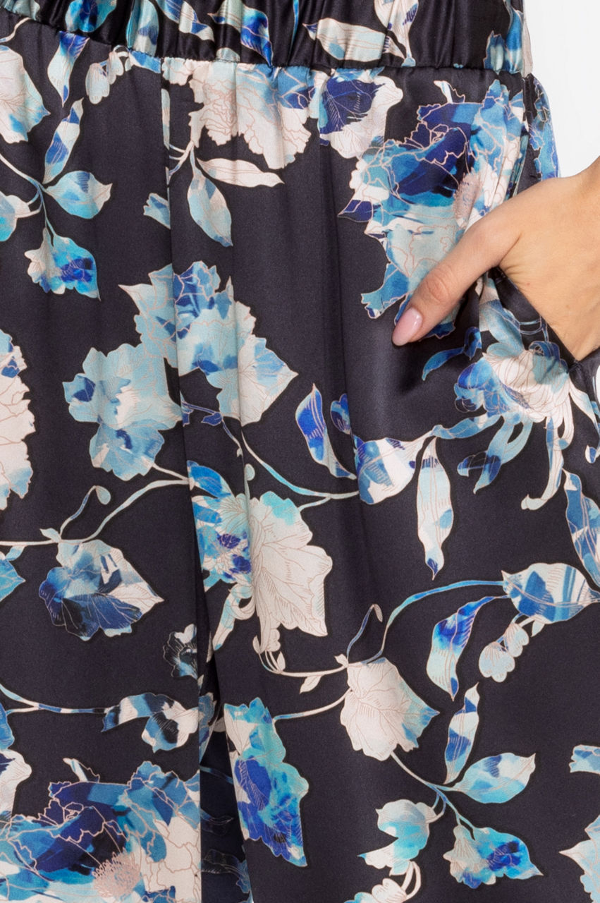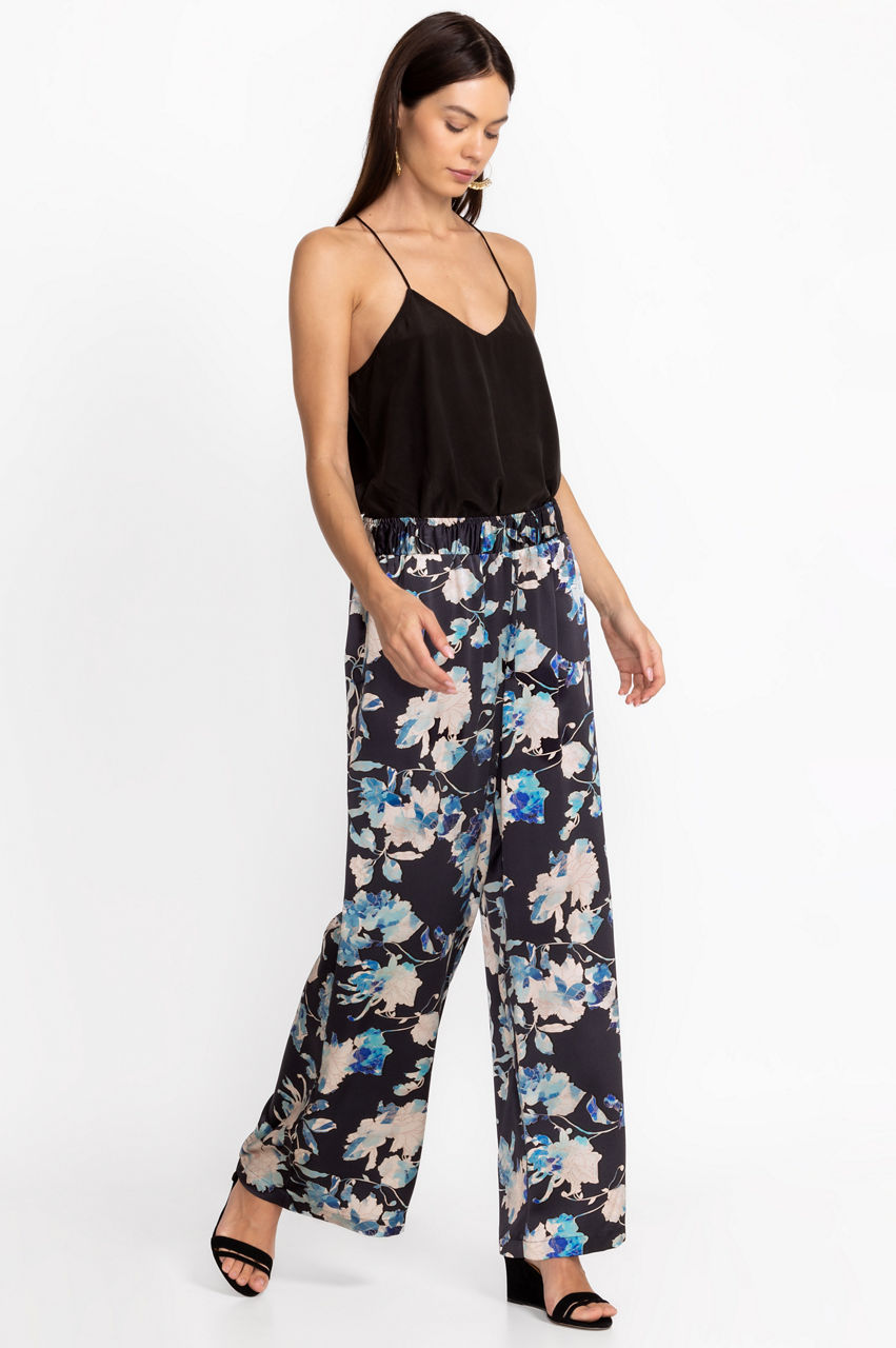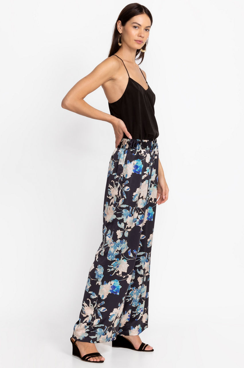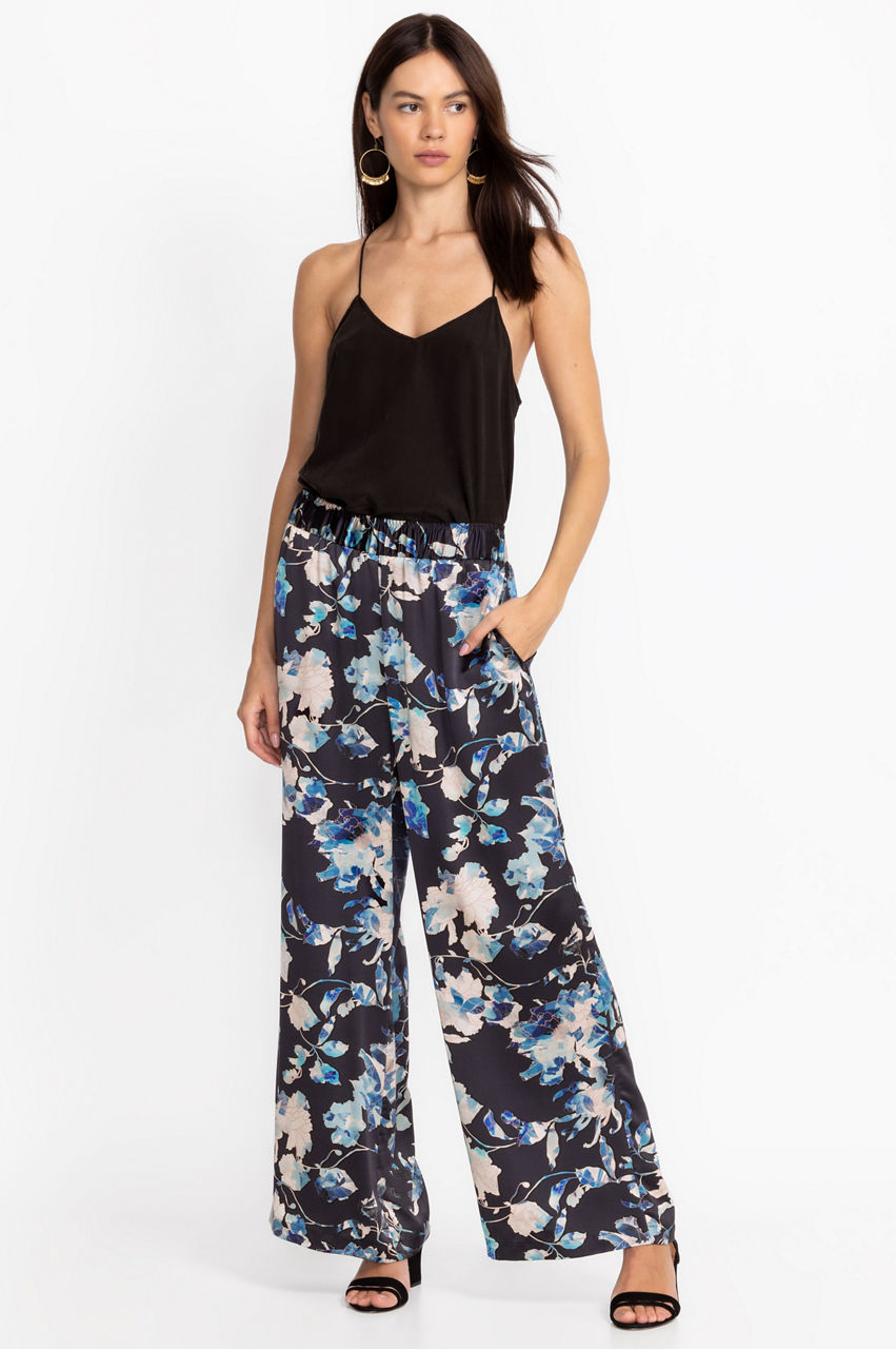 Displaying soft floral bouquets on a deep backdrop, the Chryssy Charmeuse Wide Leg Pants offer the comfort of lounge wear in a luxe polished silhouette. Crafted from 100% silk and finished with an elastic waistband and side pockets, these elegant pants flutter in the breeze. Pair with a silk shell top and espadrille sandals for an elevated outfit.