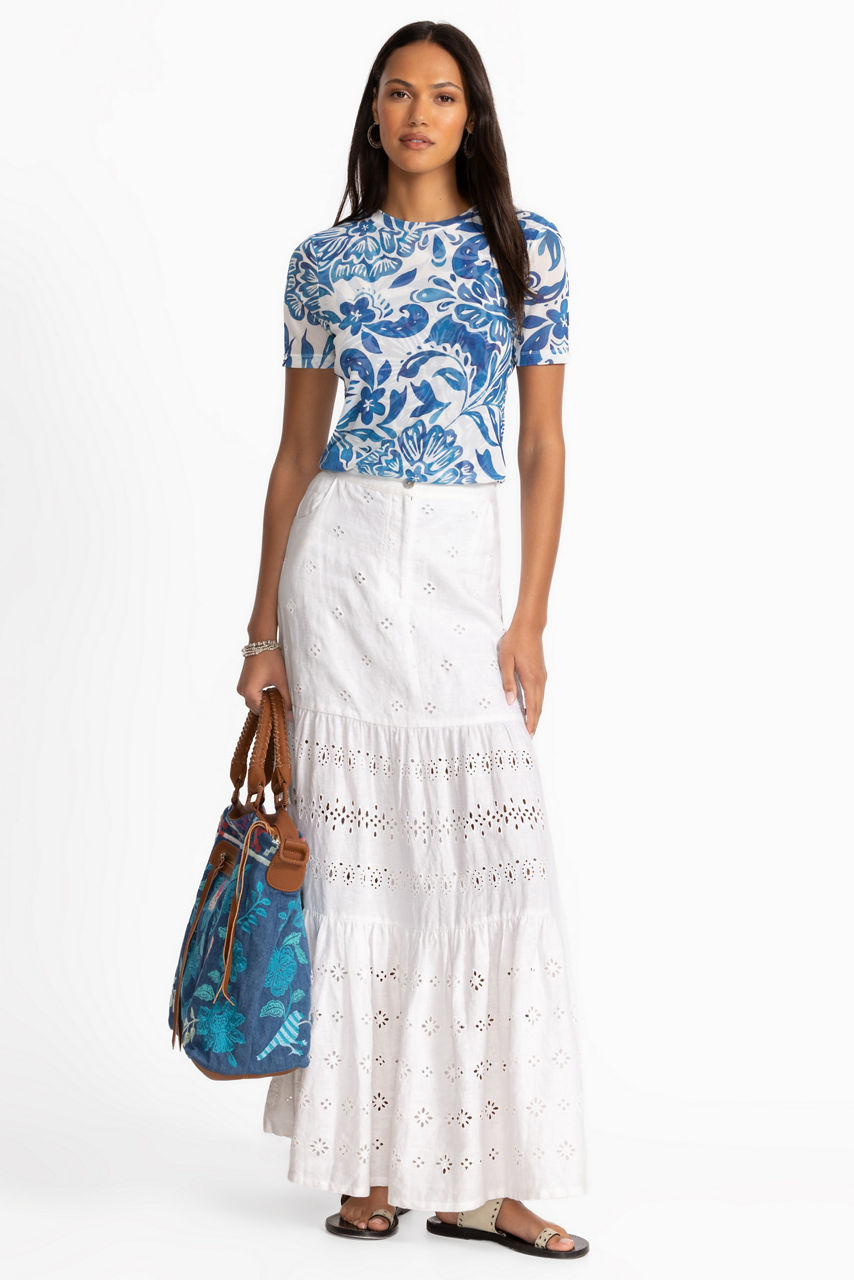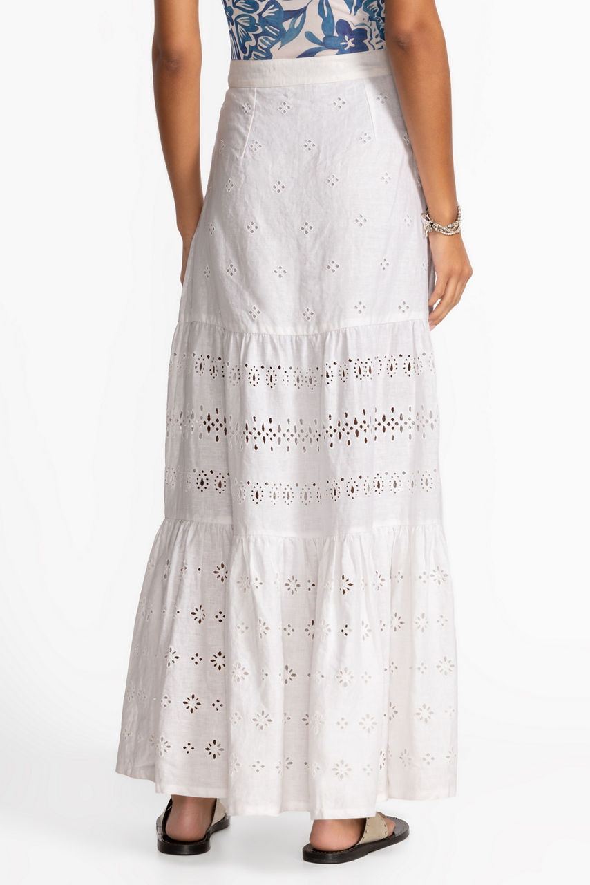 Crafted from 100% breezy linen, the Cielito Tiered Skirt is embellished with delicate eyelet detailing. Featuring a front fly and slip pockets at the hips, this partially-lined skirt offers a unique silhouette finished with tiered layers. Pair with a silk cami and espadrille wedges for a polished night-out ensemble.