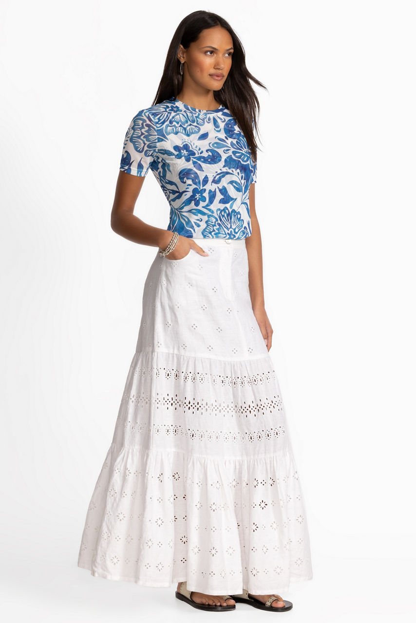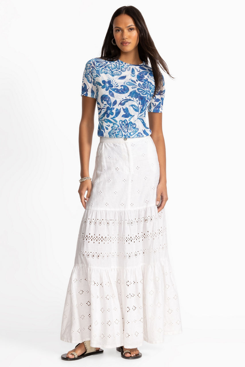 Crafted from 100% breezy linen, the Cielito Tiered Skirt is embellished with delicate eyelet detailing. Featuring a front fly and slip pockets at the hips, this partially-lined skirt offers a unique silhouette finished with tiered layers. Pair with a silk cami and espadrille wedges for a polished night-out ensemble.