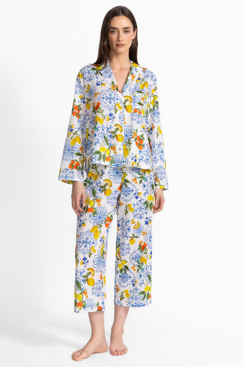 Adorned with a vibrant pattern in hues of yellow and orange, the Citrus Sleep Set adds a touch of whimsy to a traditional sleepwear style. Crafted from 100% rich cotton, this set features a long sleeve button-down top paired with flowing pants with an elastic waist for a comfortable fit. Pair with the Citrus Sleep Robe and coordinating slippers for a cozy night in.
