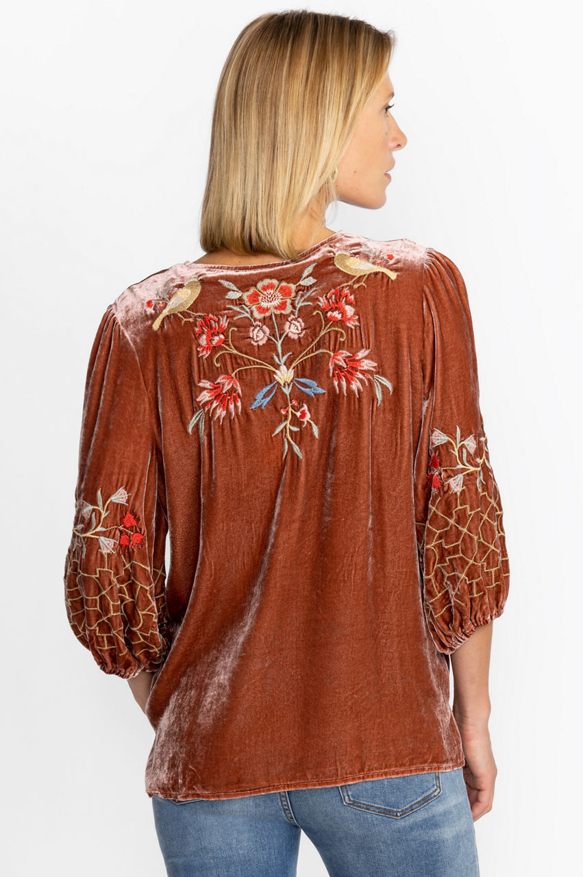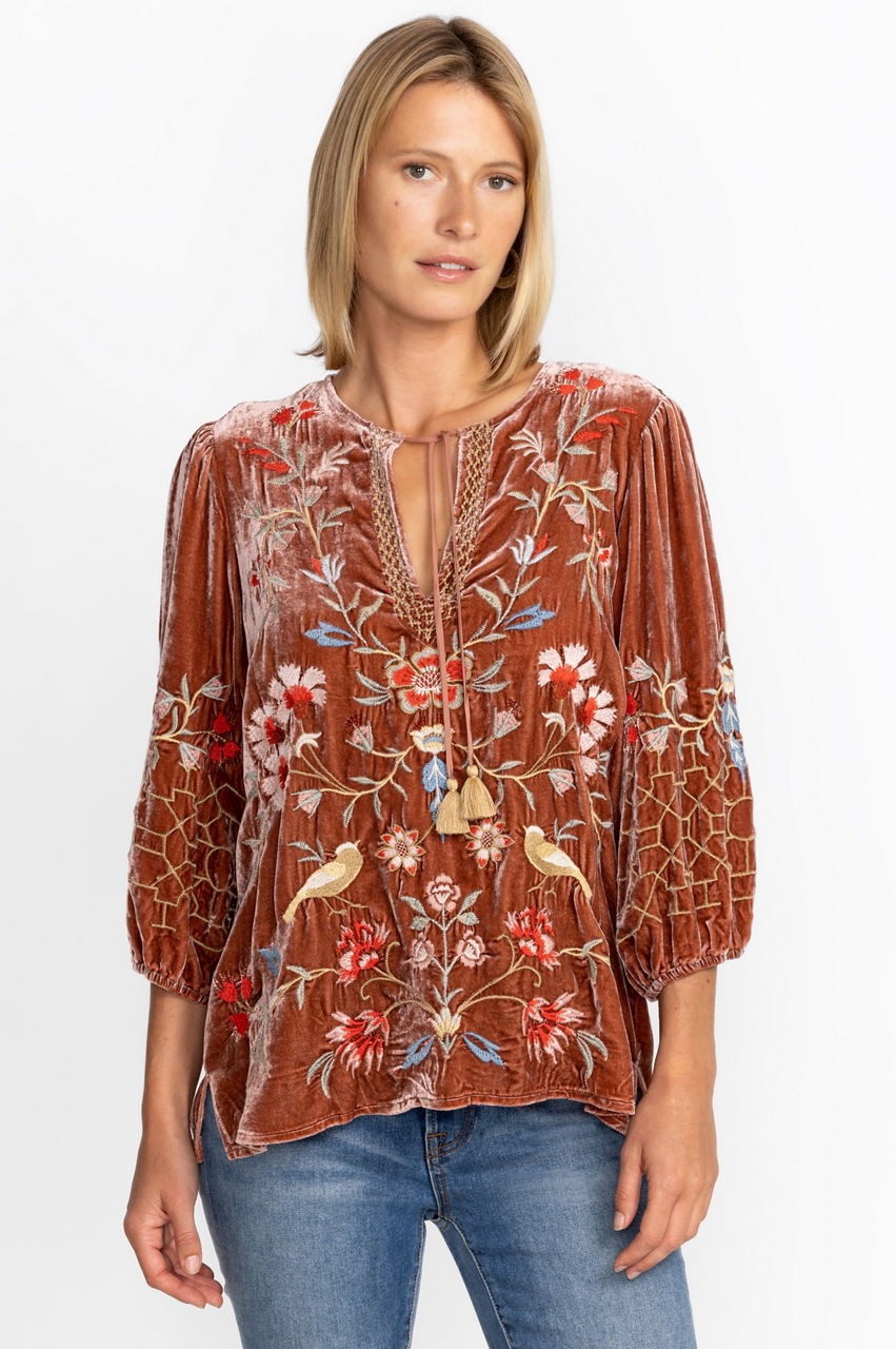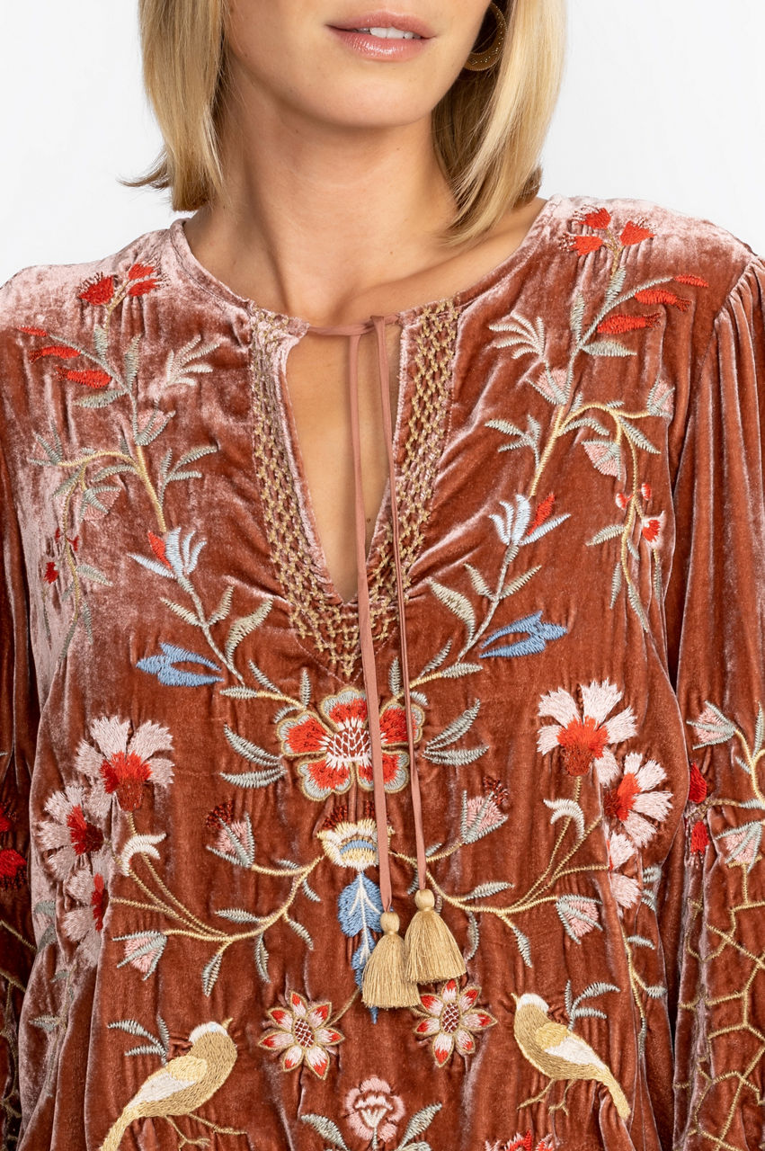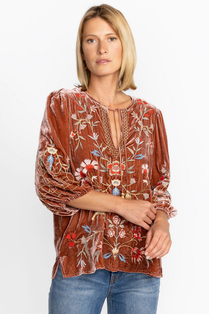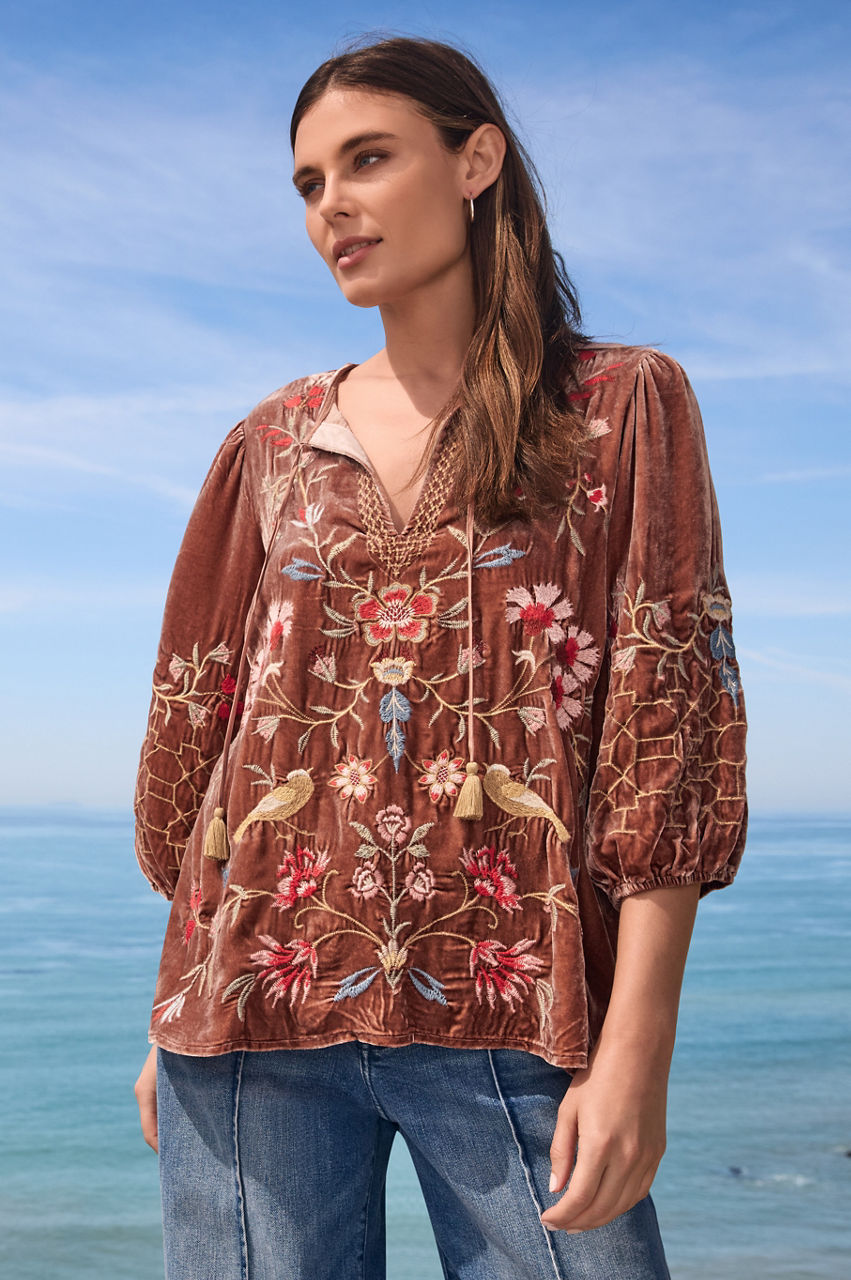 An easy fit with an unexpected opulent twist, the Clara Relaxed Velvet Blouse brings an elevated look to any occasion. Cut in a relaxed fit, this blouse is made from plush silk-blend velvet with long sleeves, a blossoming floral placement embroidery, and a tie neckline with tassels. Style this blouse with a maxi skirt or opt for pants on cooler days.