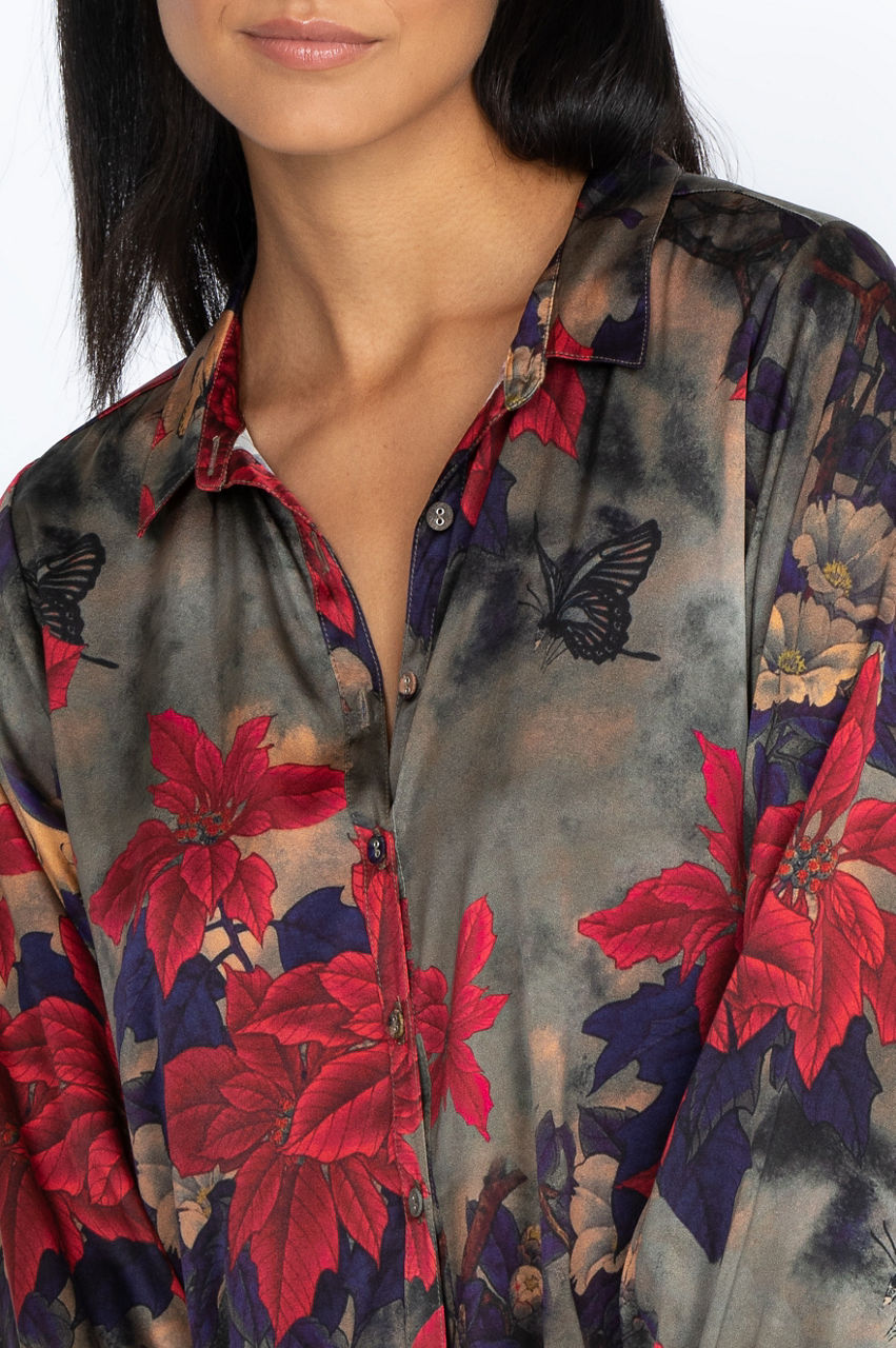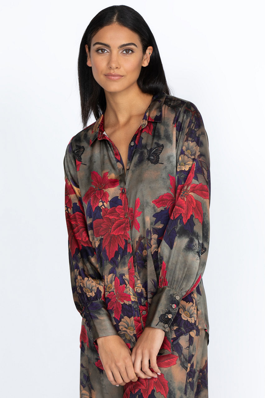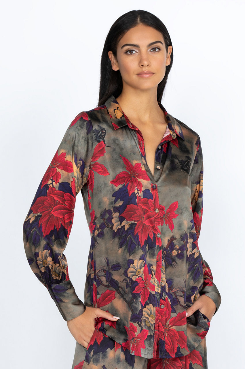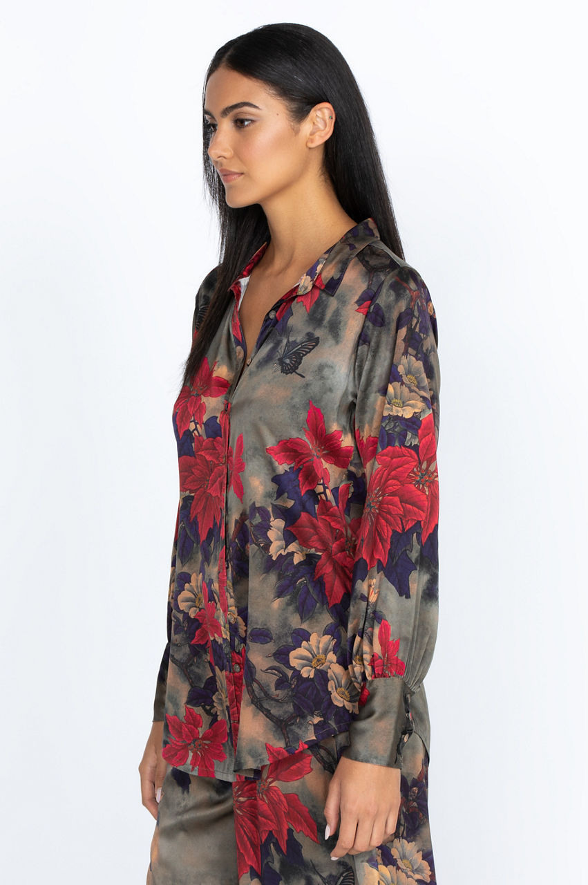 The Claret Yrene Button Up is a chic addition to your wardrobe with its vibrant floral motif and classic button-up construction. The cuff sleeves will add volume, movement, and structure to your look while taking the classic button-up look to the next level. Style this splendid top over a comfortable silk tank for a layered effect or wear it underneath a structured jacket.