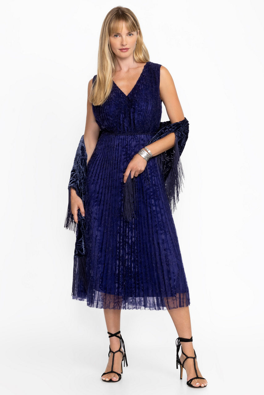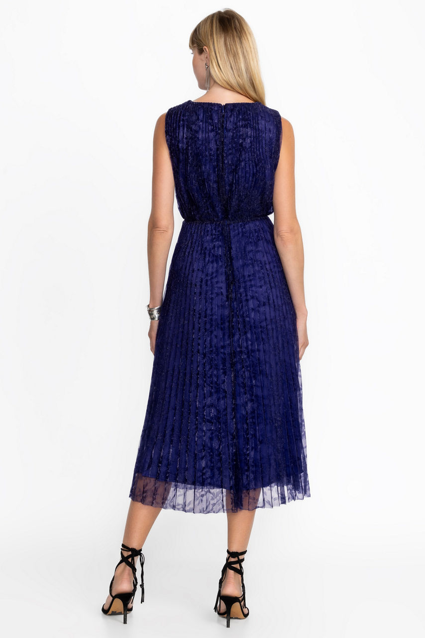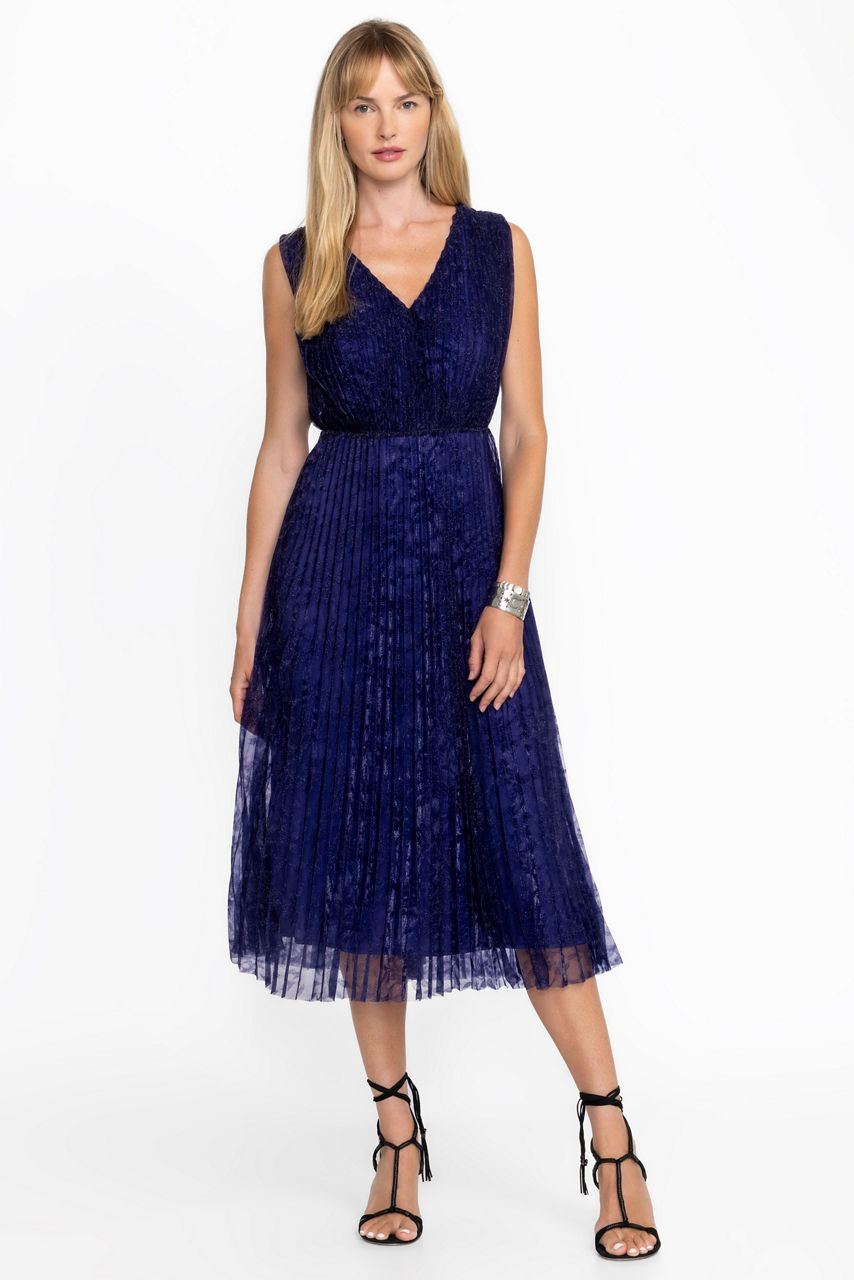 Crafted from a delicate blend, the Clario Pleated Midi Dress is washed in a vibrant electric blue. Featuring a V-neckline and intricate pleating throughout the bodice and skirt, this stunning fit-and-flare dress is finished with an invisible zipper at the back. Pair with classic pumps and a beaded clutch for an elegant night out.