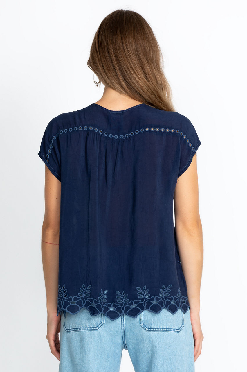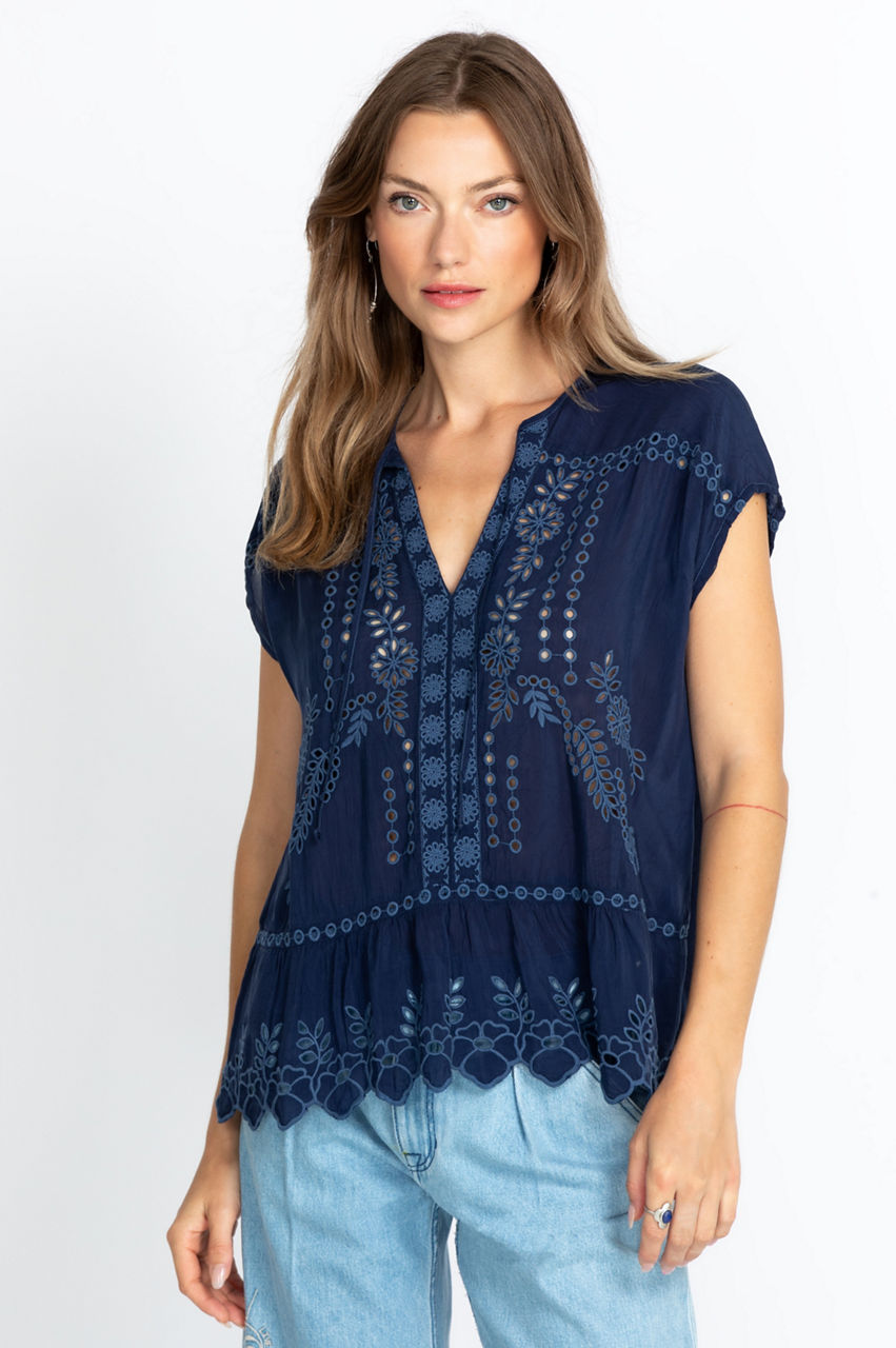 Our uniquely chic Clemence Blouse is perfect for achieving an effortless look while staying cool in the warmer months. The beautifully embroidered scallop hem gives this blouse its trendy, boho appearance, while its soft, smooth fabrication provides comfort. Wear this blouse with shorts and chunky sandals for a go-to outfit that is perfect for any summer activity.