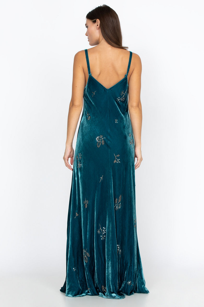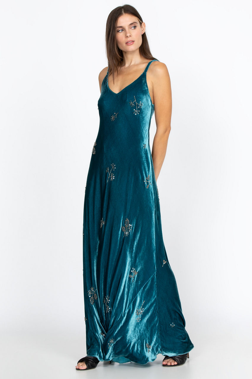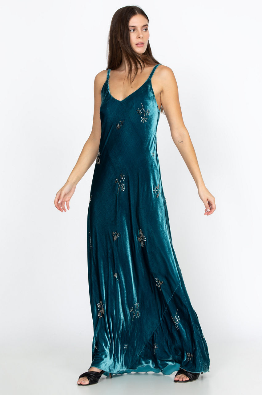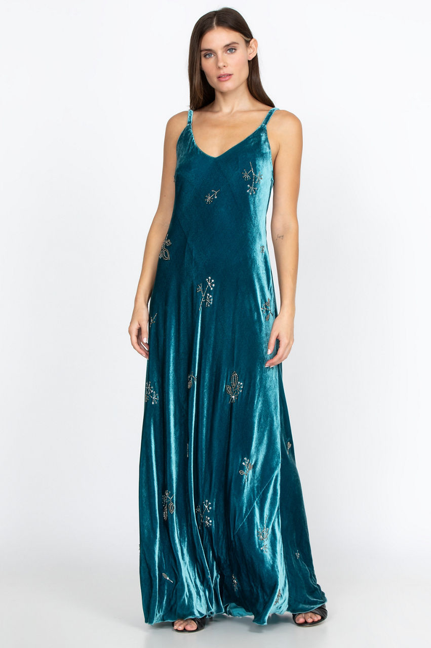 With the smooth, silky feel of the velvet, you won t be able to get enough of the Cleo Maxi Dress! Featuring exquisite beading and a nature-themed motif, you will want to wear this dress for any outing. A flowy fit ensures a high level of comfort. Pair neutral-colored heels and gold or silver jewelry with this dress for an effortless look.