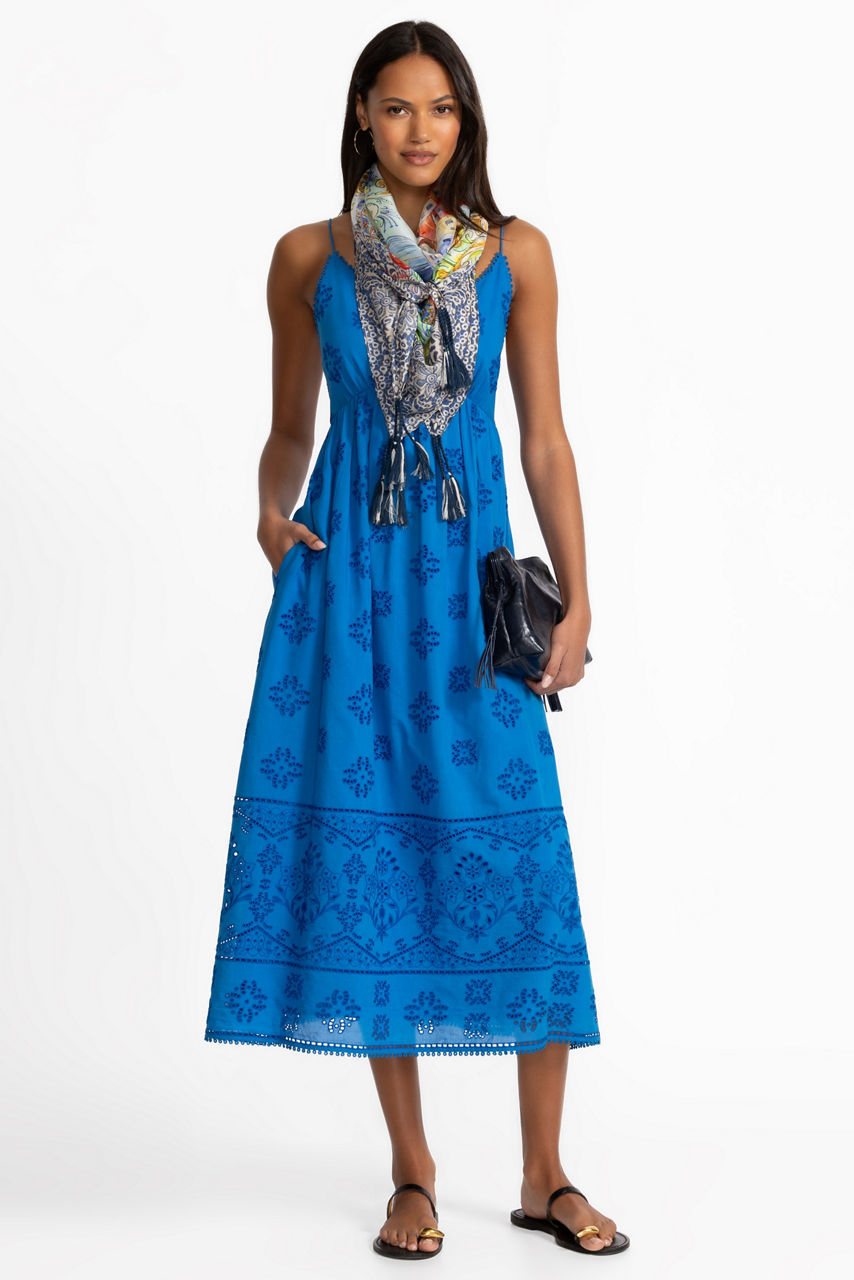 The Cleo Tea Length Dress is crafted from a unique cotton blend and is adorned with a rich tone-on-tone embroidered detailing. Designed with a sweetheart neckline and spaghetti straps, this slip-lined dress features an elasticized back and an empire waist. Pair with wedges and a raffia bag for a vacation-worthy look.