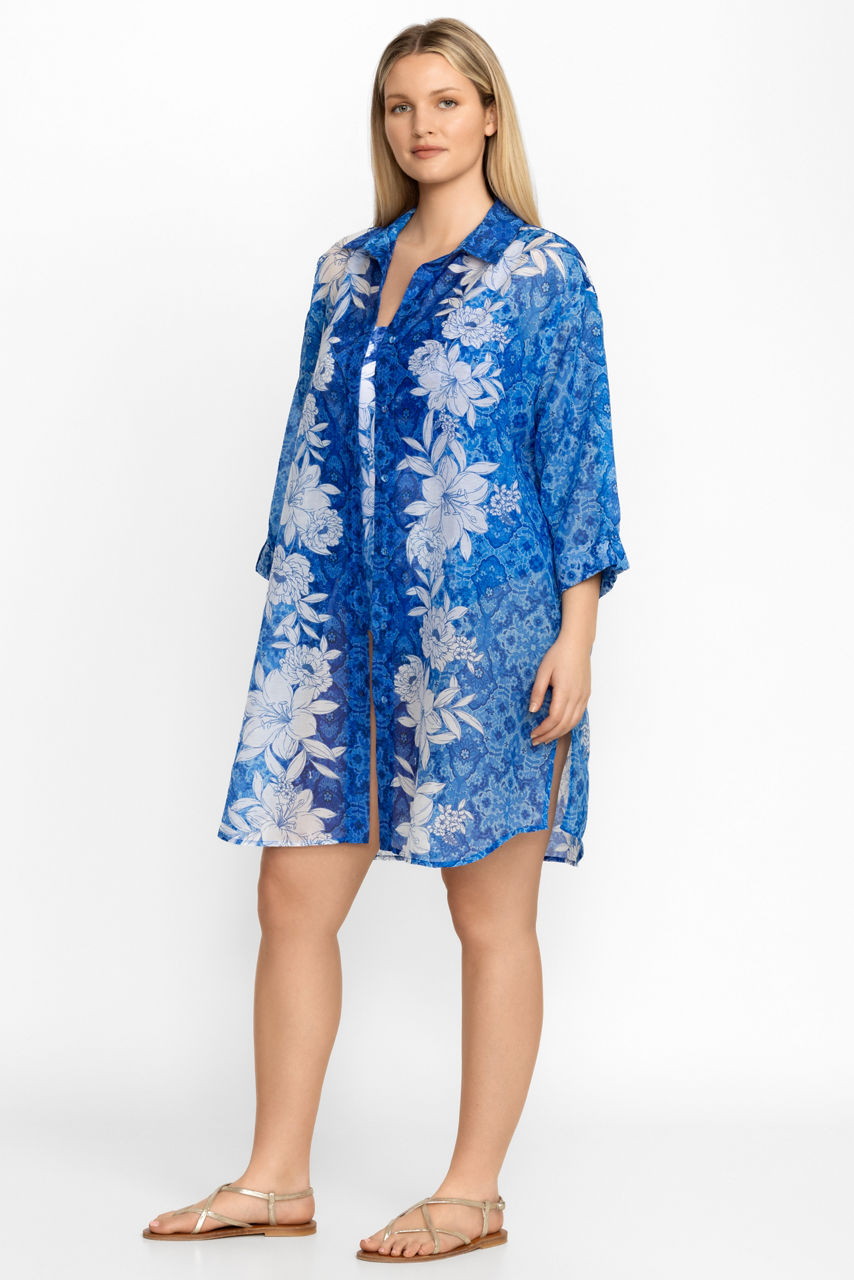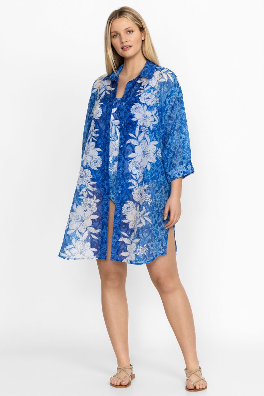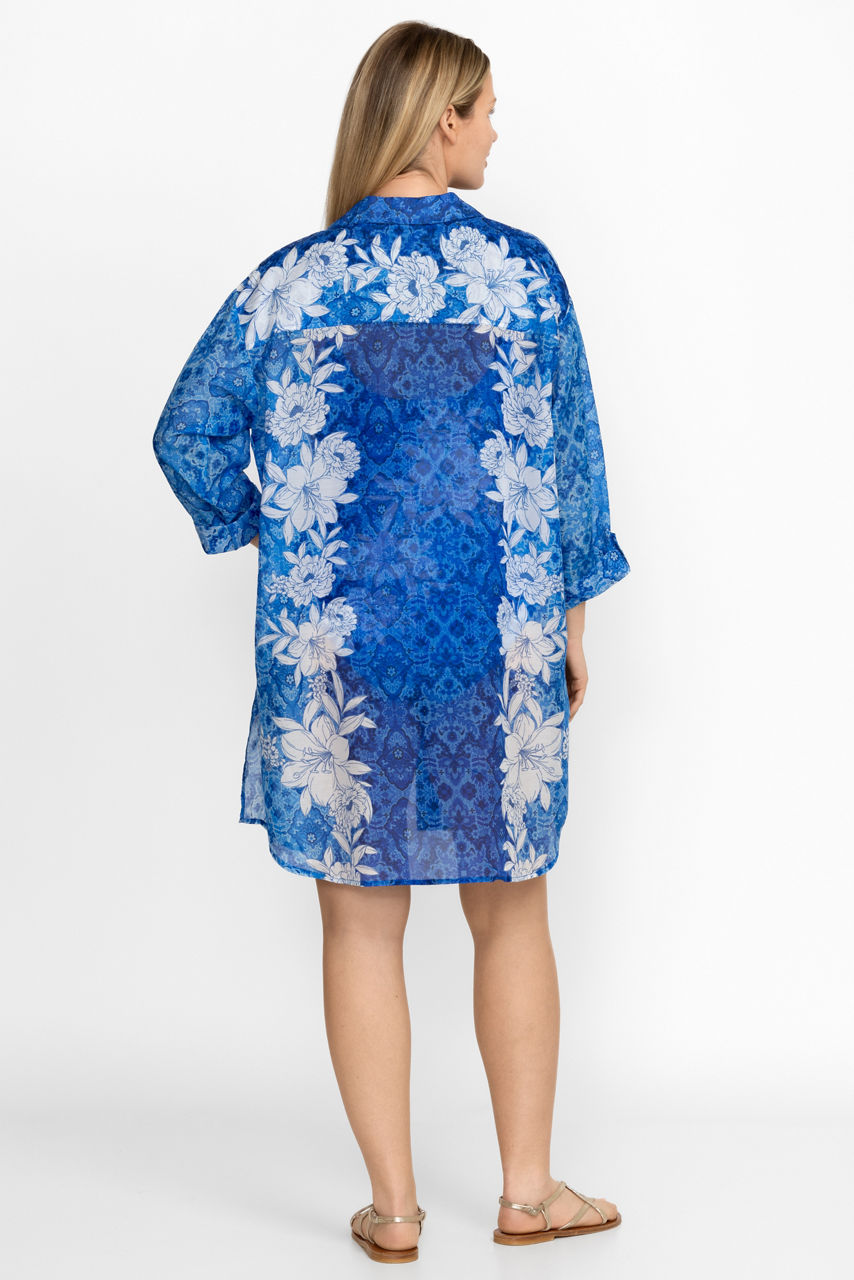 A vacation favorite, the Clio Mix Button Down Shirt Dress is a practical beach staple that doesn't compromise on style. This shirt is made from a breathable cotton and silk blend with a vibrant blue floral pattern. This shirt dress can be worn open with a tank and jeans or a bikini for a nonchalant finish.