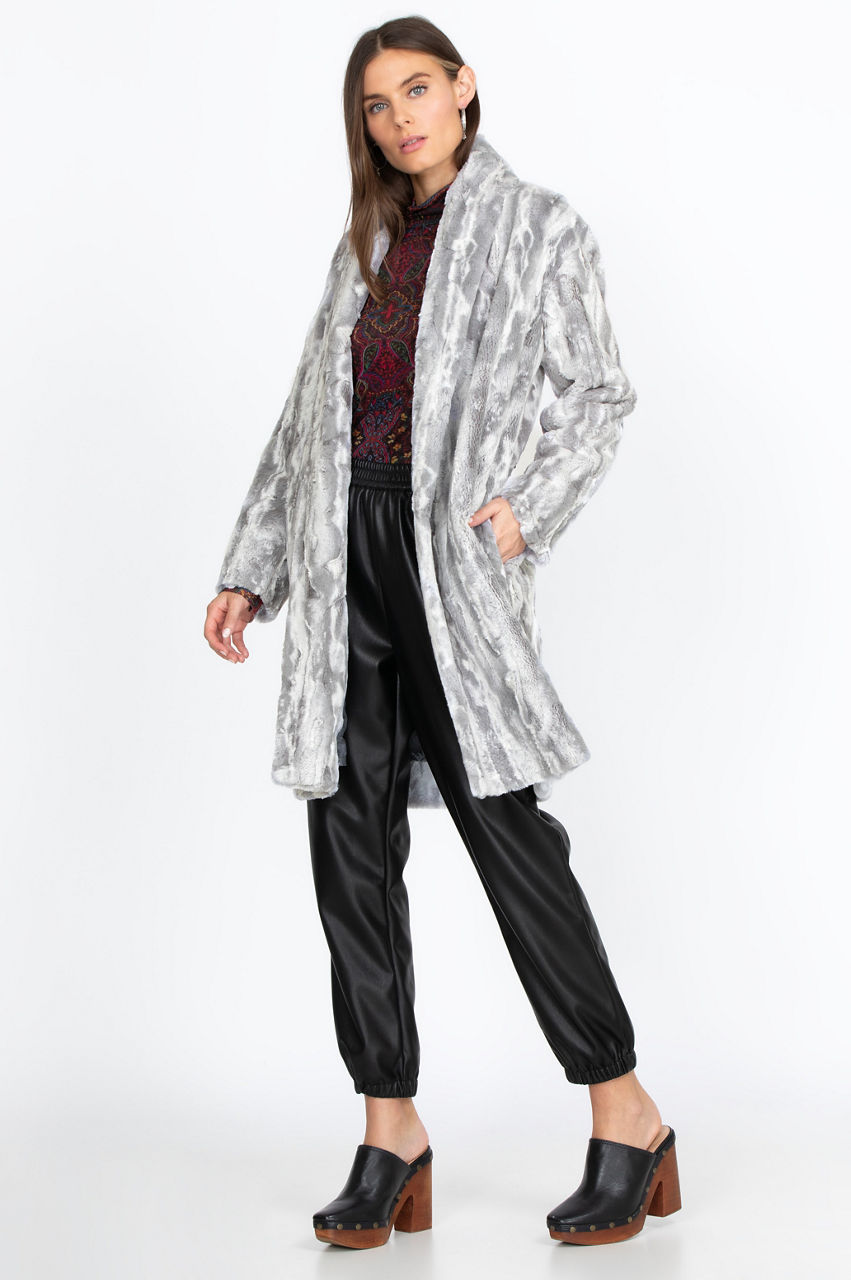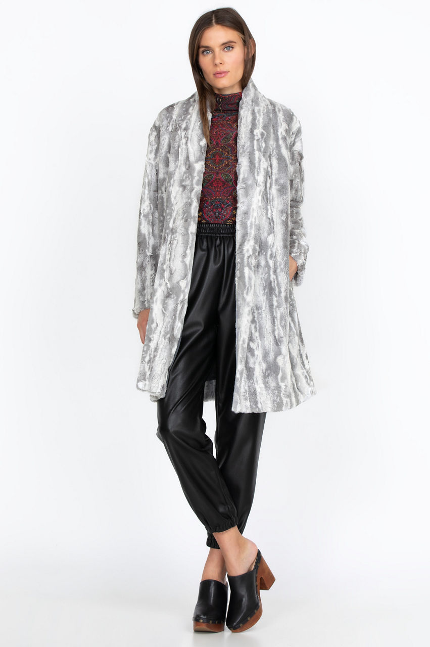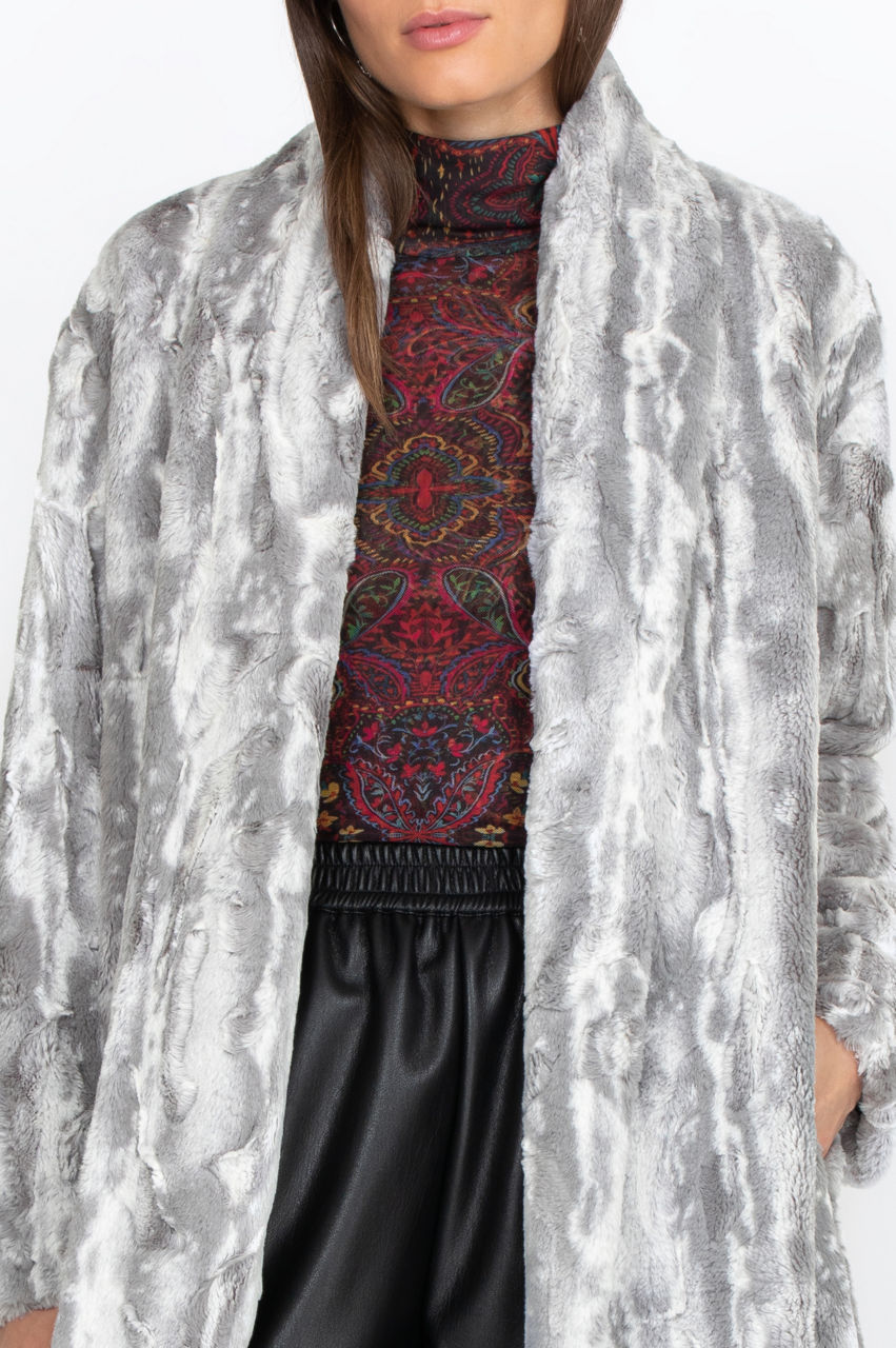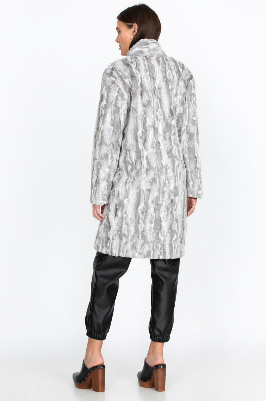 The Cloud Faux Fur Jacket features a soft texture and discreet all-over pattern. It s a comfortable garment that will help you stay warm and stylish this winter with its neutral tones and chic lapel detail. Style this gorgeous jacket with a leather handbag and some knee-high boots for an effortlessly elegant look.