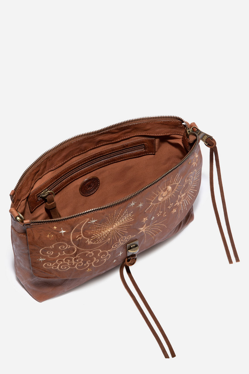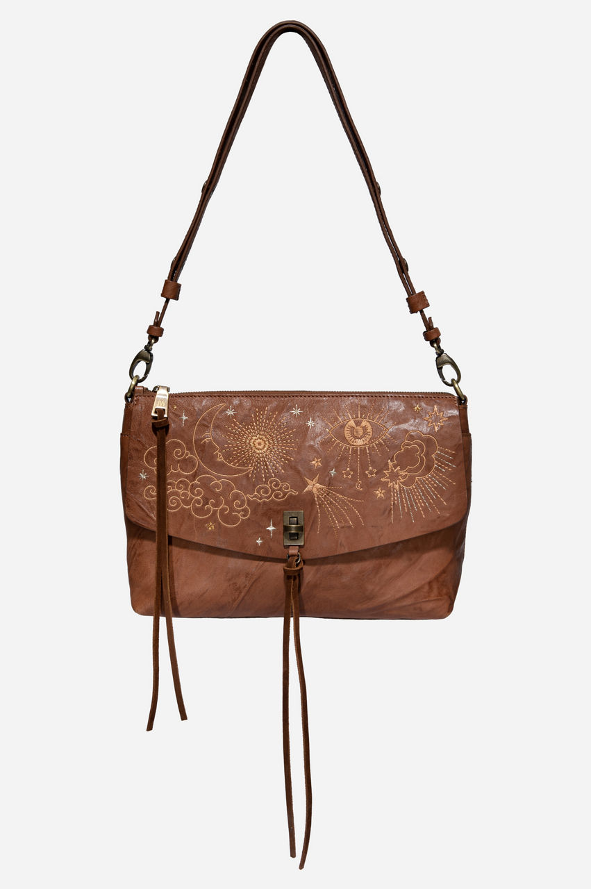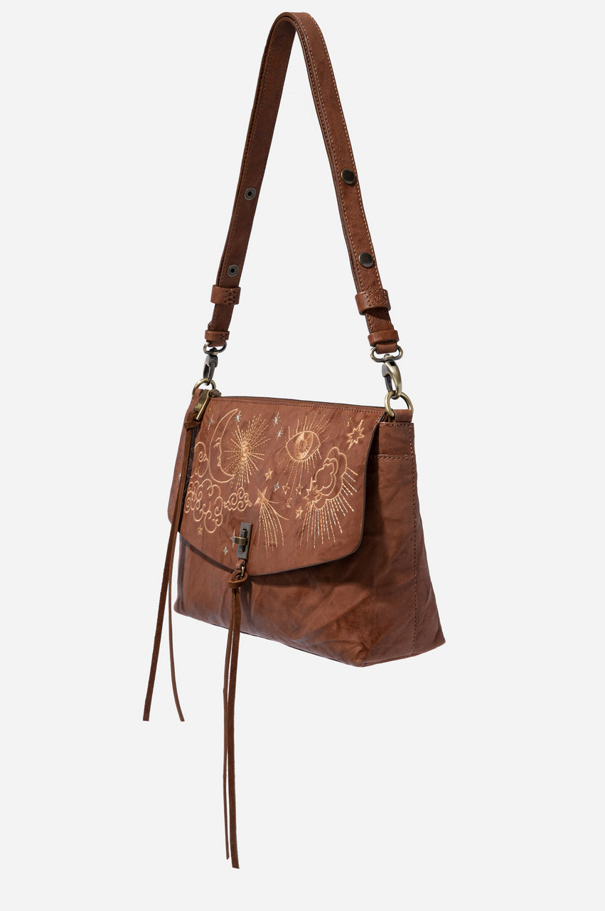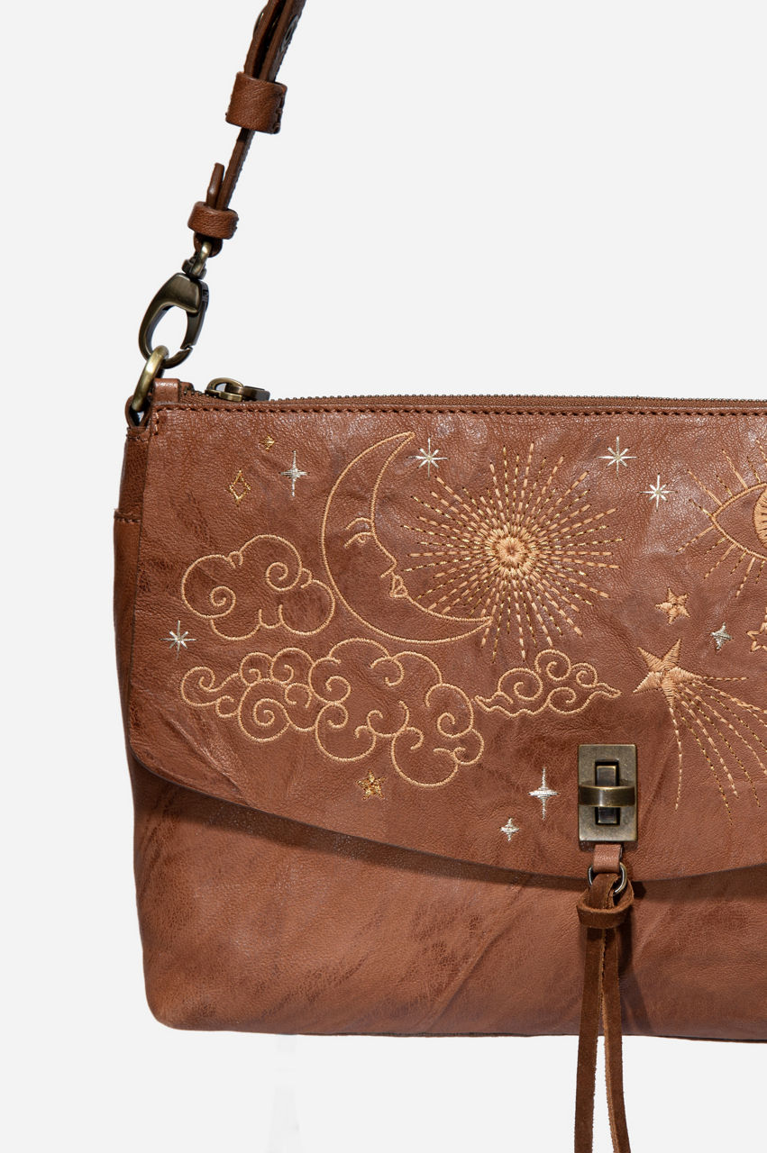 This relaxed and versatile shoulder bag features a durable leather construction that will also add an interesting texture to your outfits. It s a convenient accessory with plenty of storage and embroidery details to draw the eye. The Cloud Shoulder Bag can complement your favorite embroidered leggings and loose T-shirt for a modern look.