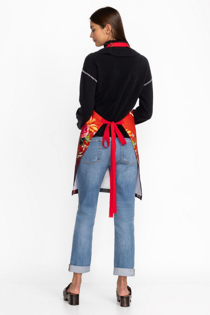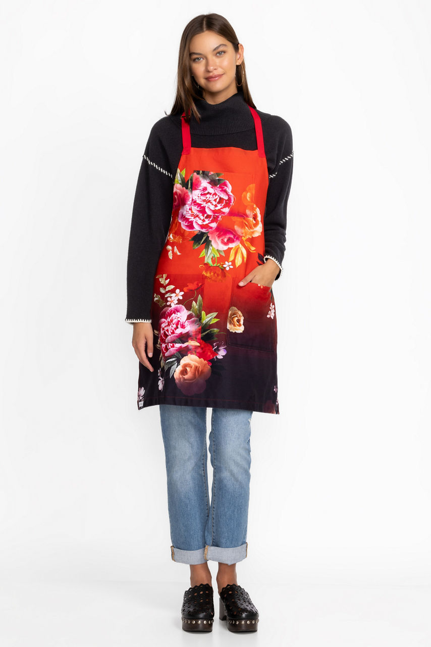 Presenting vibrant floral bouquets on a rich ombre background, the Coralie Apron is equal parts stylish and functional. Crafted from 100% cotton, this apron features 3 large pockets and ties easily at the neck and waist. Layer over your clothing to protect from kitchen spills and messes