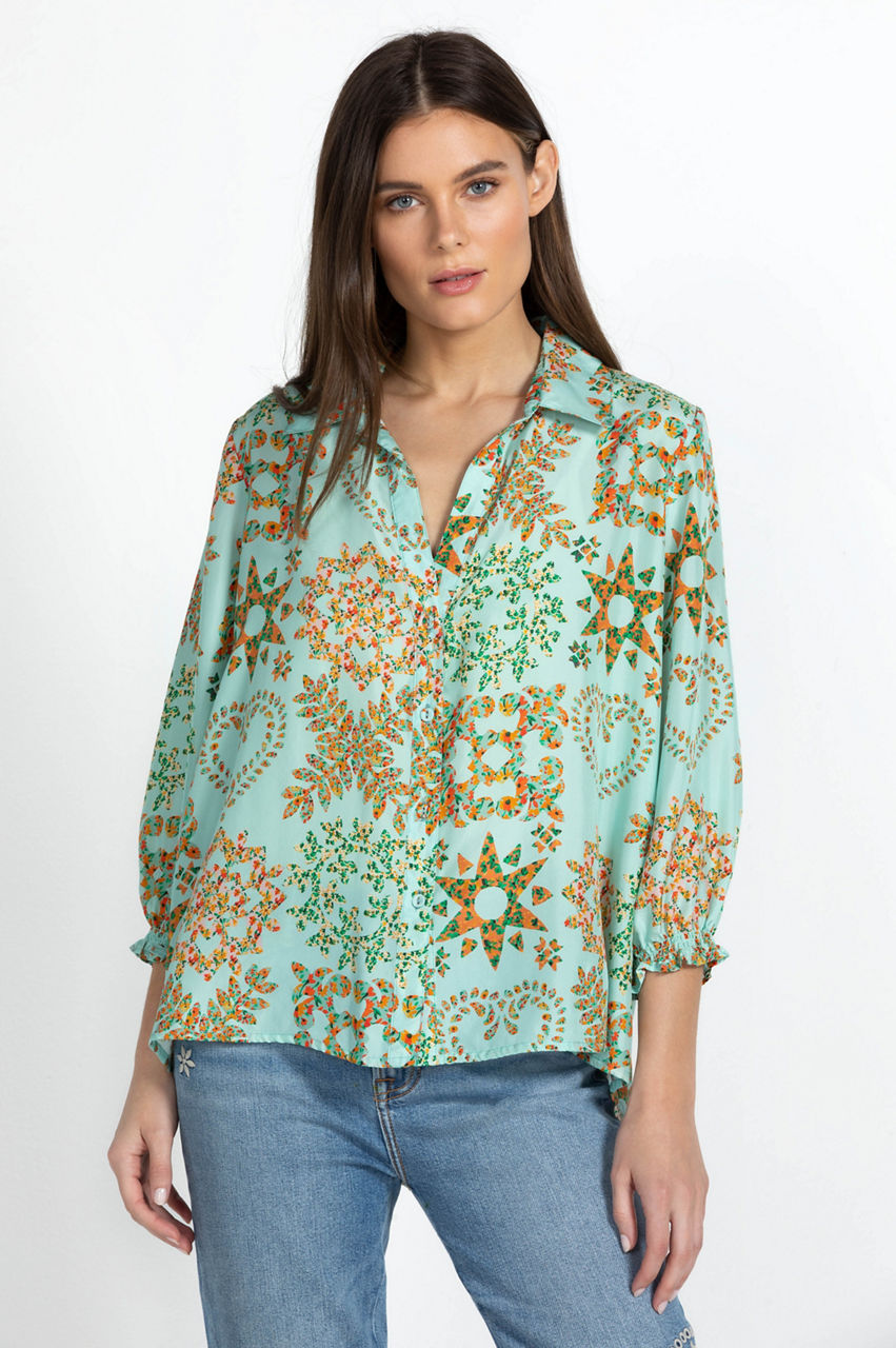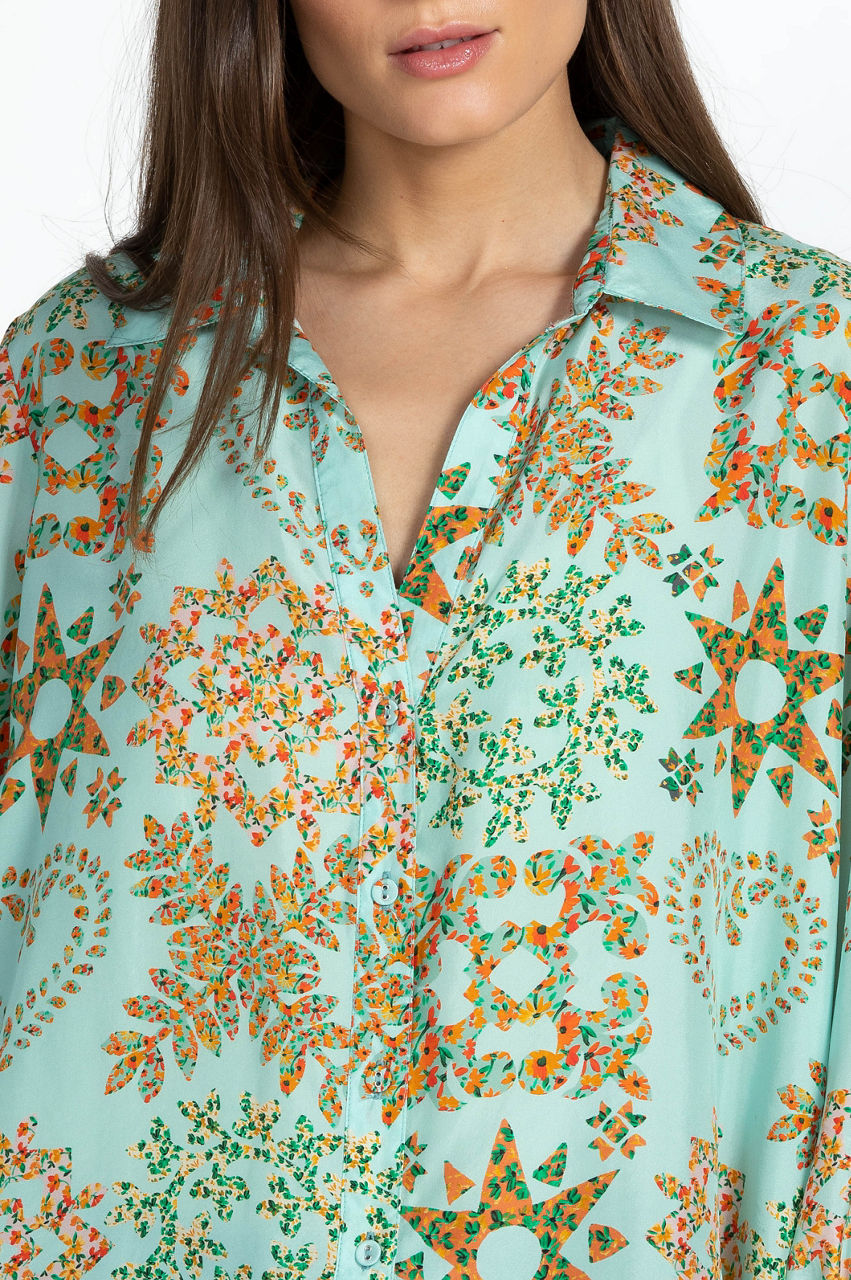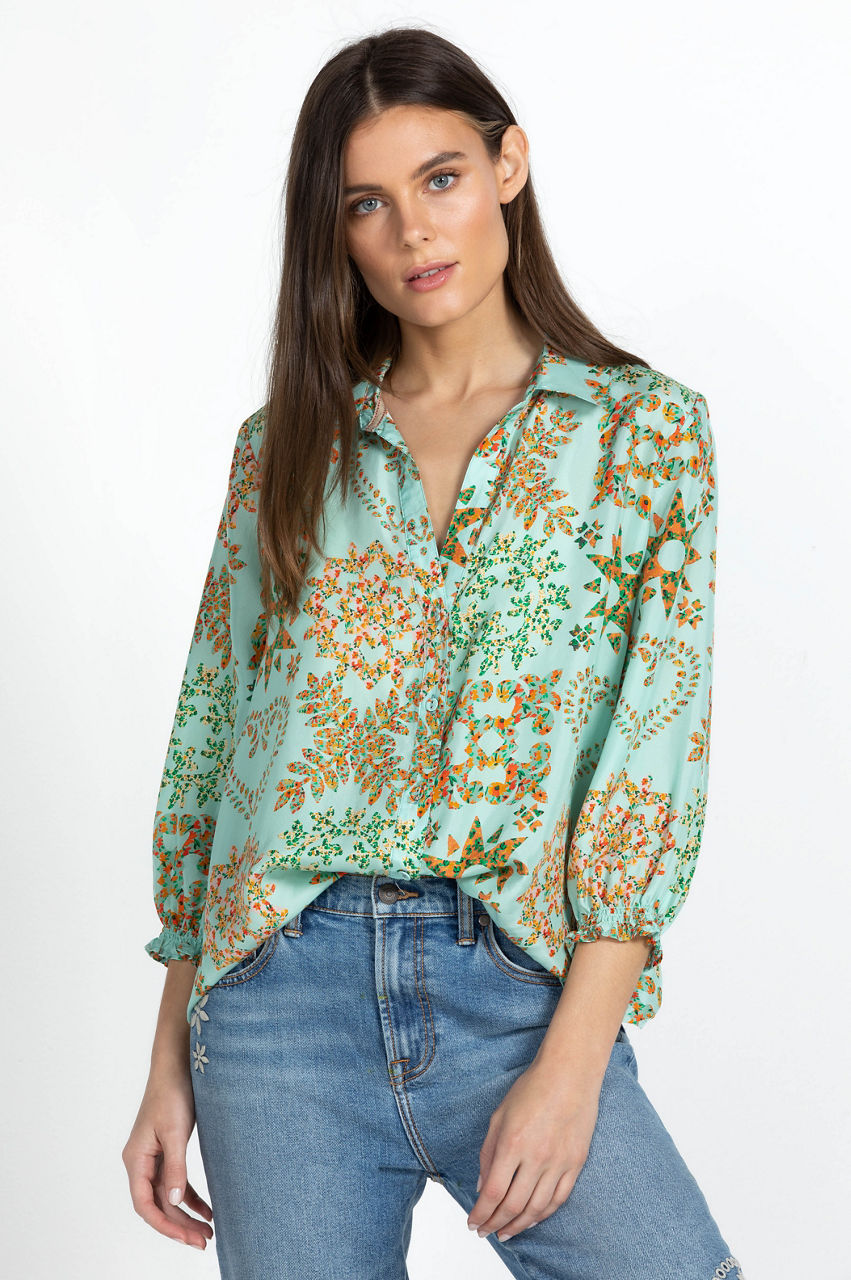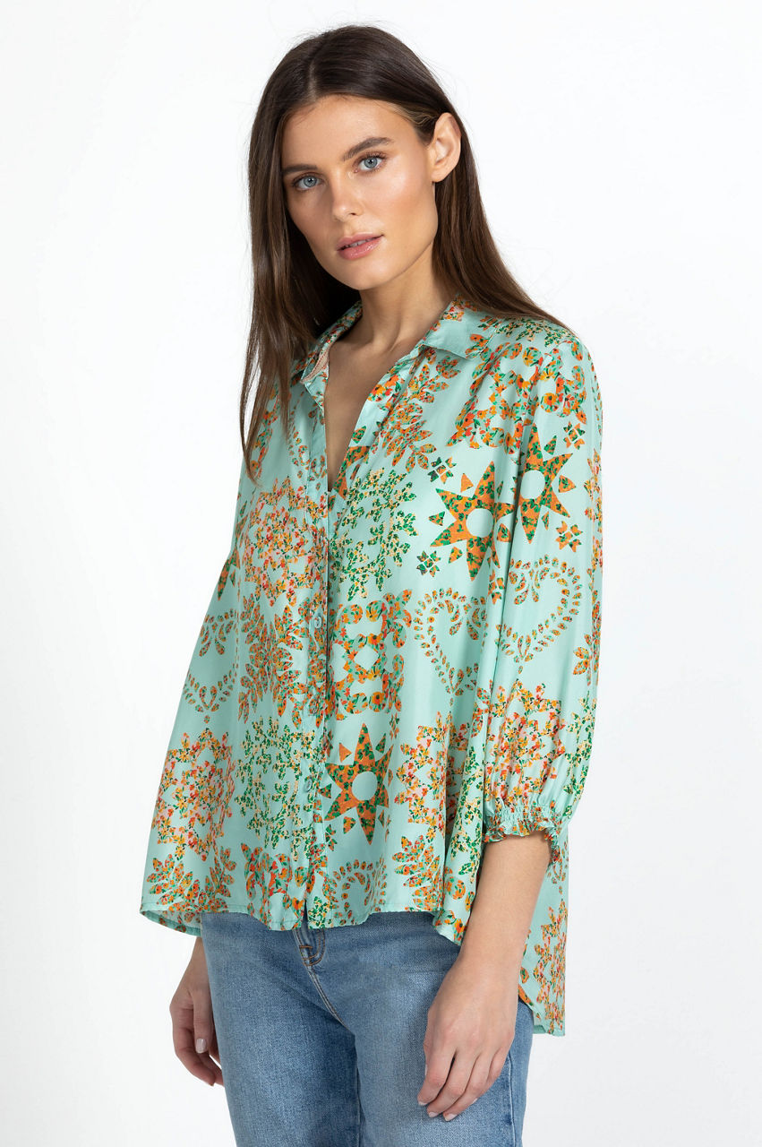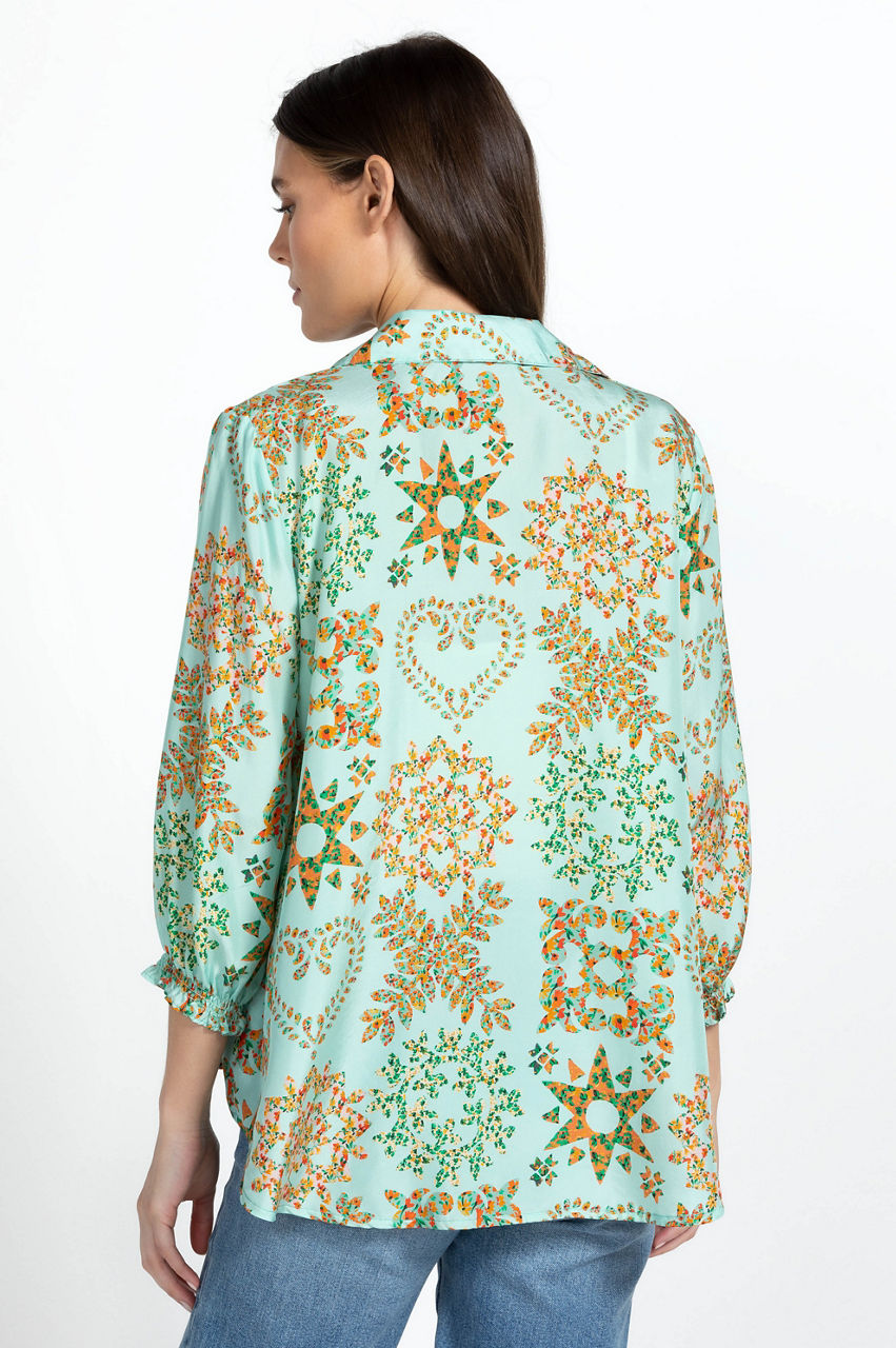 Spun from lustrous silk, the Corbetta Relaxed Smocked Shirt embodies an eclectic aesthetic thanks to its kaleidoscopic pattern and contrasting colors. A fanciful take on a timeless silhouette, this shirt features a classic collar, a front button closure, and long sleeves with elastic shirred cuffs for a voluminous effect. Team with wide-leg pants or opt for jeans for a versatile daytime look.