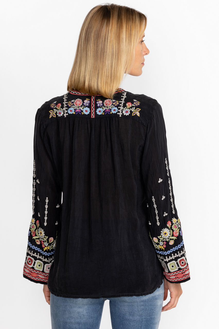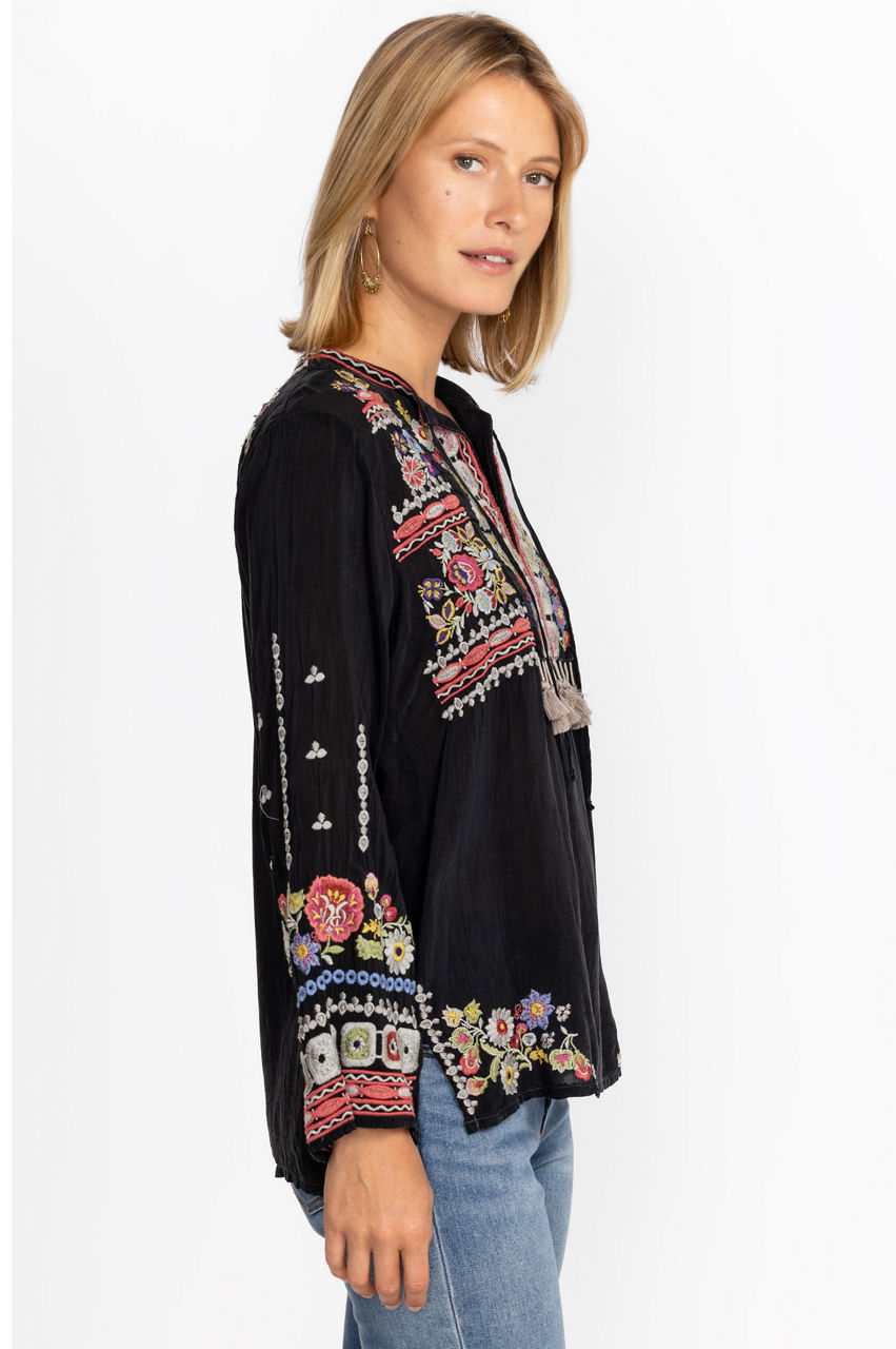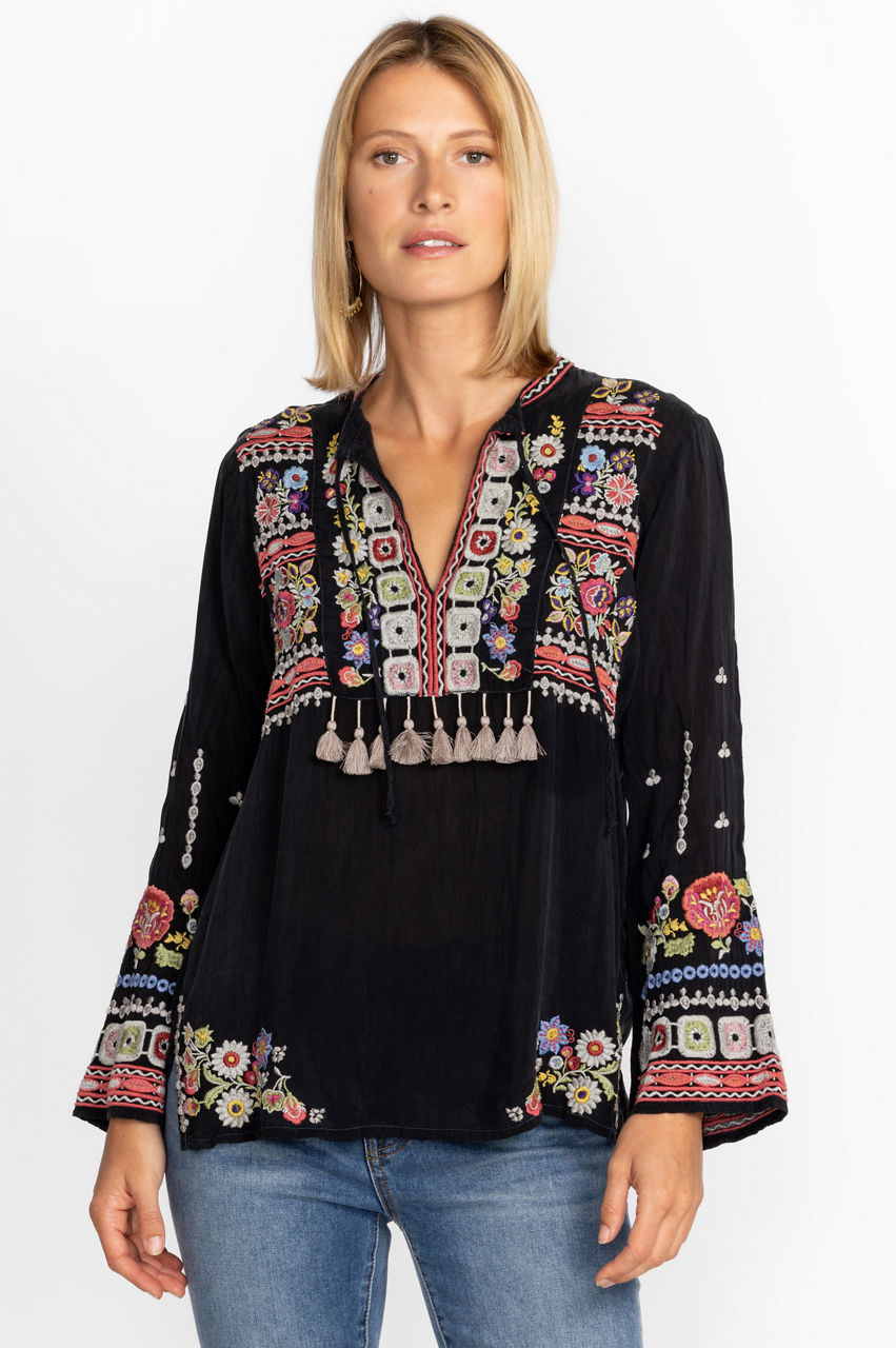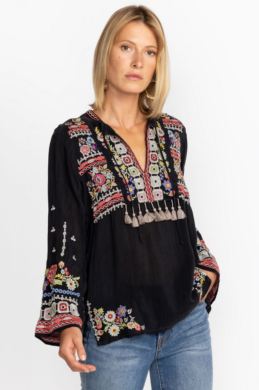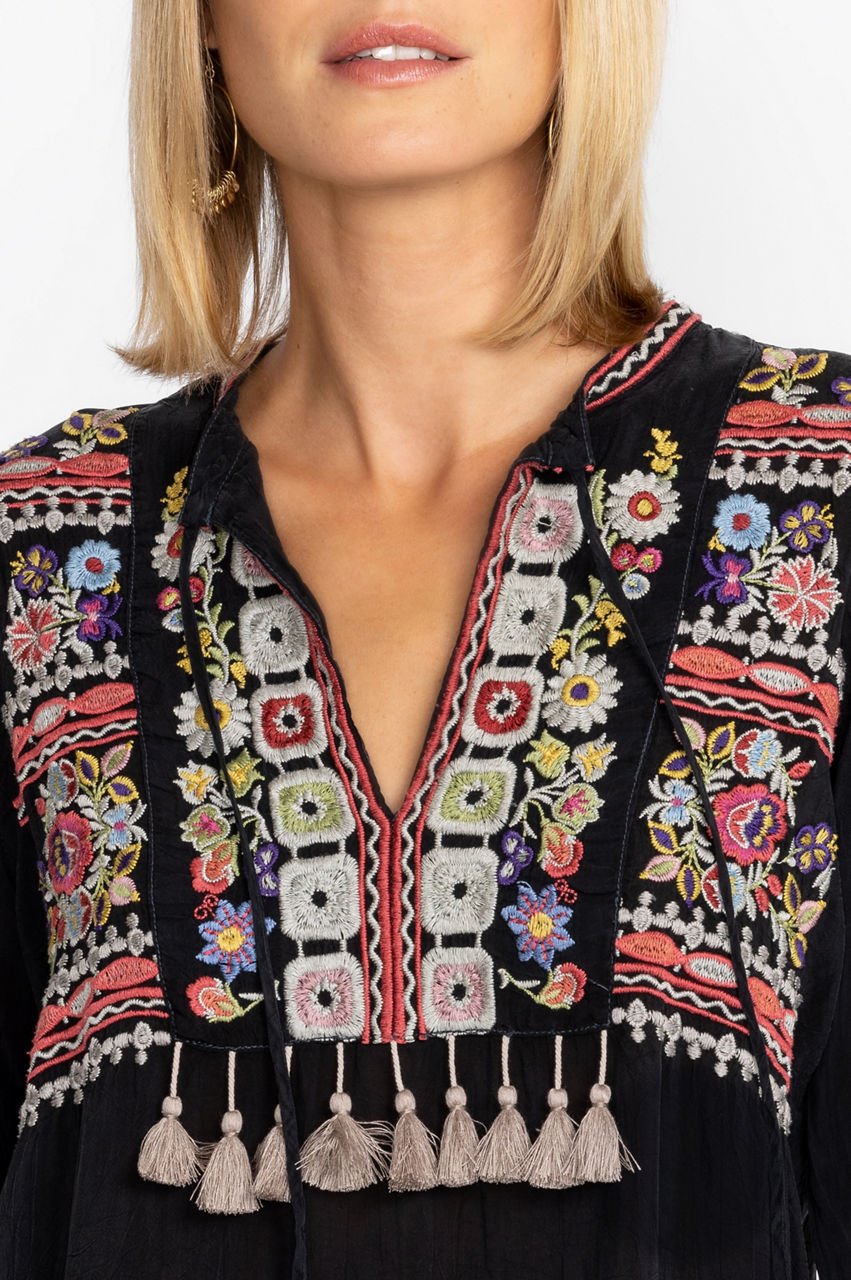 Crafted from a lightweight fabric, the Coriander Blouse is peppered with eye-catching motifs. A failsafe choice for day-to-day pursuits, this blouse boasts a tie at the neckline with tassels, long sleeves, and a detailed placement embroidery in rich shades. Opt for a bohemian look by pairing this blouse with neutral linens and statement jewelry.