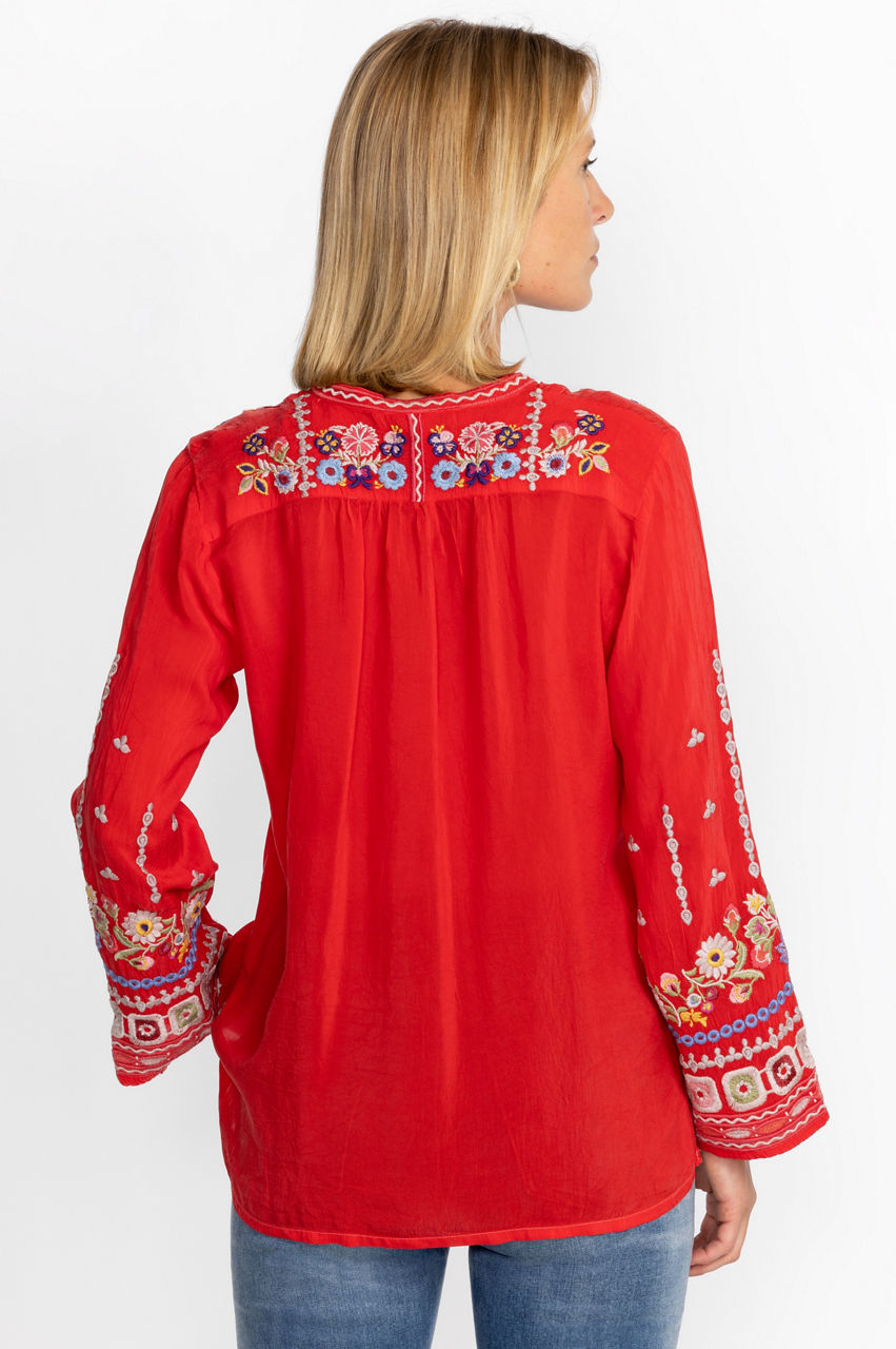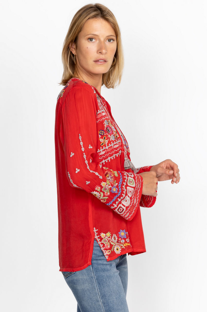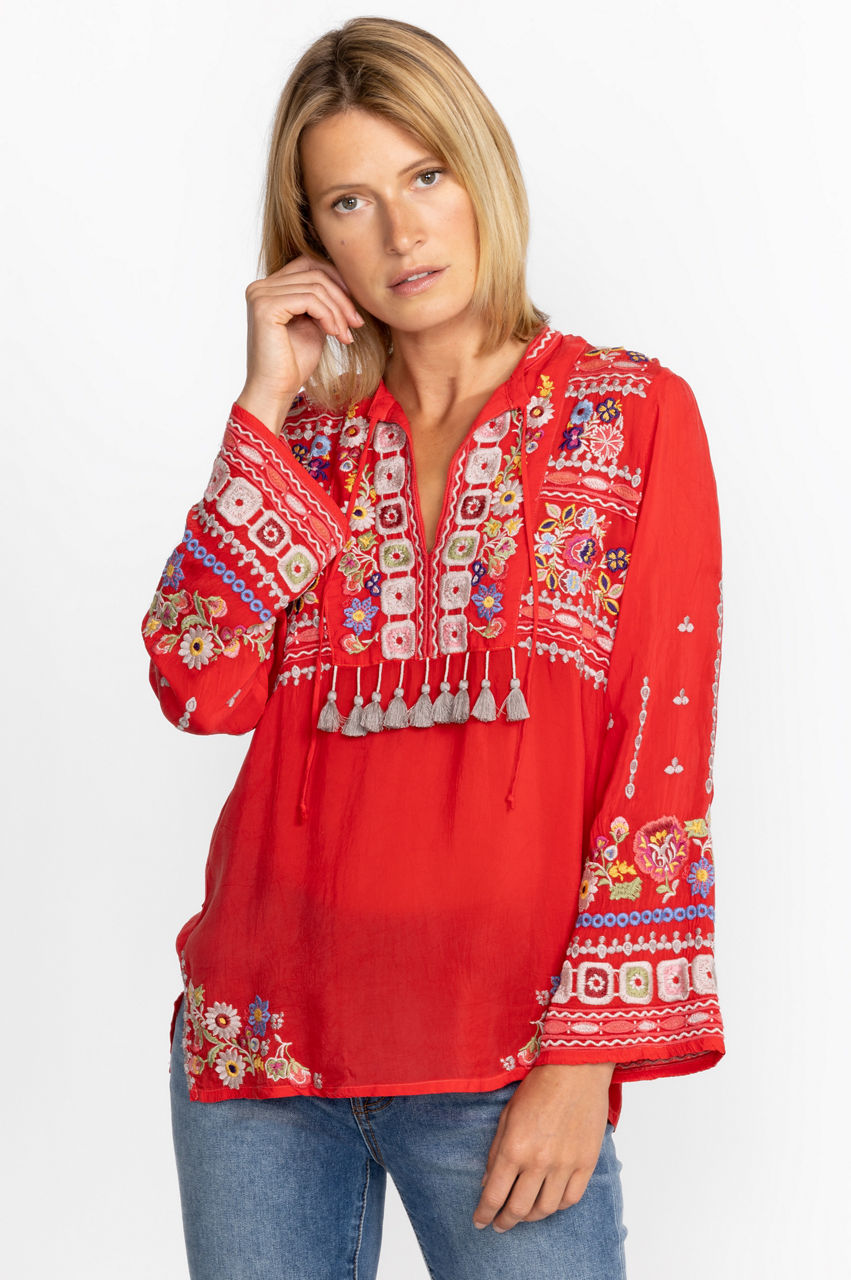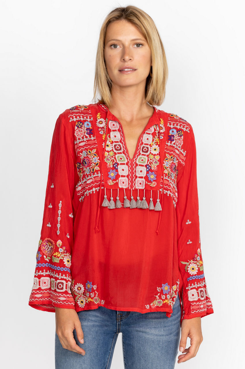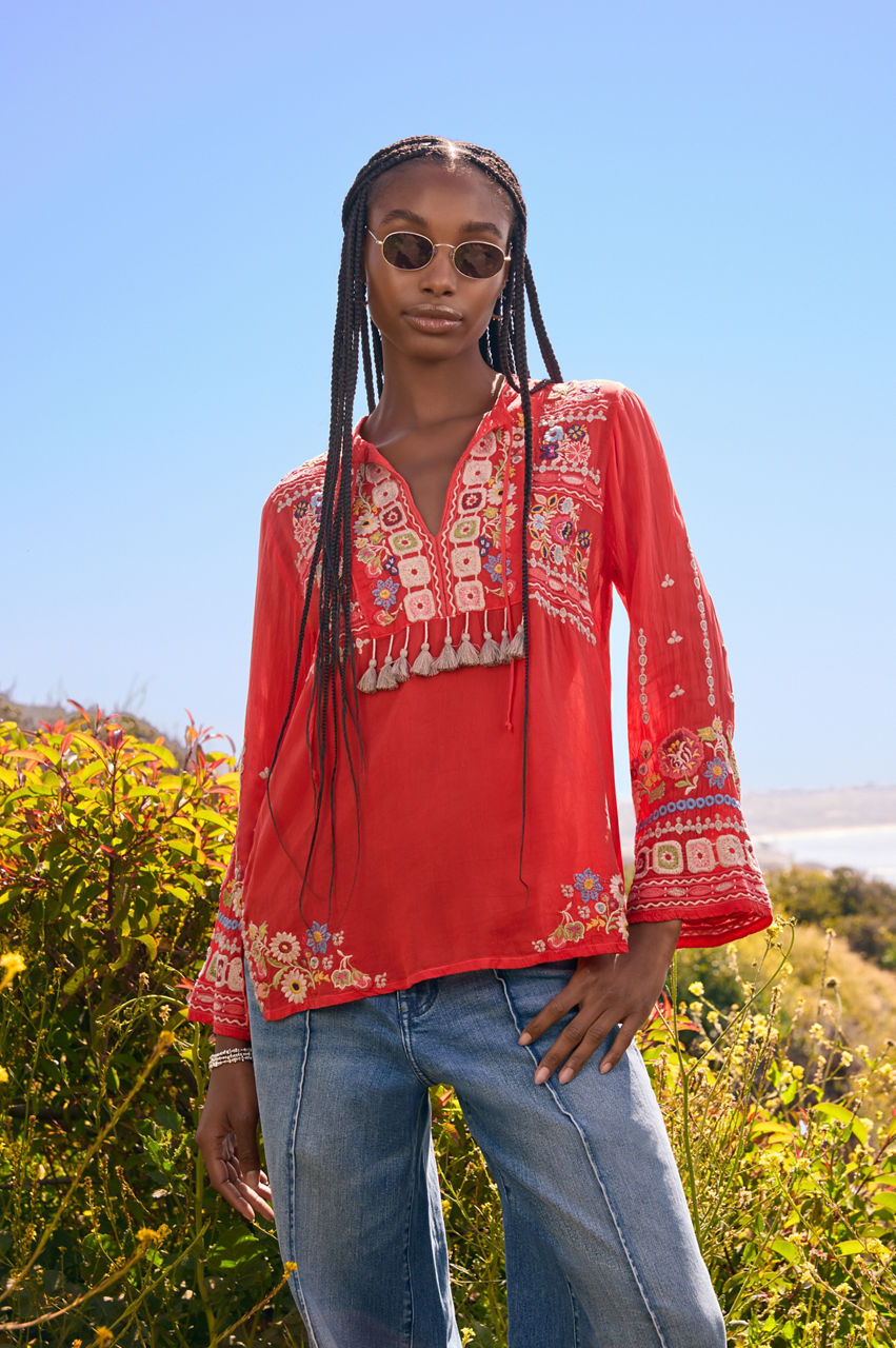 Crafted from a lightweight fabric, the Coriander Blouse is peppered with eye-catching motifs. A failsafe choice for day-to-day pursuits, this blouse boasts a tie at the neckline with tassels, long sleeves, and a detailed placement embroidery in rich shades. Opt for a bohemian look by pairing this blouse with neutral linens and statement jewelry.
