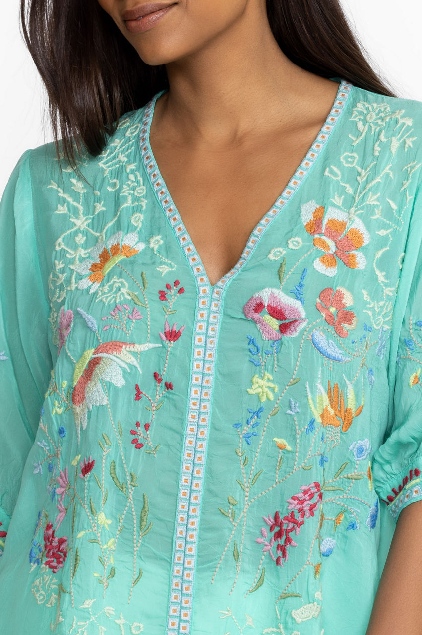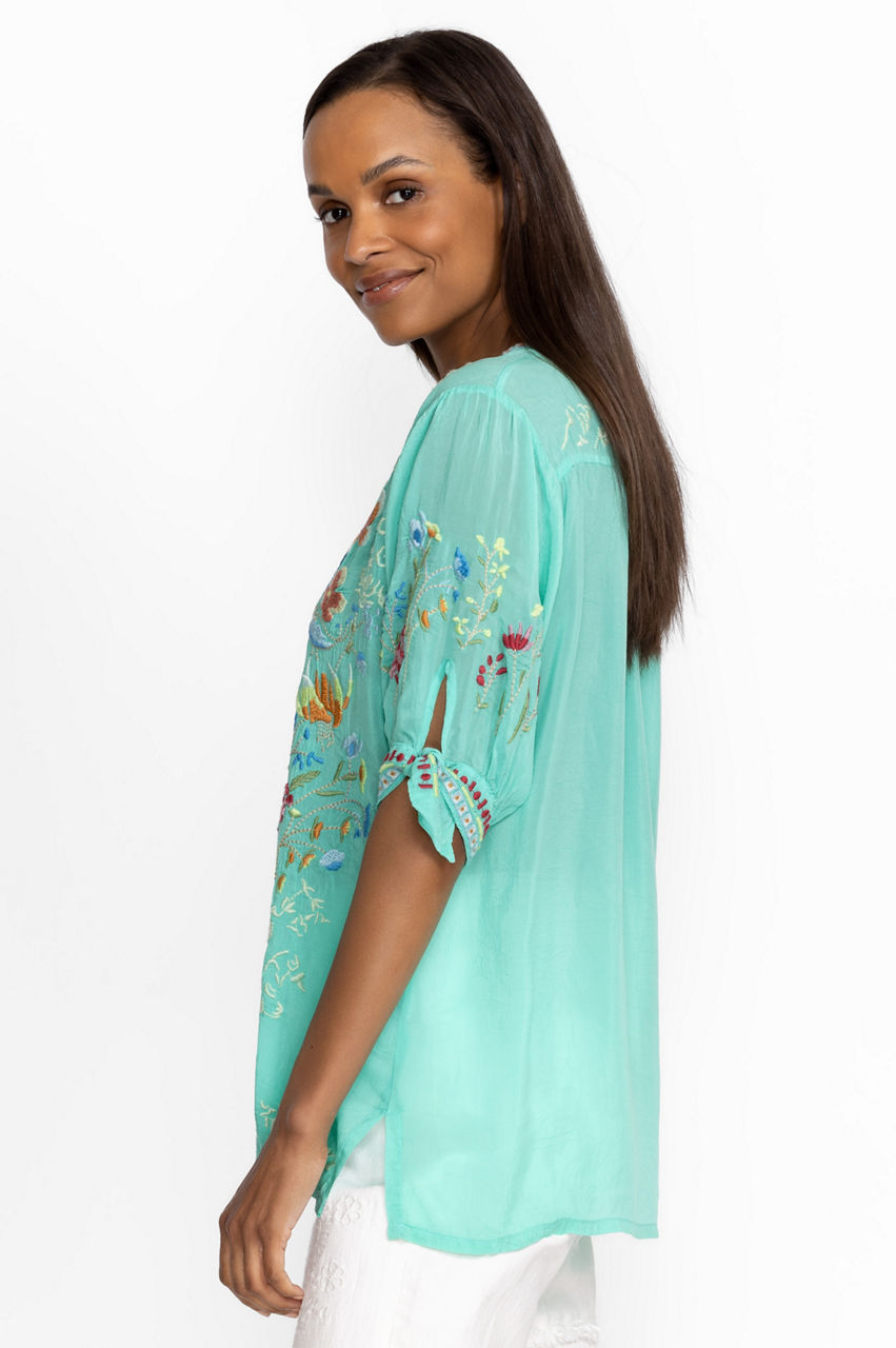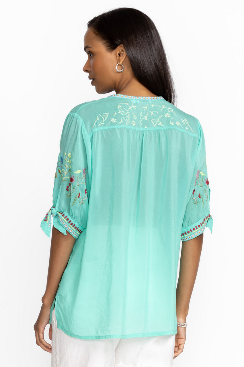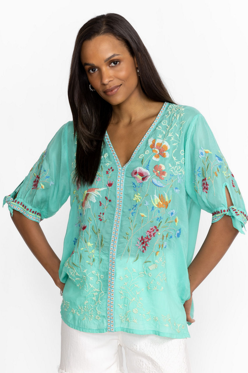 Marrying a ladylike quality with a bohemian mood, the Cosette Blouse makes a case for stylish warm-weather fashion. This blouse is made from a comfortable fabric and showcases a striking placement embroidery comprising elegant florals. Finished with a flattering V-neck and short sleeves with bow ties, this blouse works wonders with both pants and skirts.