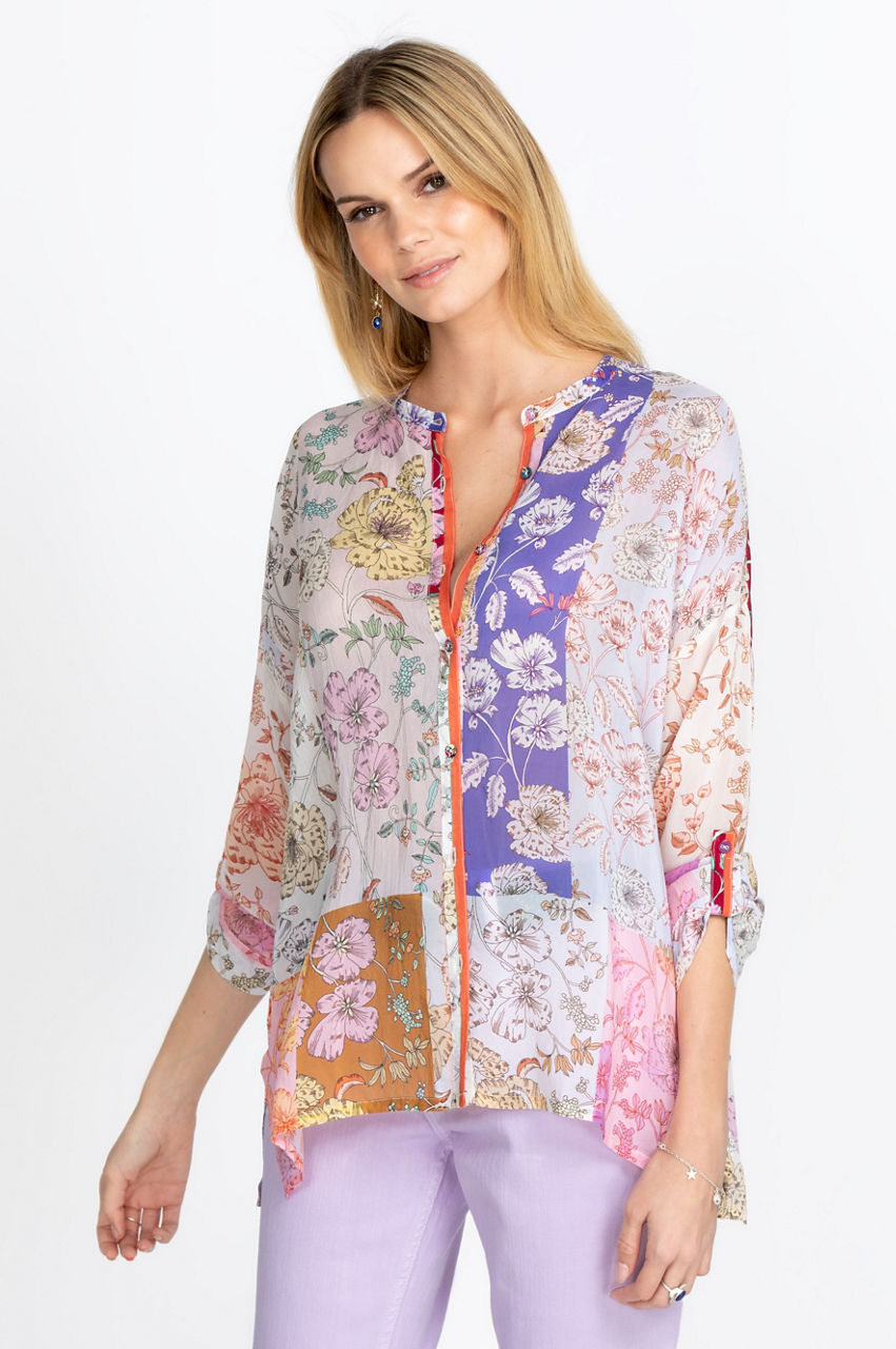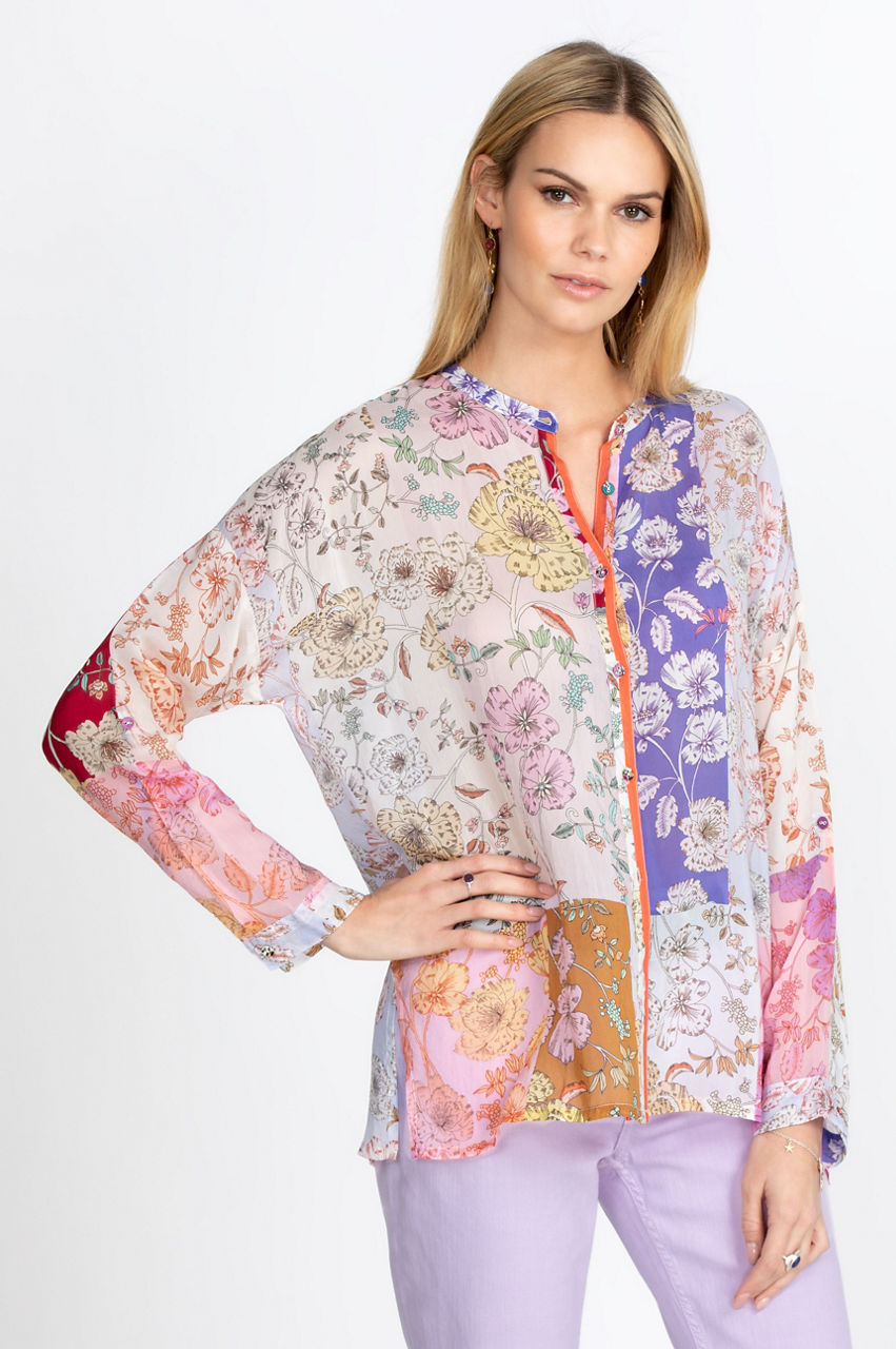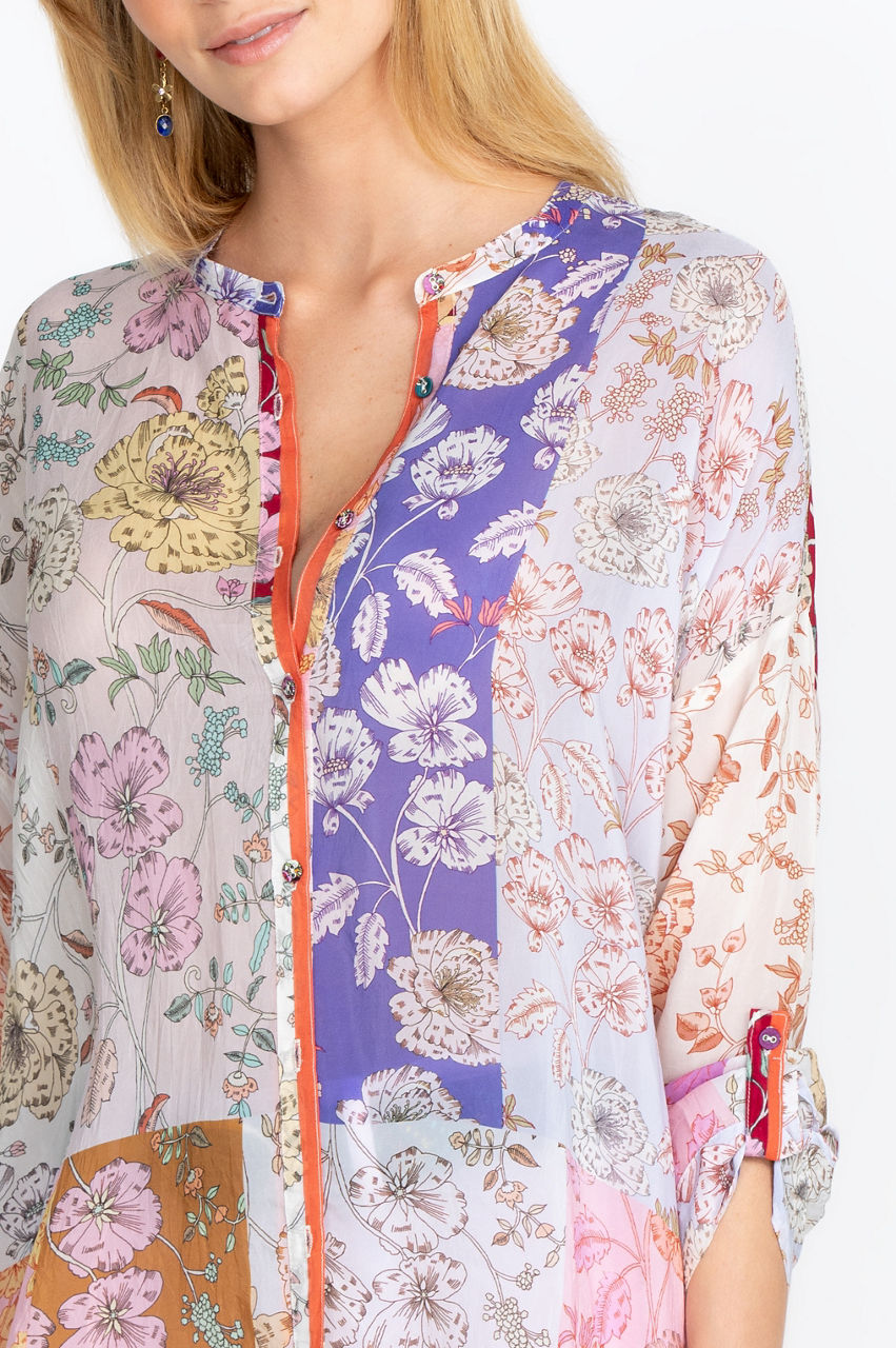 The Cosmo Lauren Button Down is a stylish piece that will soon become a go-to shirt for layering or enhancing a simple pair of jeans. The dark fabric creates a stunning contrast with the colorful floral motifs while details like the placket closure and cuff slits add structure to the piece. Wear this gorgeous shirt over a simple white tee to play with contrasts or dress it up with a navy blazer.