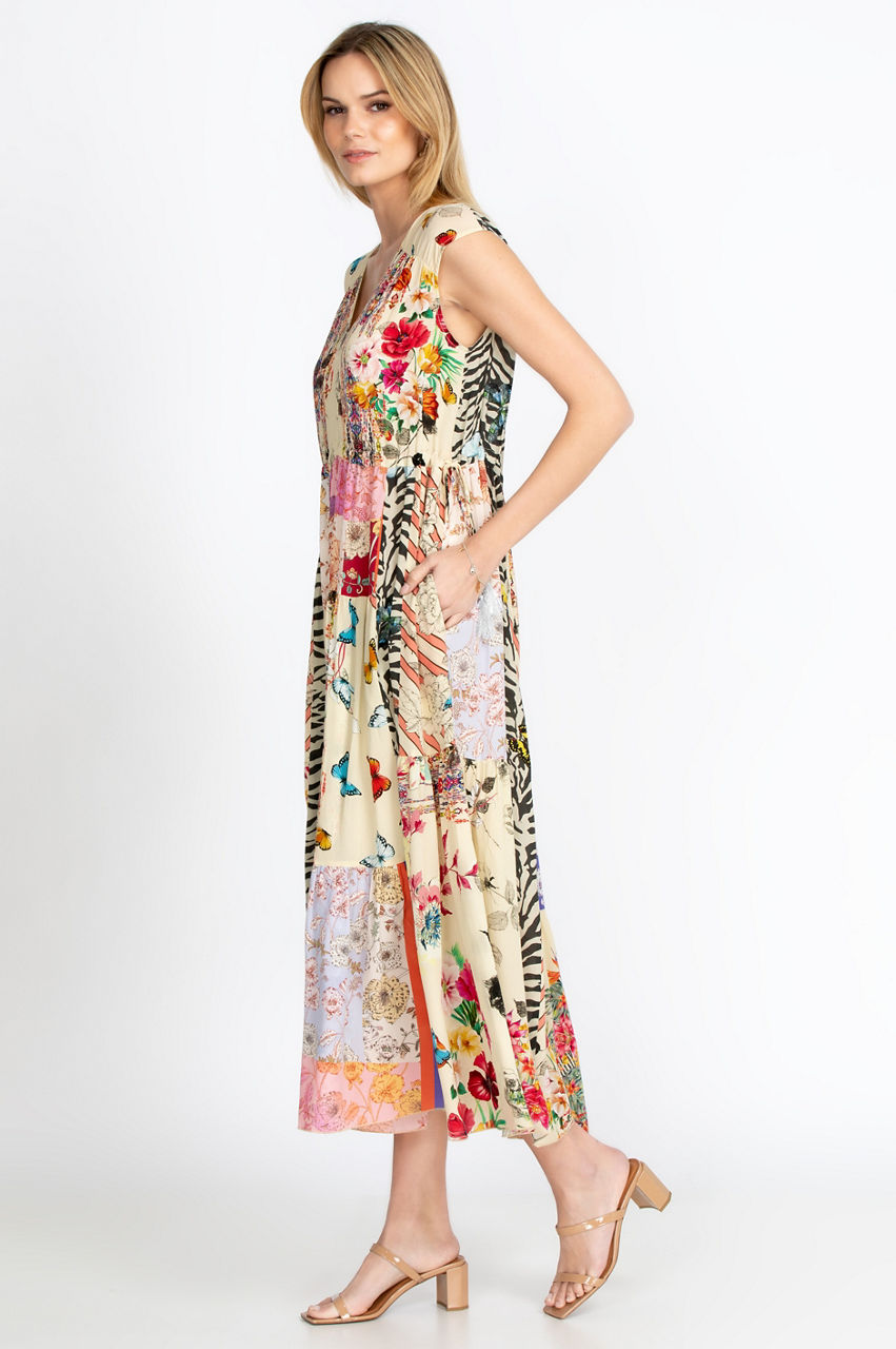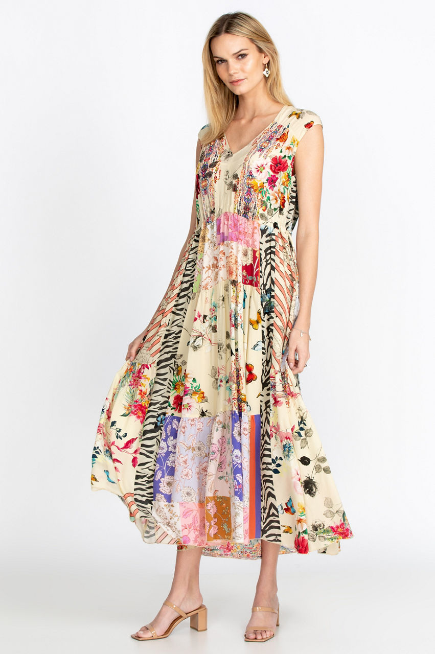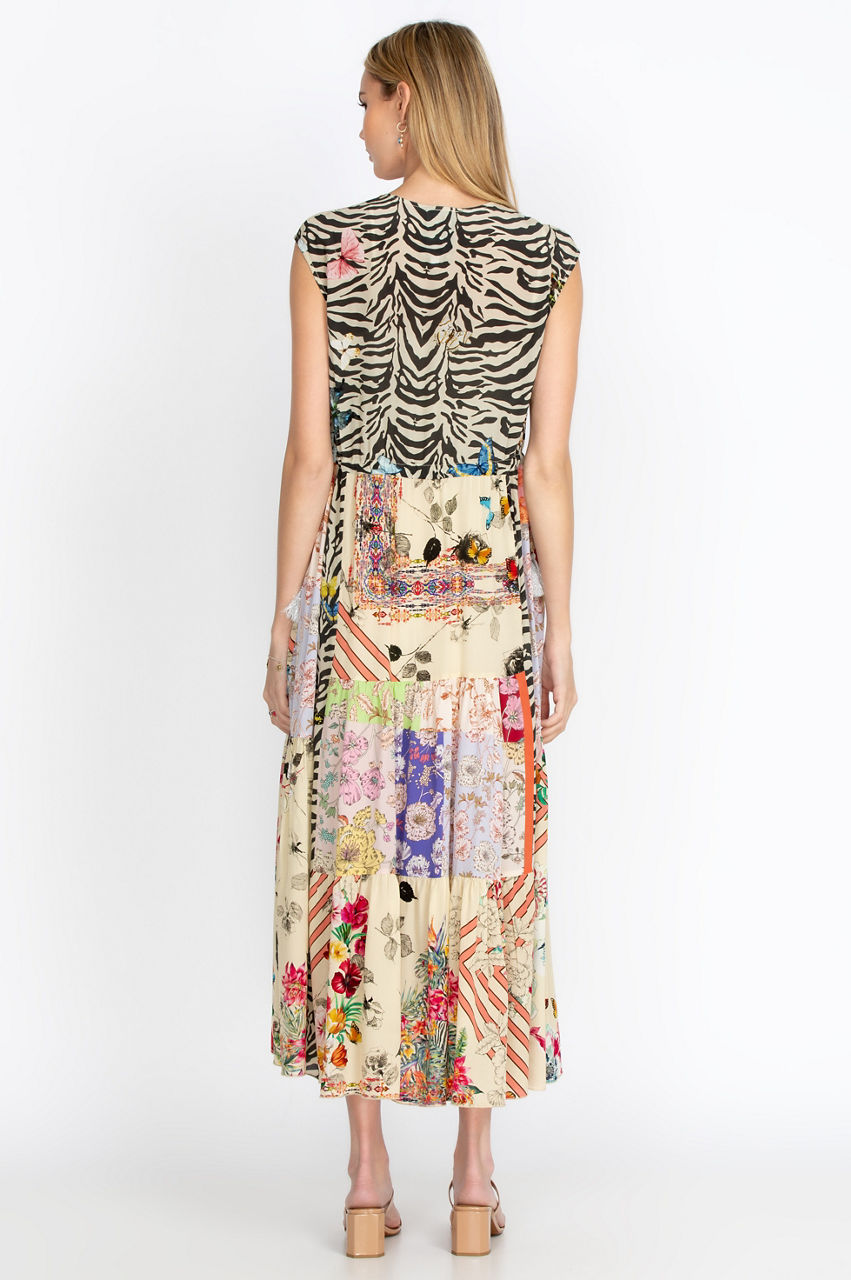 With its multicolored print and maxi length, the Cosmo Lola Dress is a statement piece. The floral and animal-inspired prints come together to form a delicate patchwork-inspired print while the waist tie details help you create a flattering silhouette. Pairing this refined dress with a jean or a leather jacket is a fun way to create a boho-chic look.