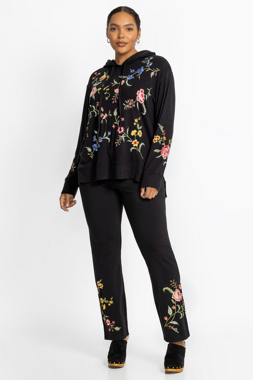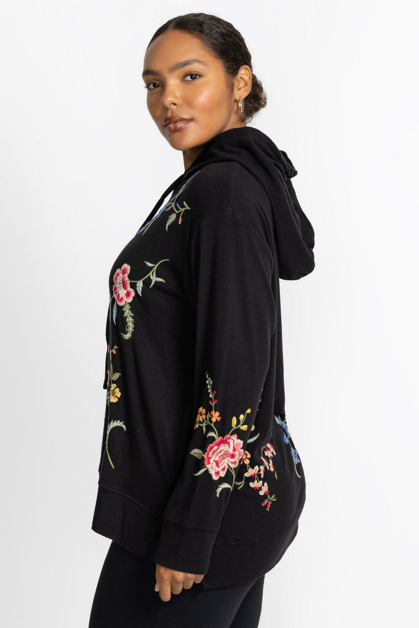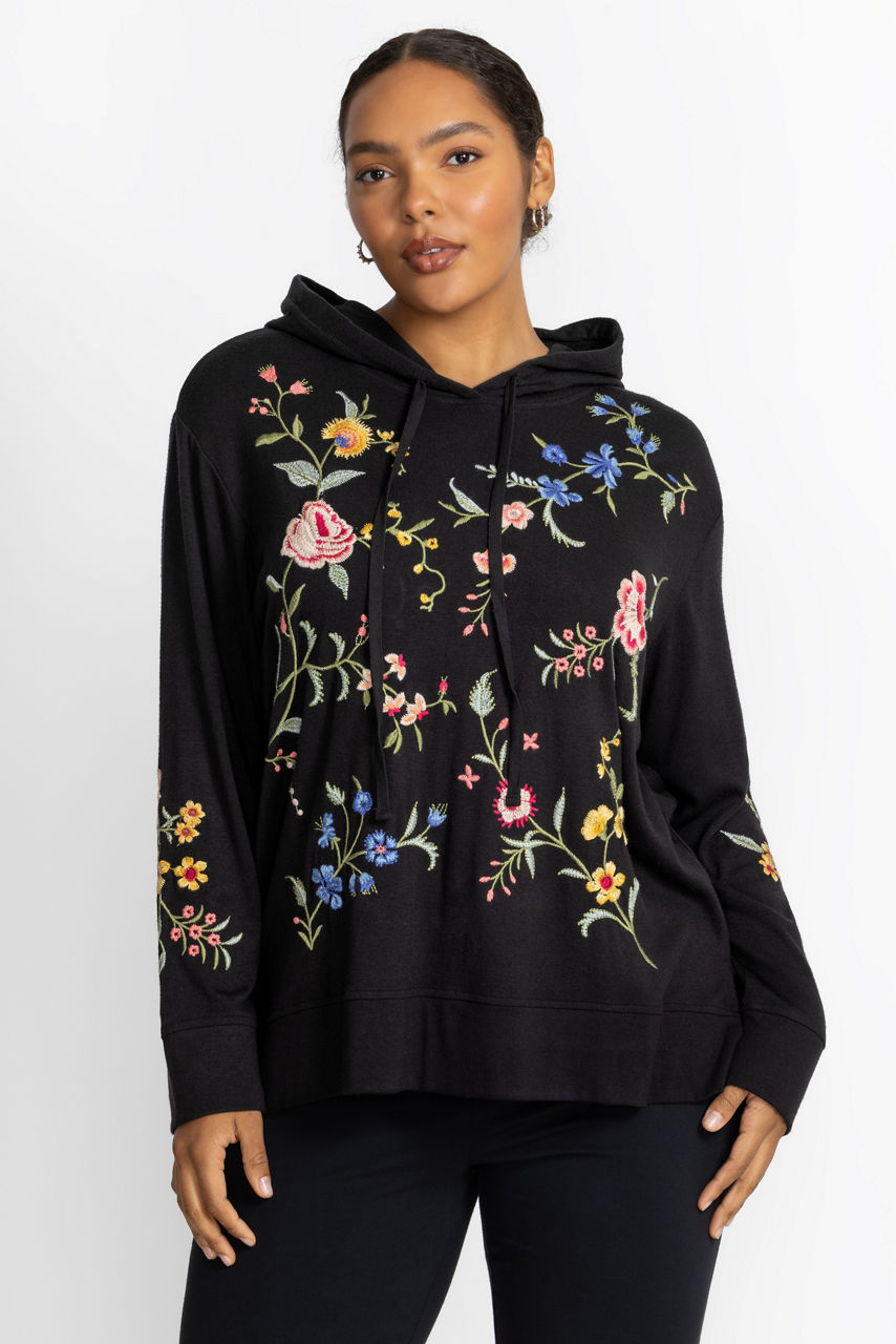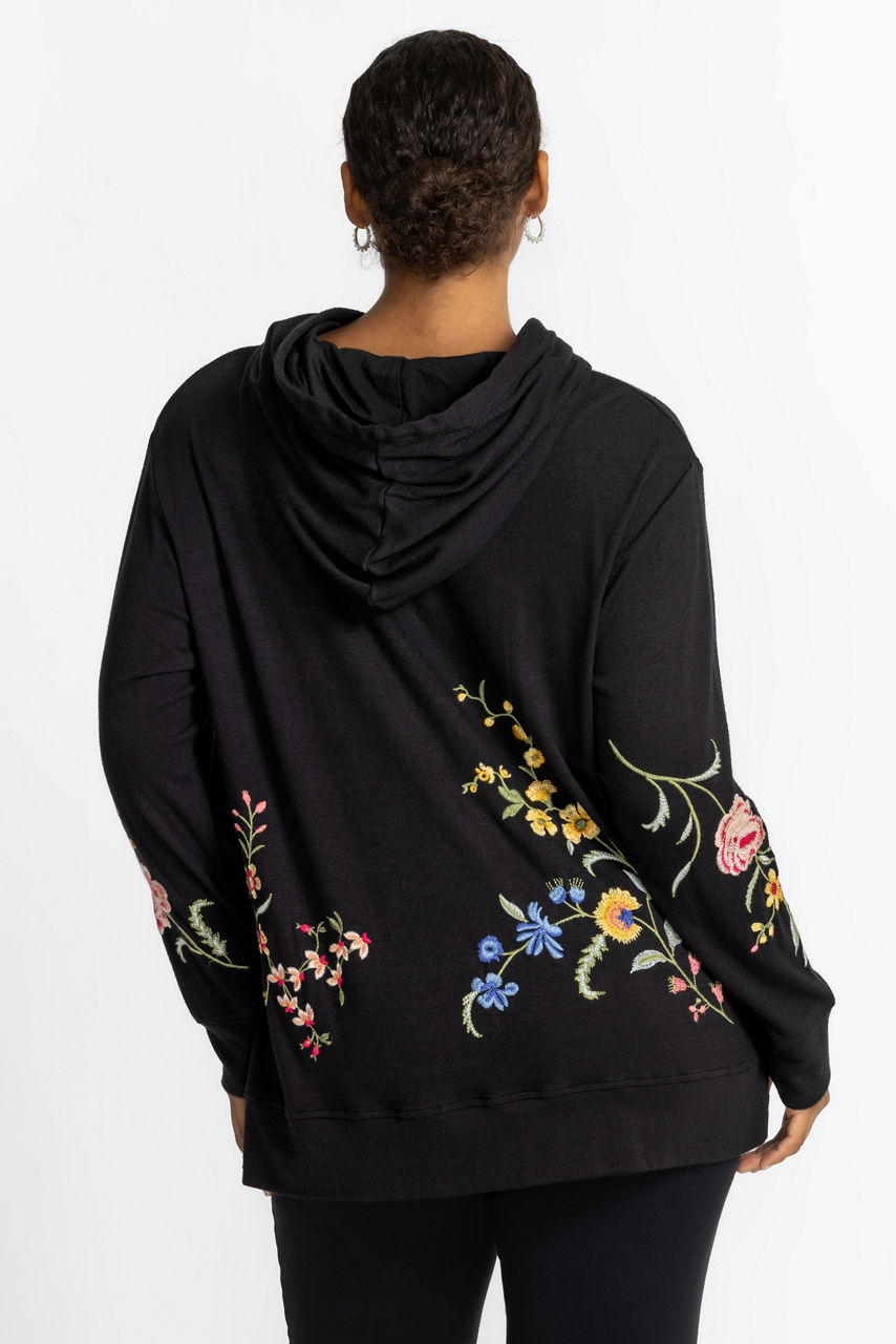 Embellished with brilliant florals on an inky black backdrop, the Cozy Hooded Sweatshirt Tunic offers elevated comfort. Featuring an attached hood with a drawcord, this unique hoodie is adorned with vibrant embroidered detailing and is finished with side slits for a relaxed fit. Pair with colored denim and fashion sneakers for a modern casual look.
