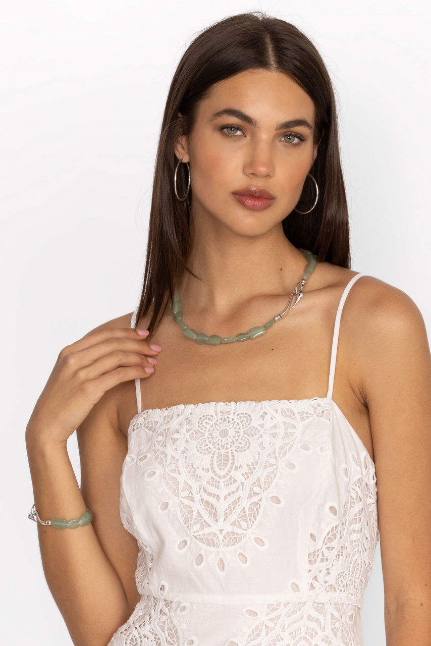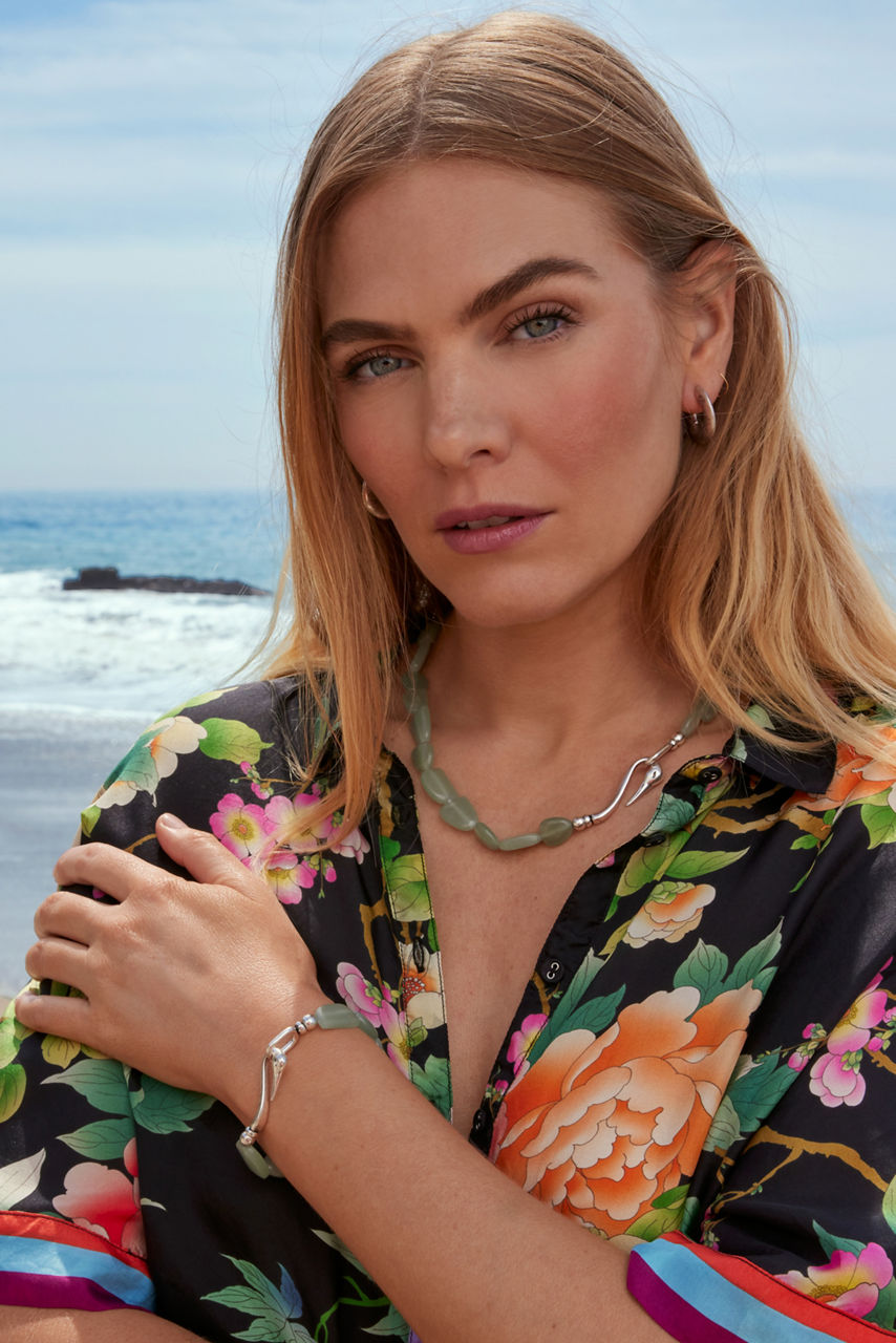 Elegant and unique, the Crane S Hook Chalcedony Bracelet adds a hint of whimsy and color to your look. Specially crafted with a detailed silvertone s-hook closure in the shape of a graceful crane, this eye-catching bracelet is highlighted with light green natural stones for a rich eclectic feel. Add to a classic little black dress and silver metallic heels for a perfectly coordinated evening look.