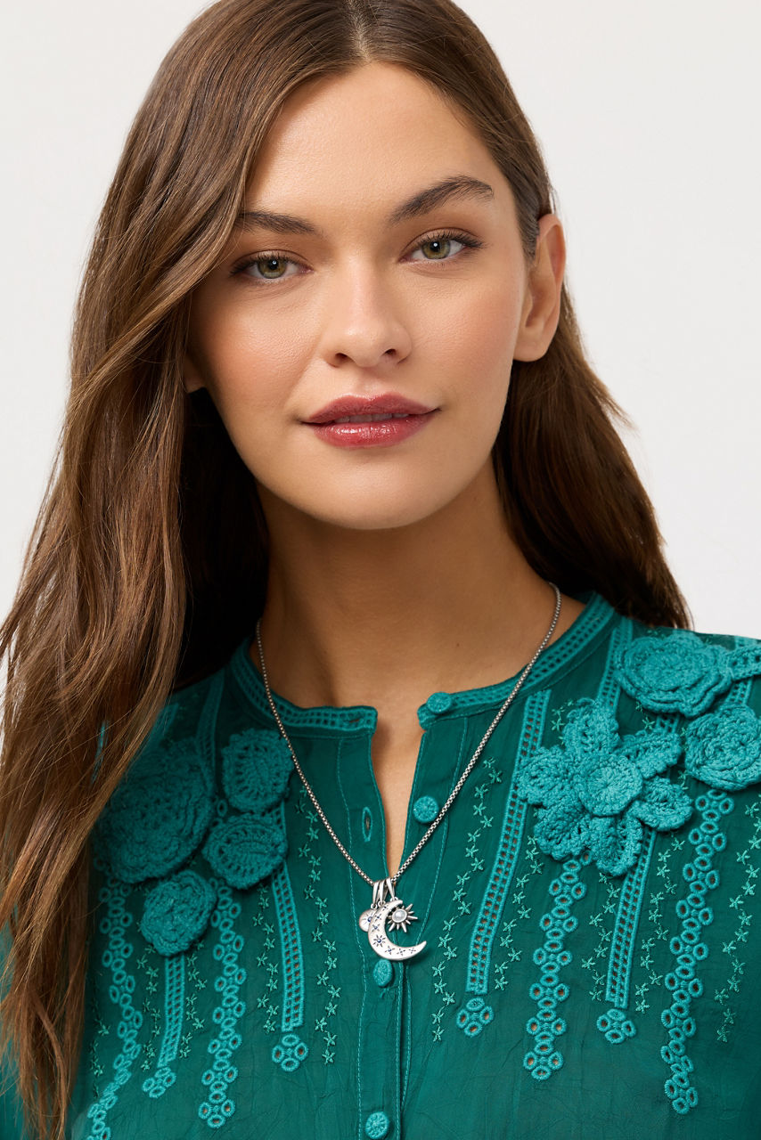 A luminous expression of modern elegance, the Delicate Celestial Charm Necklace is equal parts delicate and striking. Crafted from silver-tone metal, it is adorned with celestial charms that capture the wonder of the night sky. Pair with a deep blue dress and sparkling silver-tone heels for an evening look with a hint of cosmic allure.