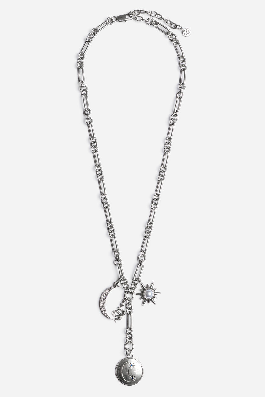 Crafted in a glittering silver-tone, the Celestial Charm Necklace celebrates the wonders of the sky. Featuring a spring clasp and lariat styling, this paperclip chain necklace is finished with brilliant celestial charms. Add to a classic black dress and complete the look with the Celeste Velvet Shawl for a polished evening look.