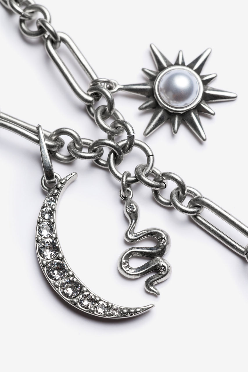 Crafted in a glittering silver-tone, the Celestial Charm Necklace celebrates the wonders of the sky. Featuring a spring clasp and lariat styling, this paperclip chain necklace is finished with brilliant celestial charms. Add to a classic black dress and complete the look with the Celeste Velvet Shawl for a polished evening look.