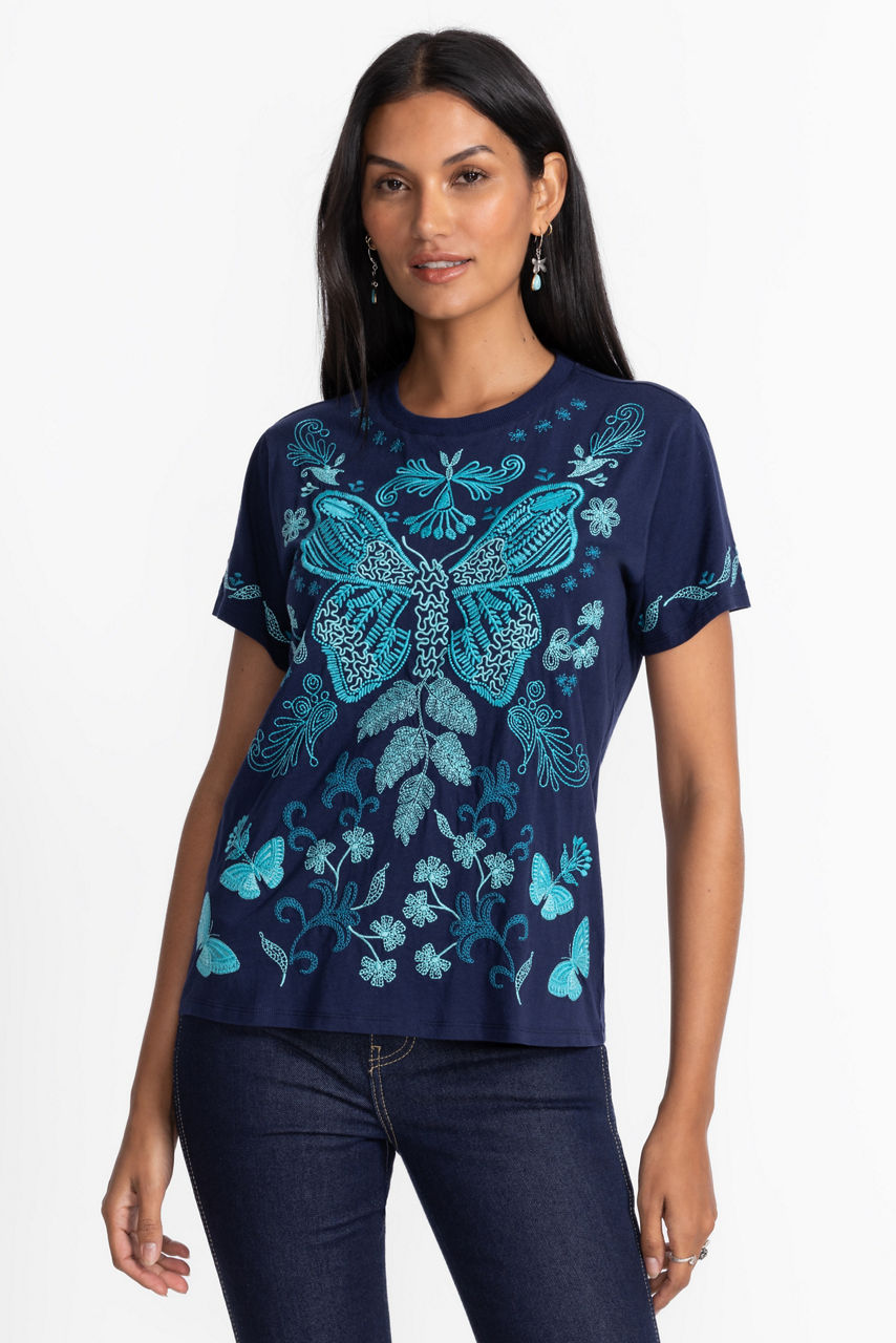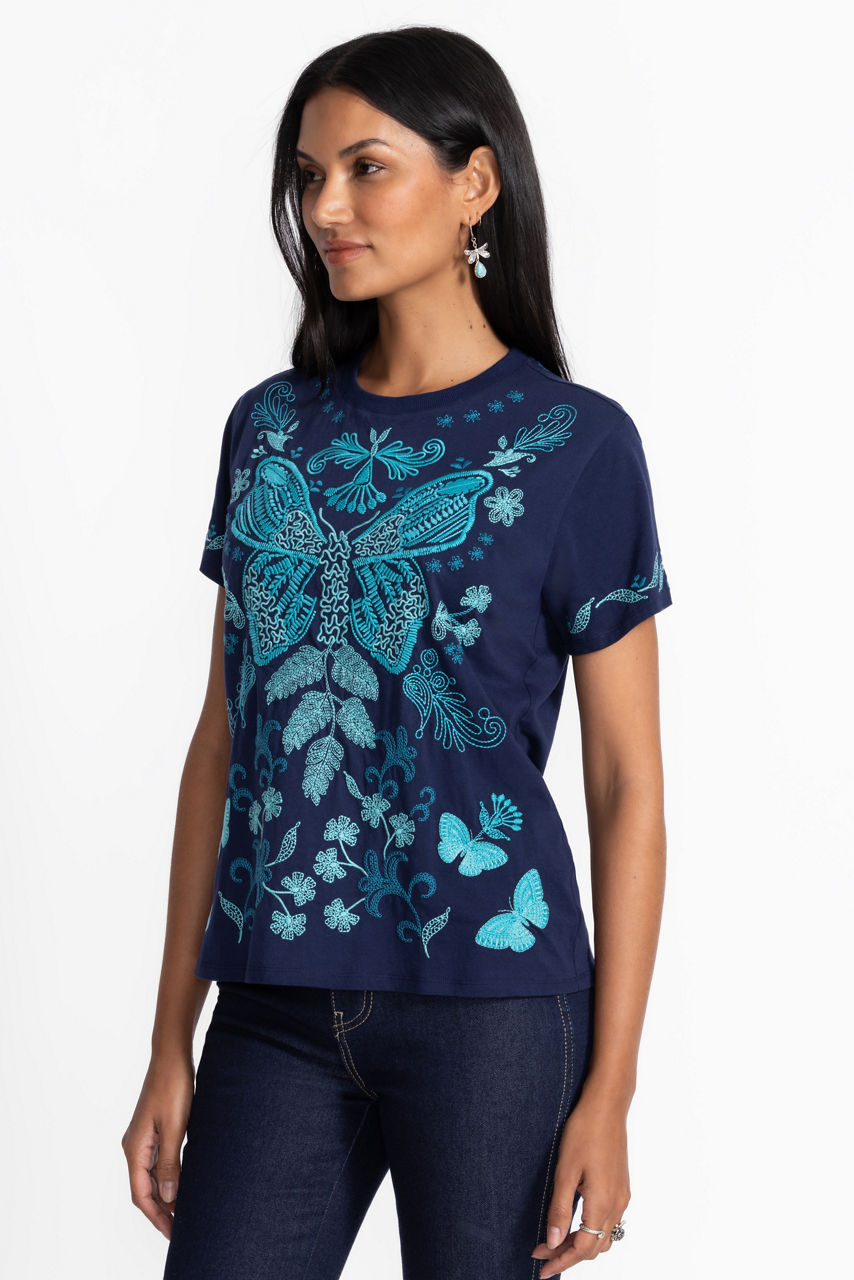 Crafted from 100% breathable cotton, the Crew Neck Tee offers a fresh take on a classic wardrobe staple. Designed with a crew neckline and short sleeves, this unique tee is embroidered with intricate depictions of butterflies in flight and floral bouquets. Pair with a denim skirt and fashion sneakers for a day of errands.