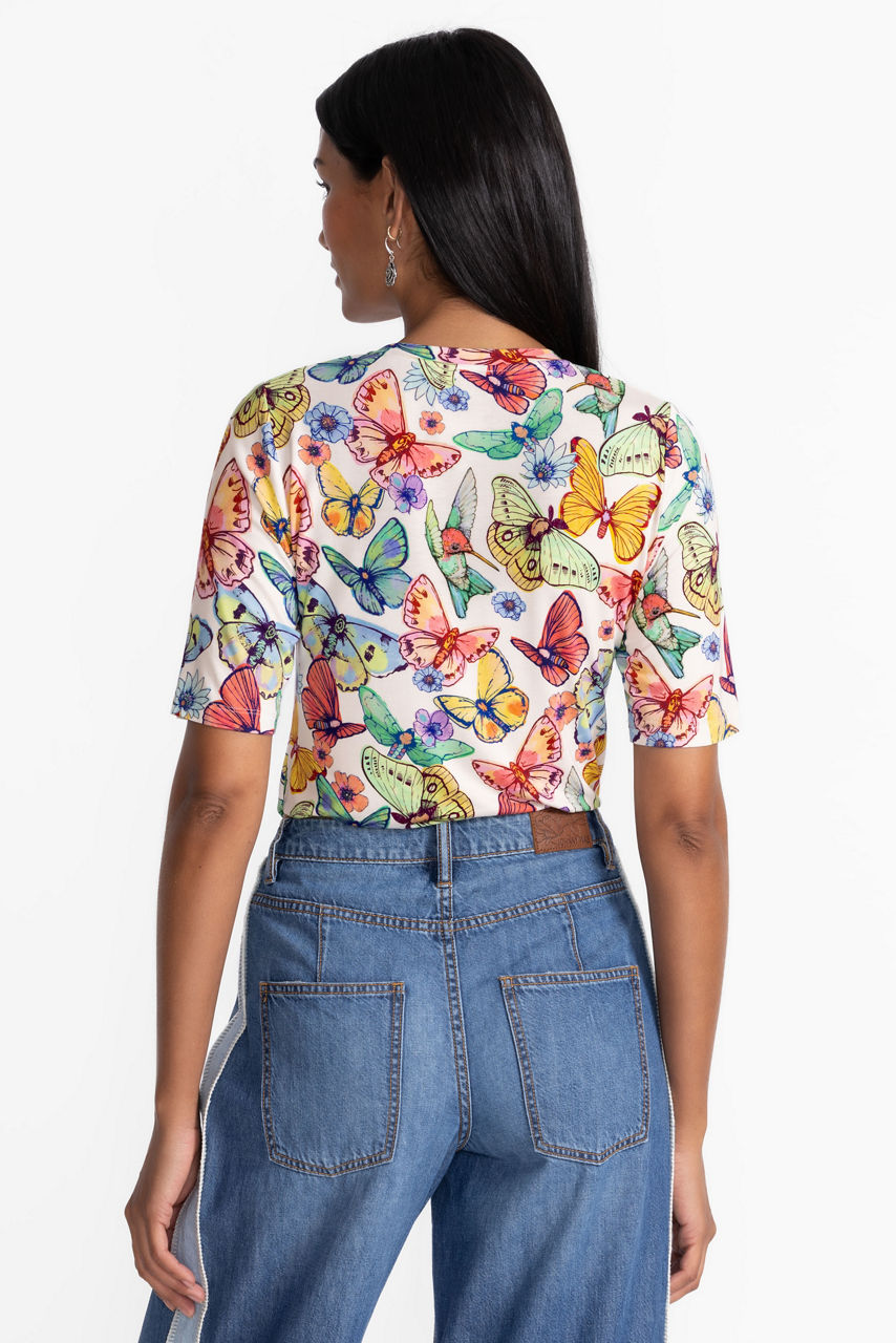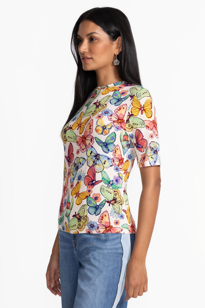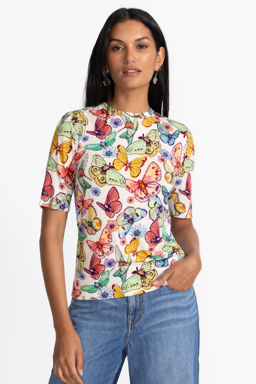 Washed in a rainbow of watercolor florals, the Crew Neck Tee is an elevated variation on the classic tee. Featuring a crew neckline and elegant elbow-length sleeves, this colorful tee is versatile and vibrant. Pair with wide-leg trousers and a coordinating blazer for a modern office ensemble.