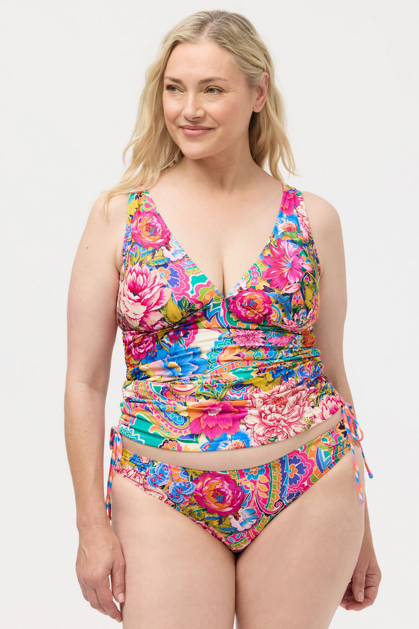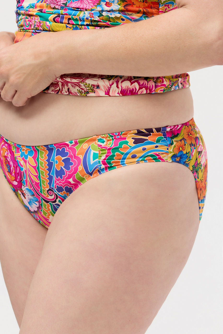 The Crispire Ruched Hipster Bottom offers a flattering fit with soft side ruching and a mid-rise silhouette. Its lively floral and paisley print brings a playful burst of color to your swim ensemble, pairing beautifully with any coordinating top. Designed for comfort and confidence, it’s the perfect blend of coverage and style for sunny days by the water.