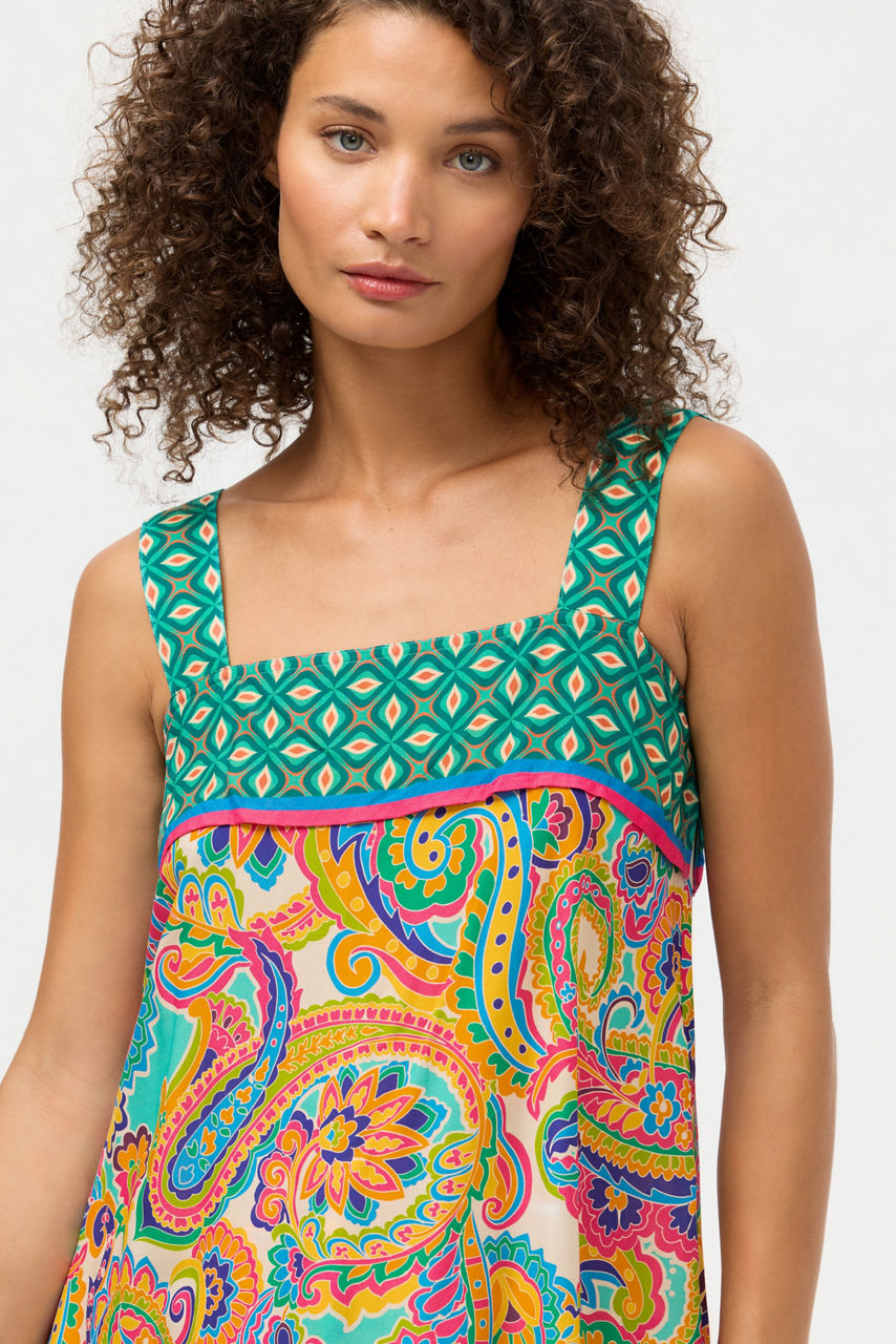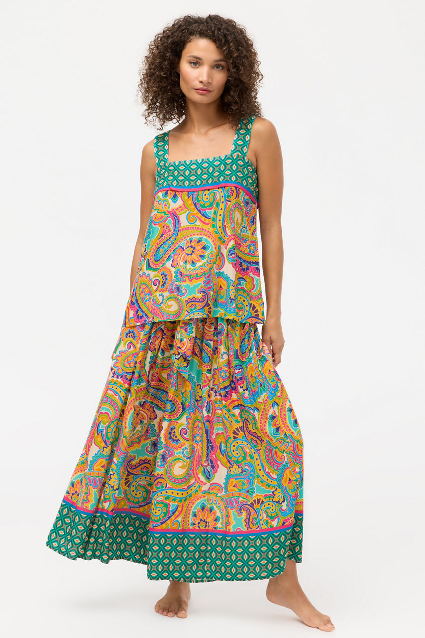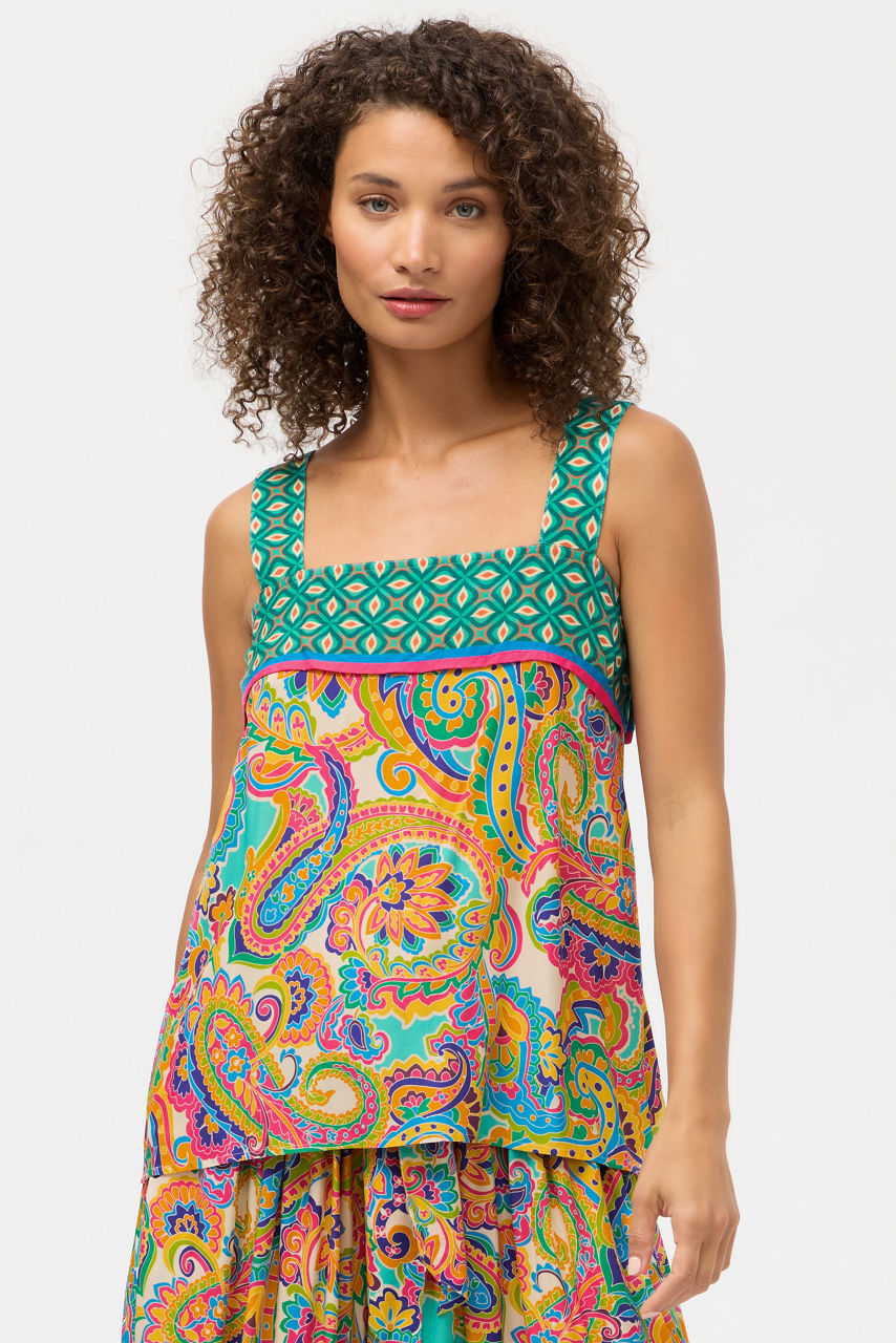 Crafted with warm breezy evenings in mind, the Cristata Cami Top is crafted from a lightweight and flowing fabric. Featuring wide shoulder straps and a relaxed A-line silhouette, this tiered ruffle top is finished with a vibrant paisley print. Pair with the coordinating Cristata Palazzo Cropped Pant for a distinctly feminine resort-ready look.