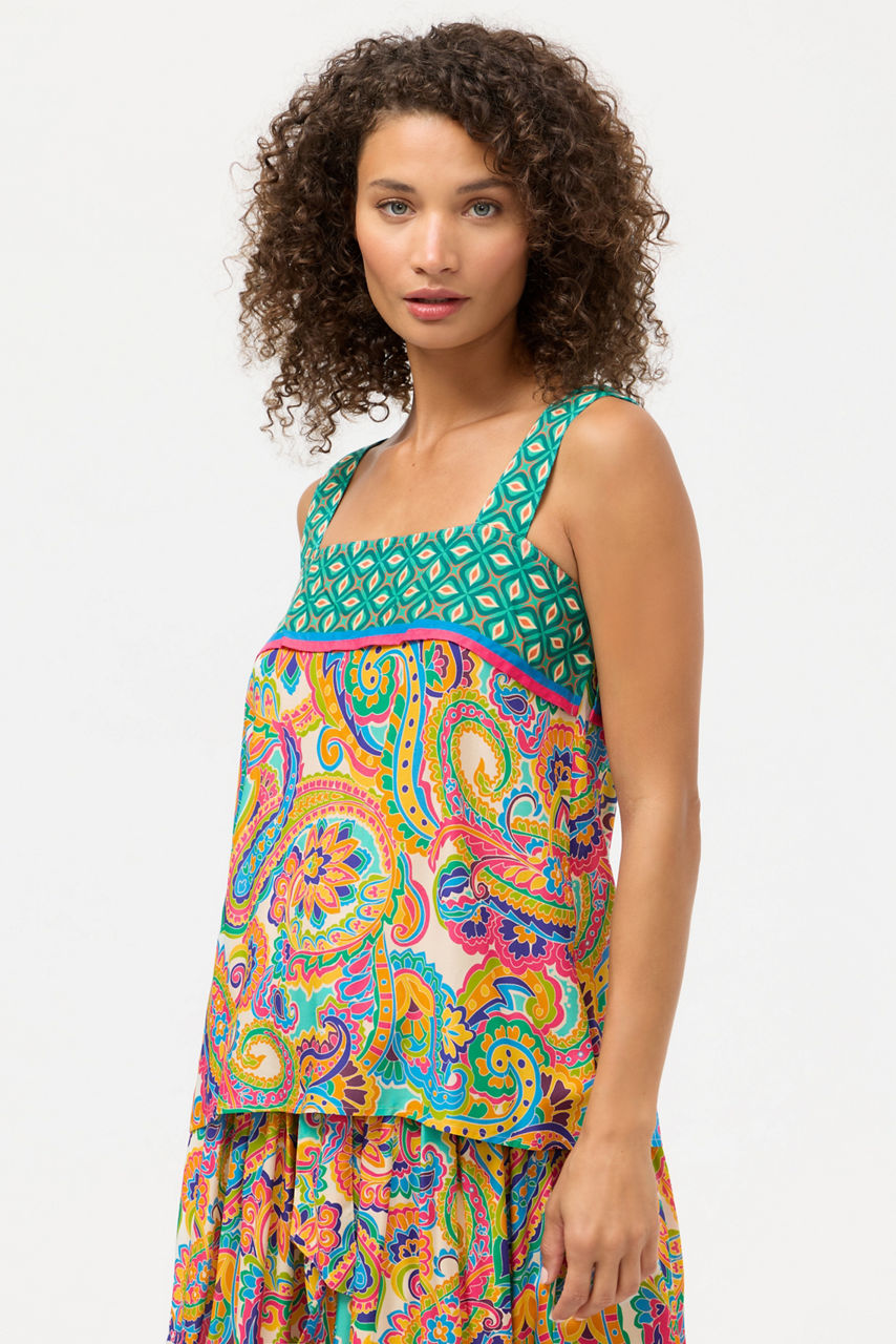 Crafted with warm breezy evenings in mind, the Cristata Cami Top is crafted from a lightweight and flowing fabric. Featuring wide shoulder straps and a relaxed A-line silhouette, this tiered ruffle top is finished with a vibrant paisley print. Pair with the coordinating Cristata Palazzo Cropped Pant for a distinctly feminine resort-ready look.
