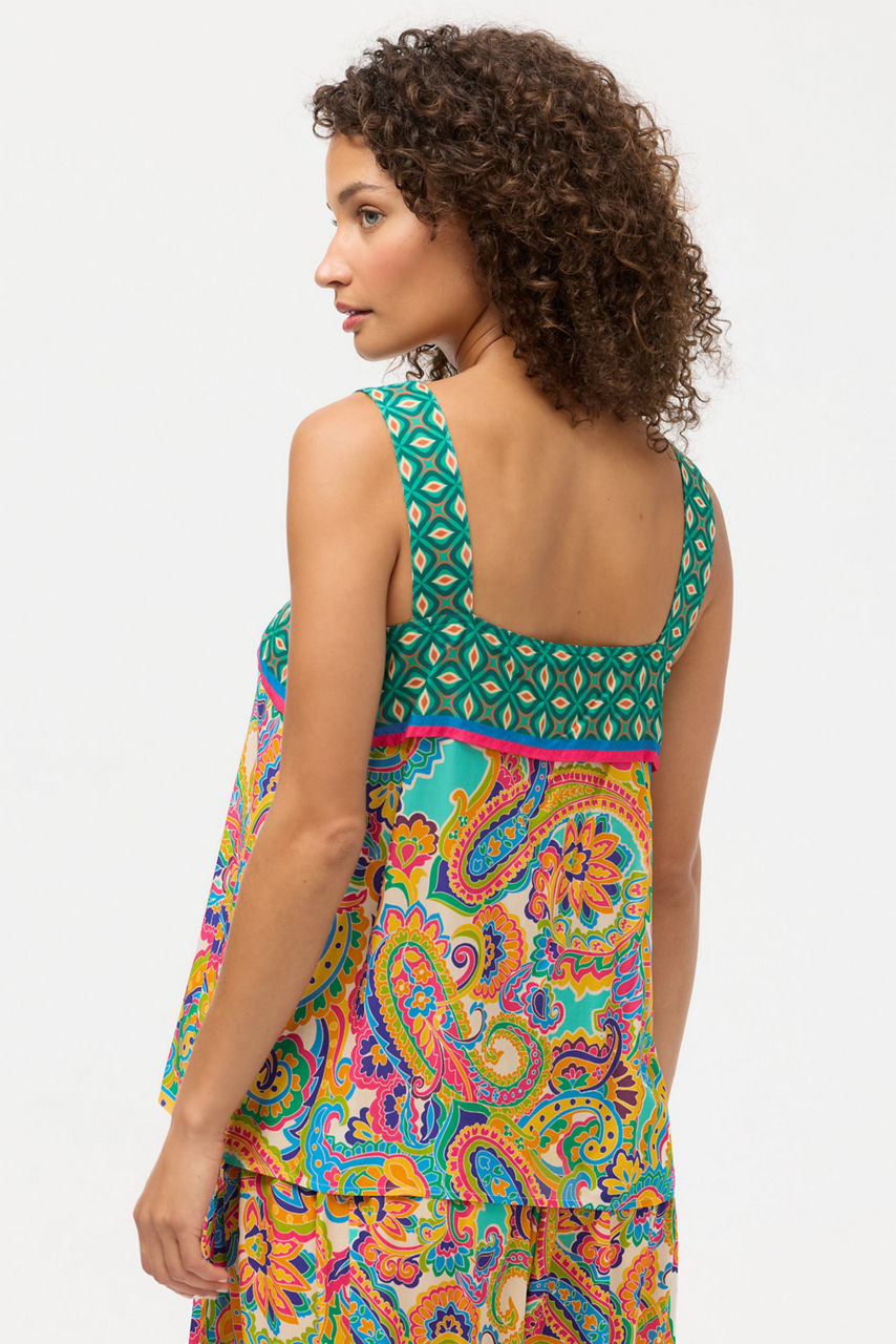 Crafted with warm breezy evenings in mind, the Cristata Cami Top is crafted from a lightweight and flowing fabric. Featuring wide shoulder straps and a relaxed A-line silhouette, this tiered ruffle top is finished with a vibrant paisley print. Pair with the coordinating Cristata Palazzo Cropped Pant for a distinctly feminine resort-ready look.