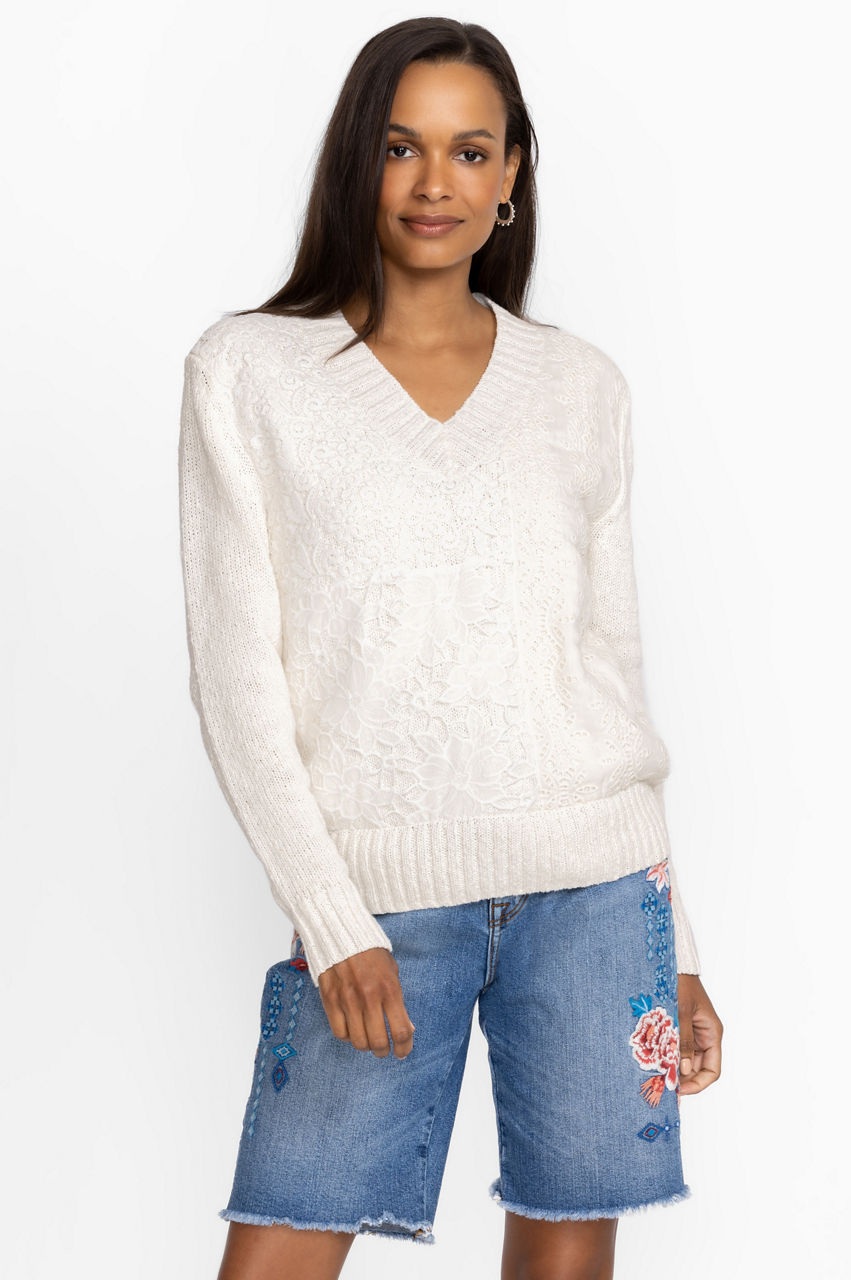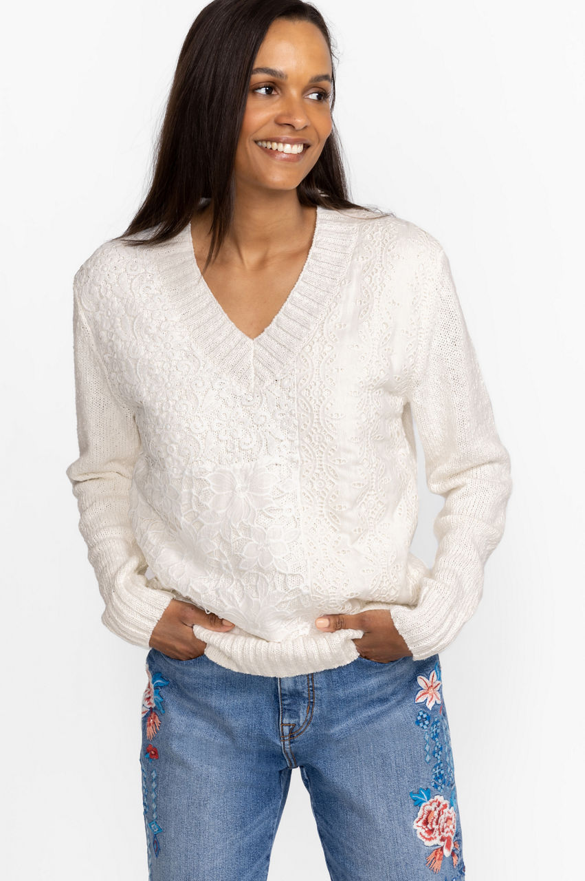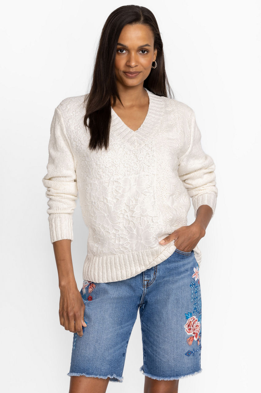Interwoven with a subtle 70s vibe, the Crochet Patched Sweater puts a cheerful spin on a functional cold-weather favorite. A stylish pick for transeasonal days, this sweater is knitted from pure cotton and boasts a V-neck, long sleeves, ribbed edges, and a crochet patchwork design complete with fancy florals for a joyful touch. Layer over a tee and pair with denim or wide-leg pants for a low-key yet playful daytime look.