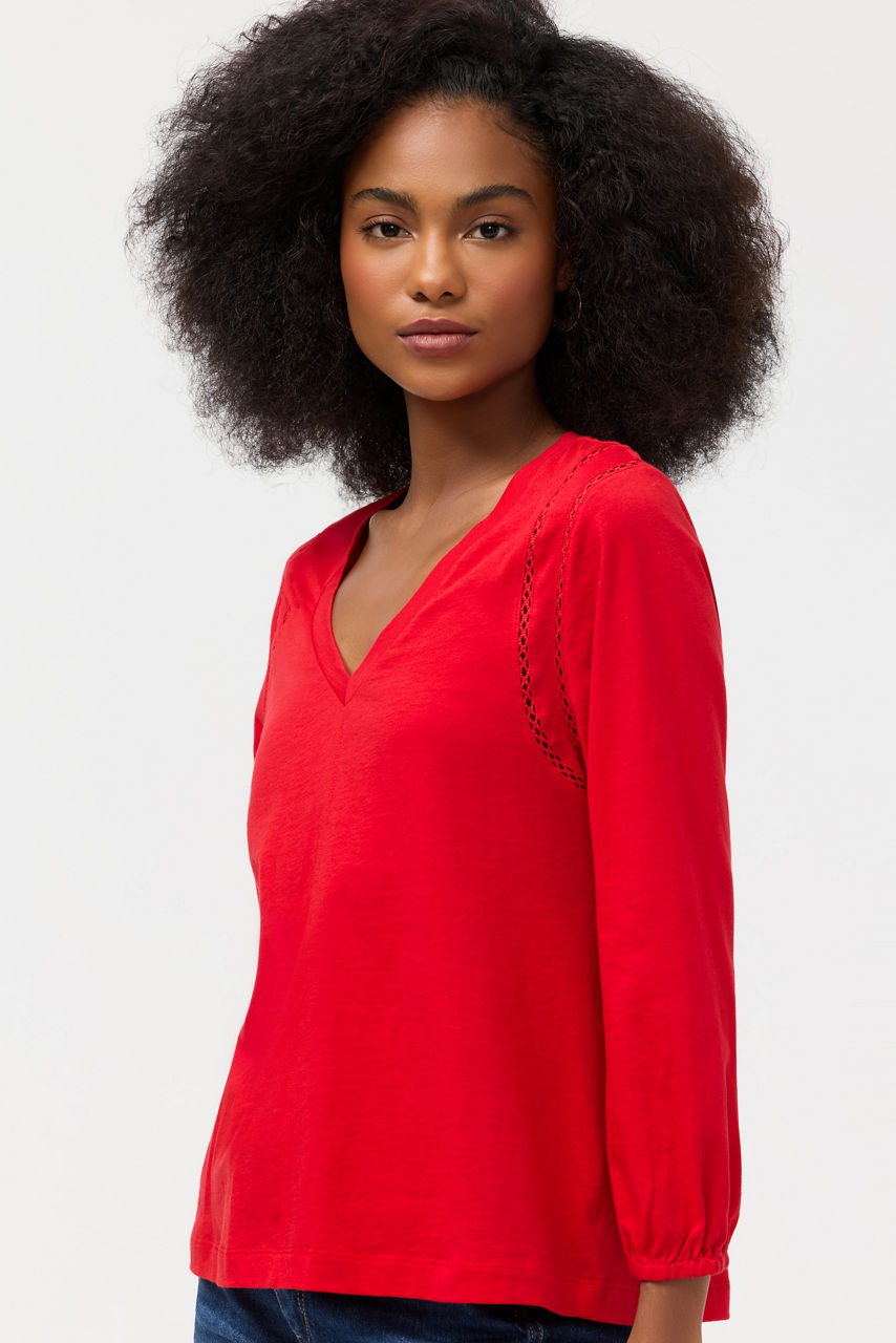 Crafted from breathable 100% cotton, the Crochet V-Neck Blouse offers a fresh take on a classic wardrobe staple. Featuring a V-neckline and bishop sleeves, this lightweight tee is finished with a relaxed bodice and an intricate crochet detail at the shoulders. Pair with linen shorts and casual sandals for a resort-inspired look.