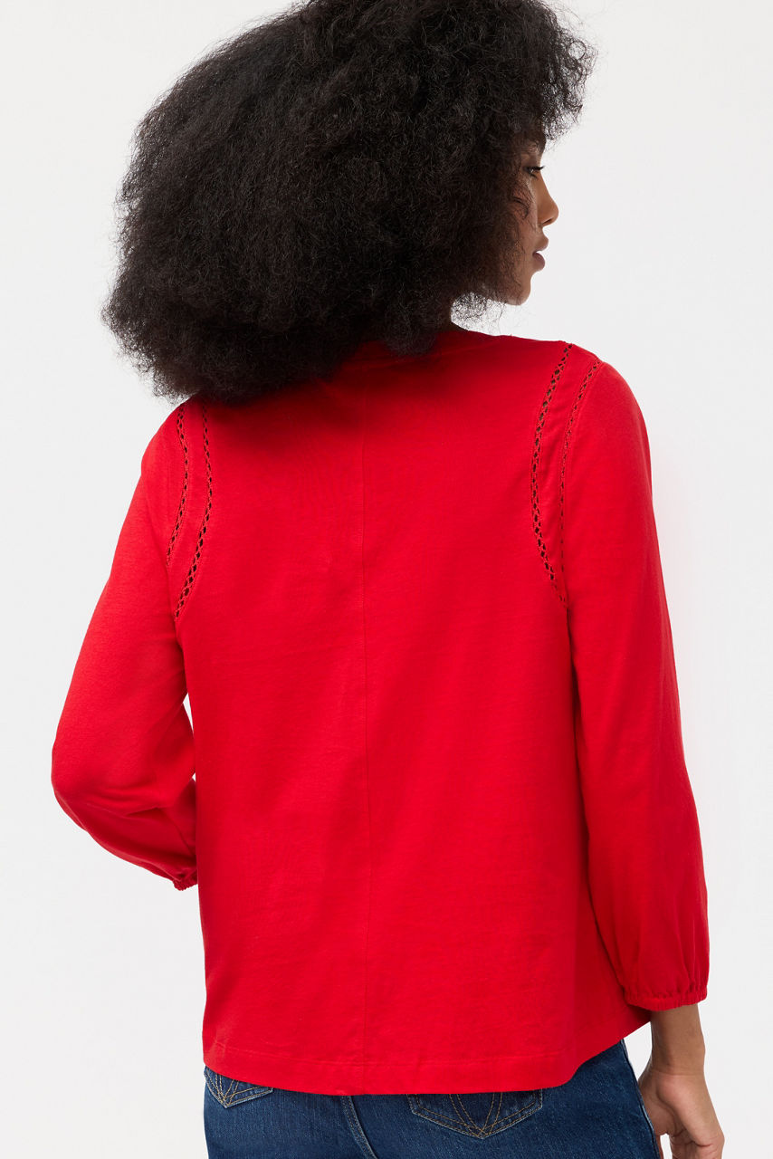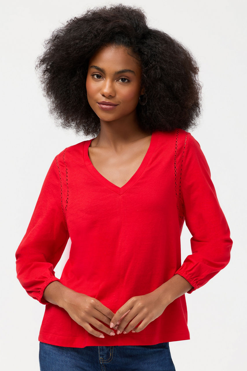 Crafted from breathable 100% cotton, the Crochet V-Neck Blouse offers a fresh take on a classic wardrobe staple. Featuring a V-neckline and bishop sleeves, this lightweight tee is finished with a relaxed bodice and an intricate crochet detail at the shoulders. Pair with linen shorts and casual sandals for a resort-inspired look.