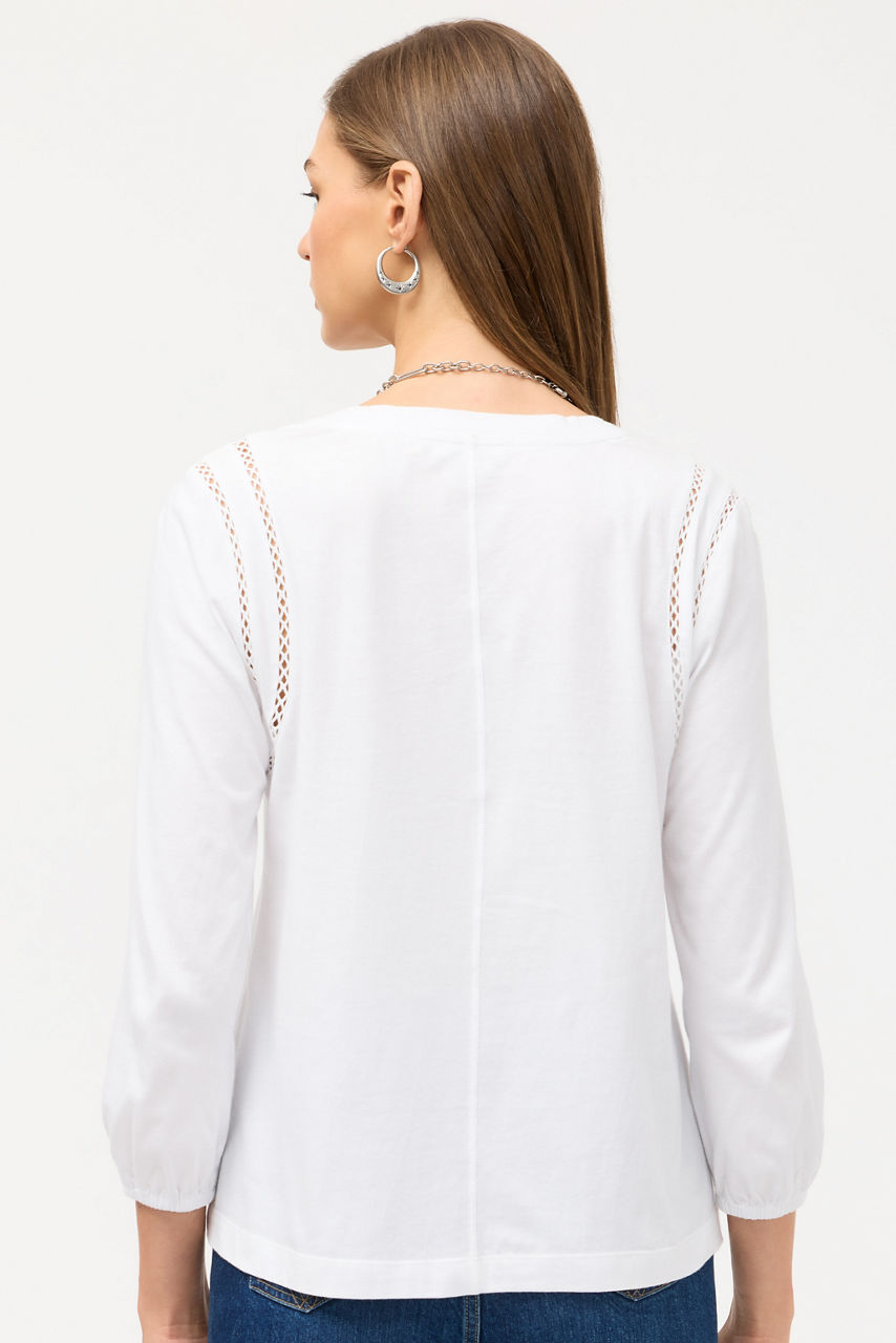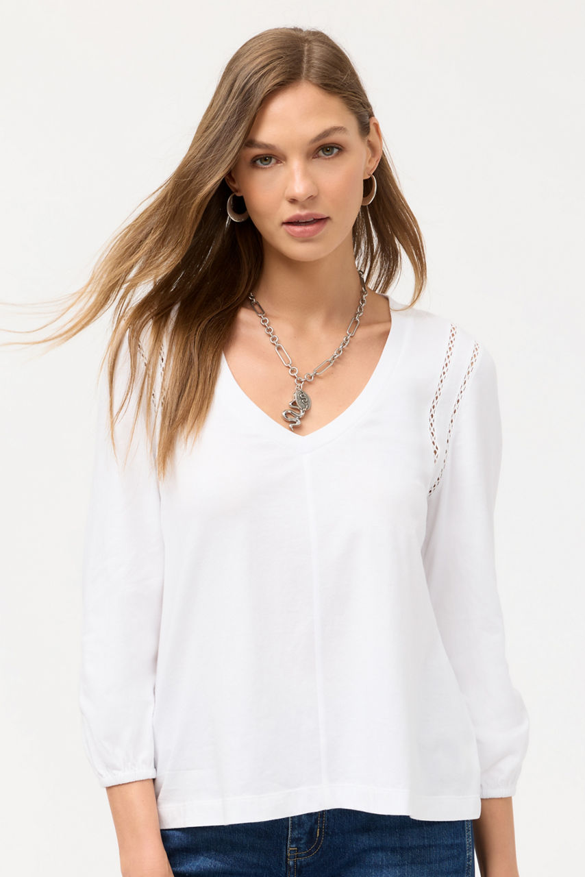 Crafted from breathable 100% cotton, the Crochet V-Neck Blouse offers a fresh take on a classic wardrobe staple. Featuring a V-neckline and bishop sleeves, this lightweight tee is finished with a relaxed bodice and an intricate crochet detail at the shoulders. Pair with linen shorts and casual sandals for a resort-inspired look.
