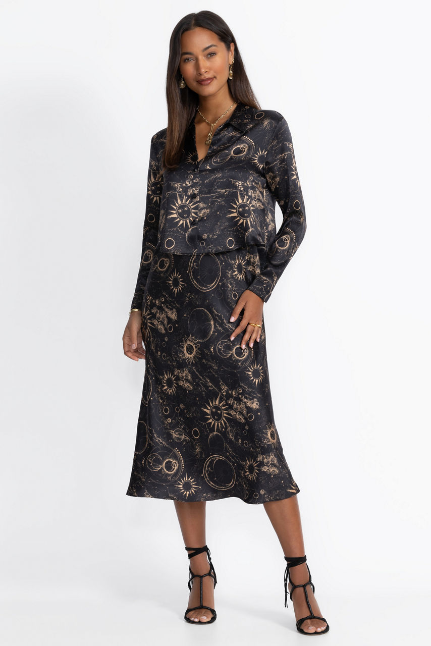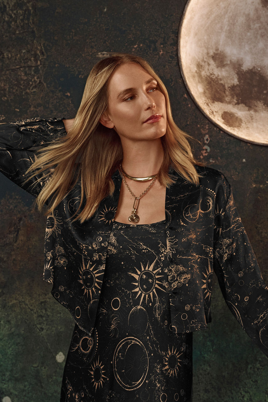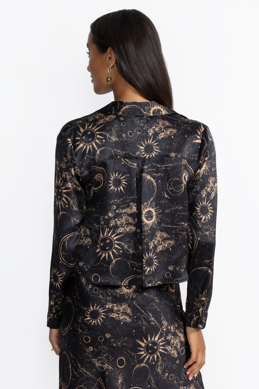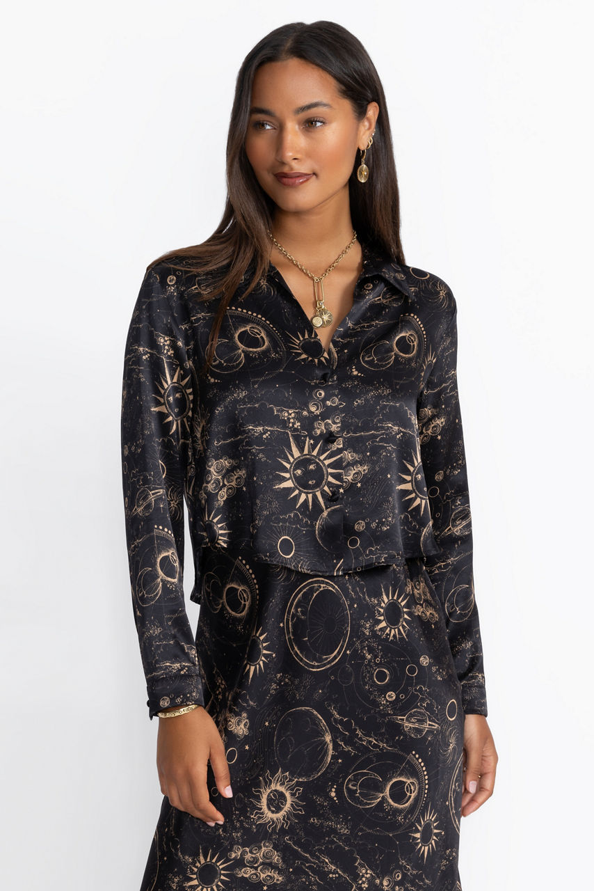 Crafted from 100% flowing silk, the Cropped Overshirt is adorned with a vivid eye-catching pattern. Featuring a collared button-front and cropped length, this unique blouse is finished with a curved hem and a stunning gold pattern emblazoned on a rich black backdrop. Pair with a gold tone skirt and black cami top for an unforgettable evening look.