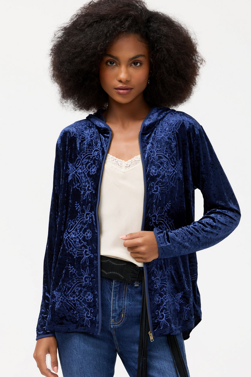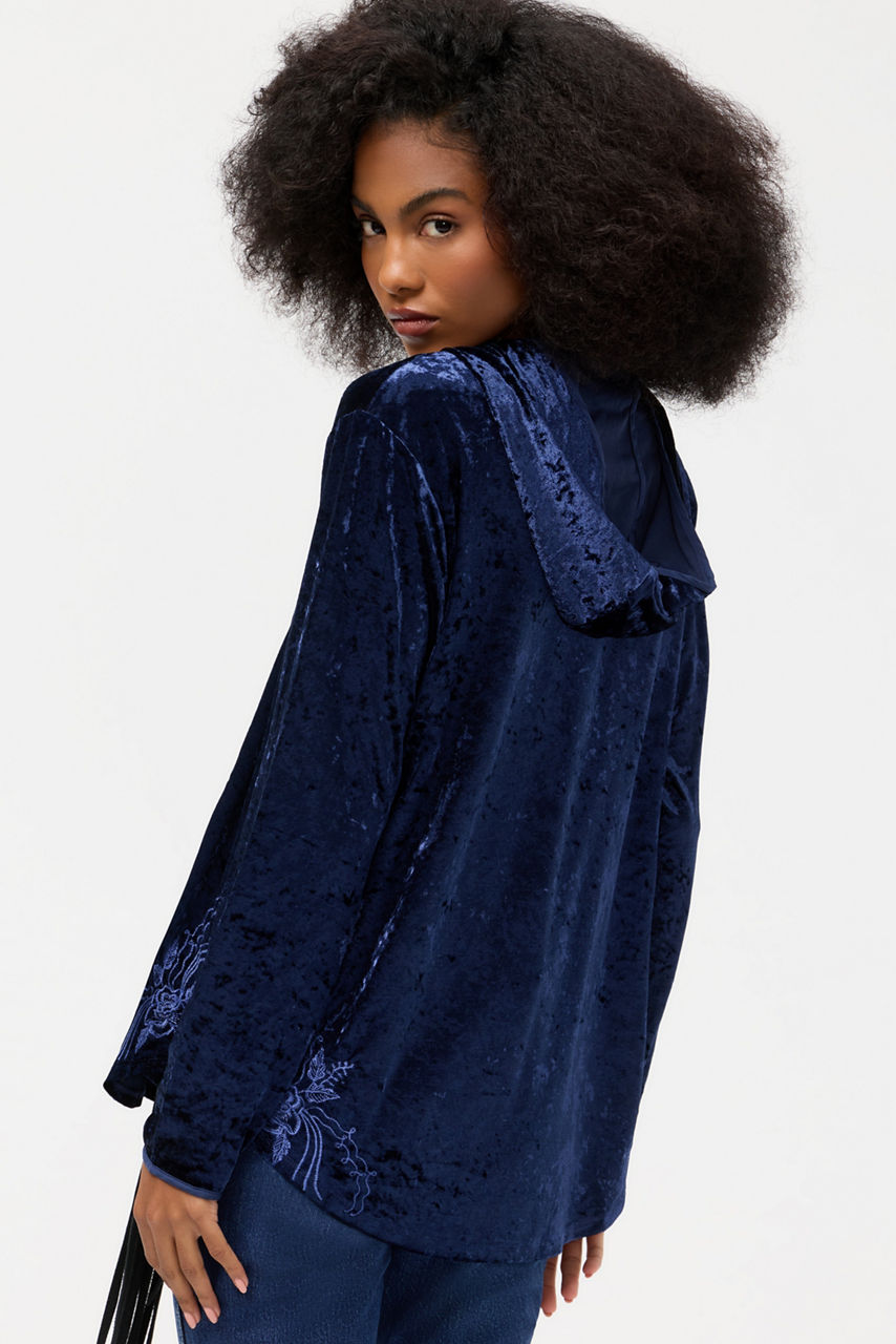 Beautifully crafted from a stretch velvet fabric, the Crushed Velvet Pull On Hoodie features intricately embroidered floral patterns. Designed with a partial button front and an attached hood, this cozy pullover is finished with side slits and a curved hemline. Pair with the Crushed Velvet Joggers and fashion sneakers for a cozy casual look.